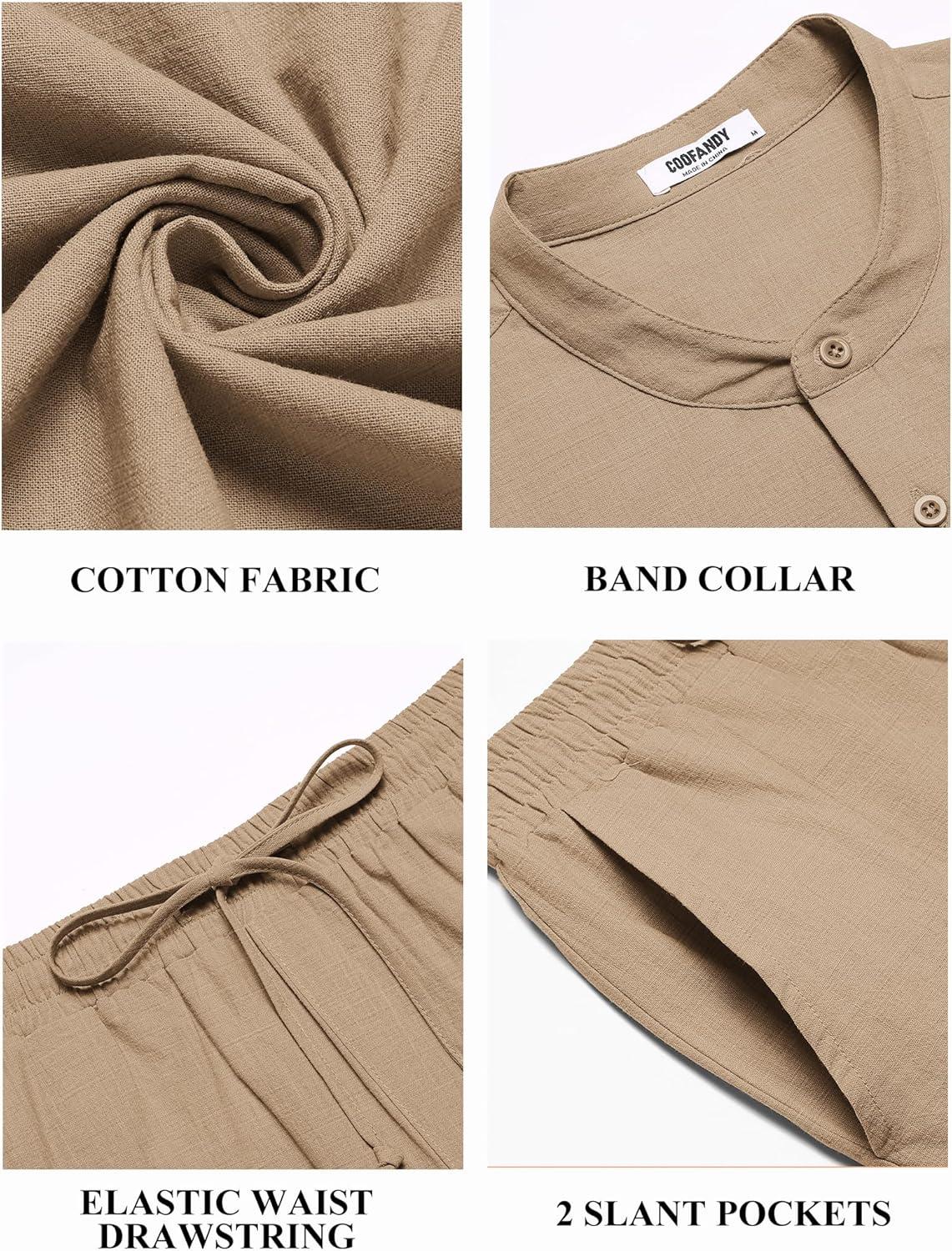 COOFANDY Men’s 2 Pieces Cotton Linen Set Casual Short Sleeve Henley Shirts Beach Yoga Pants Summer Outfits(Khaki)