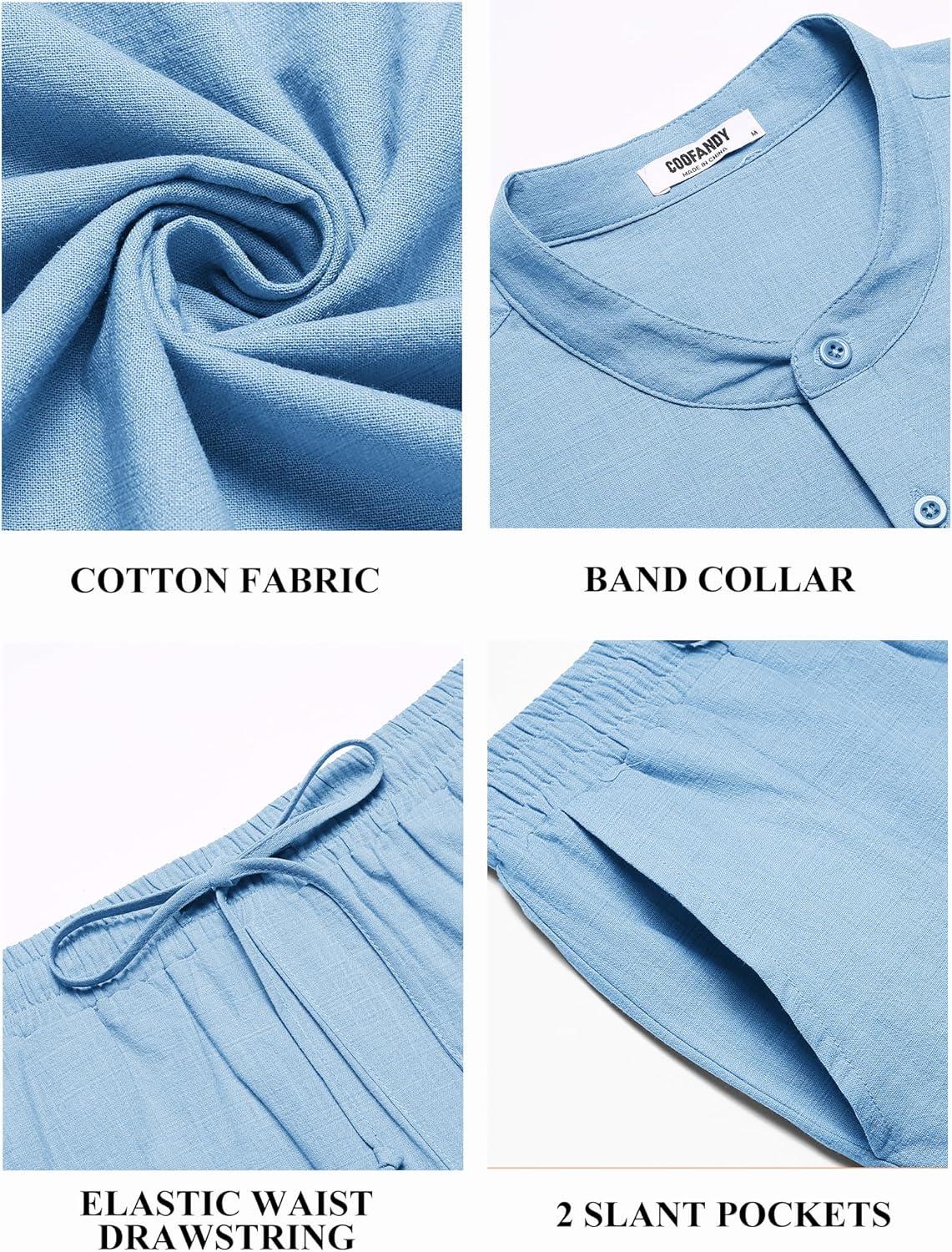 COOFANDY Men’s 2 Pieces Cotton Linen Set Casual Short Sleeve Henley Shirts Beach Yoga Pants Summer Outfits(Light Blue)