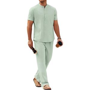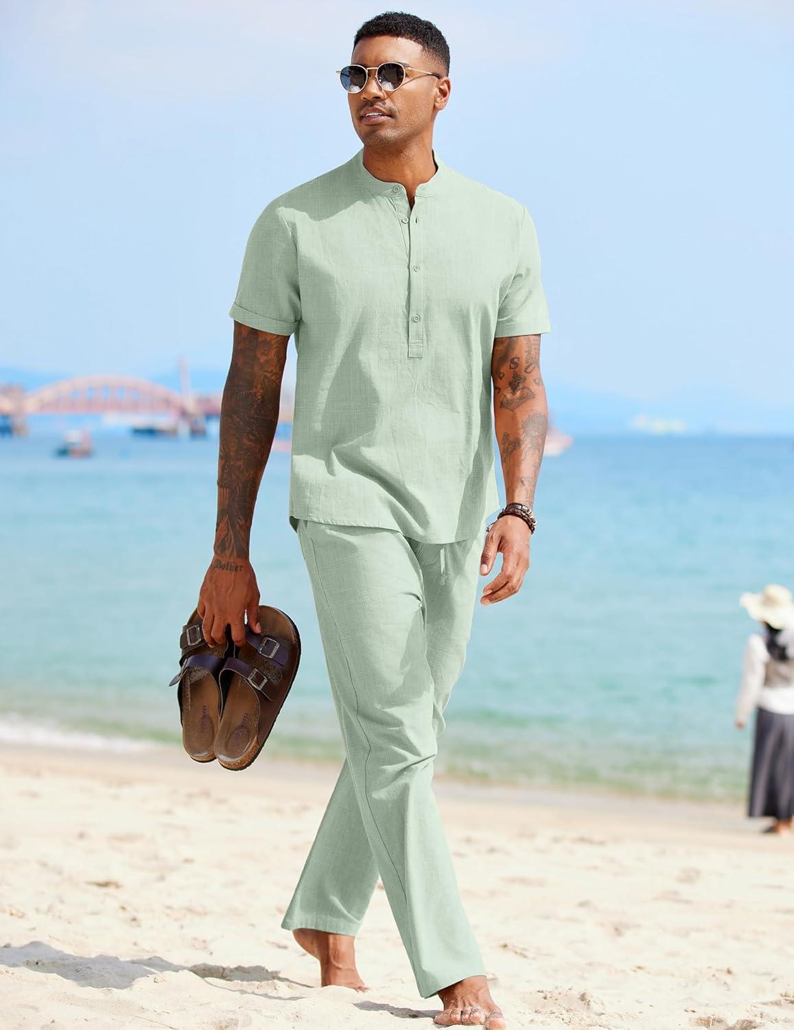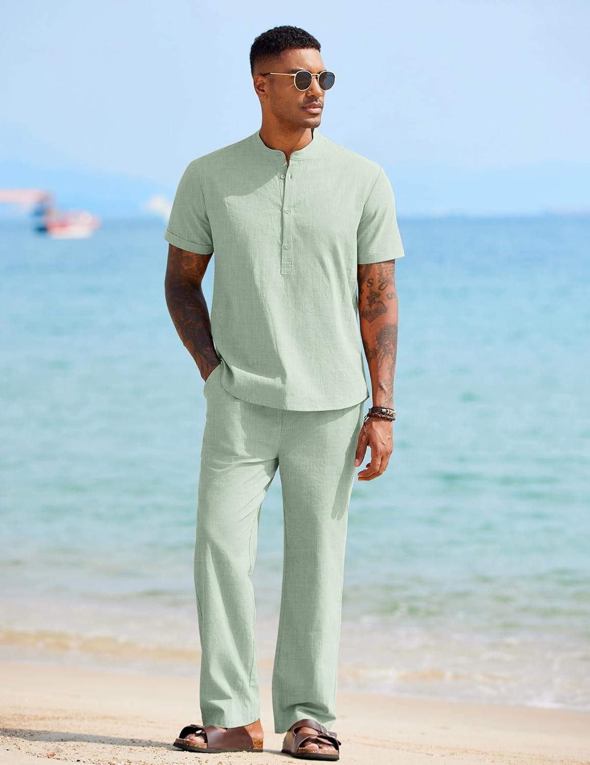 COOFANDY Mens 2 Pieces Cotton Linen Sets Short Sleeve Casual Henley Shirt Summer Beach Pants Lounge Vacation Outfits Set(Light Green)
