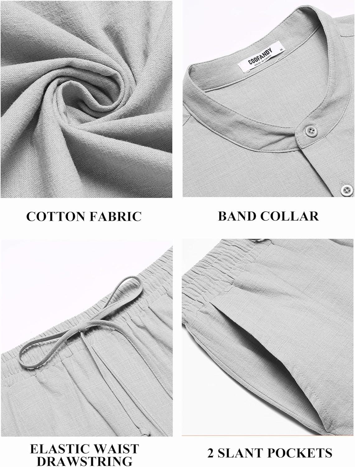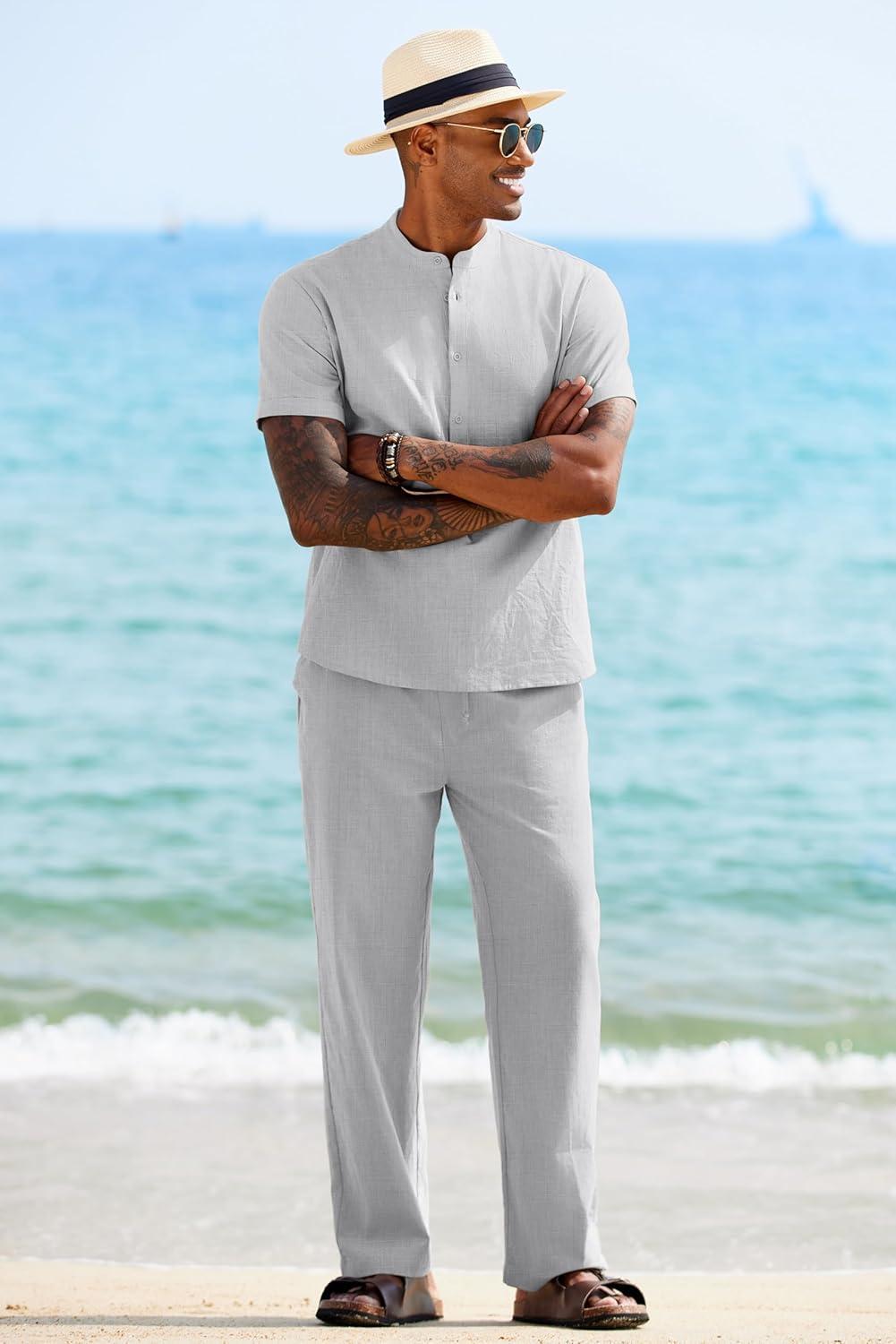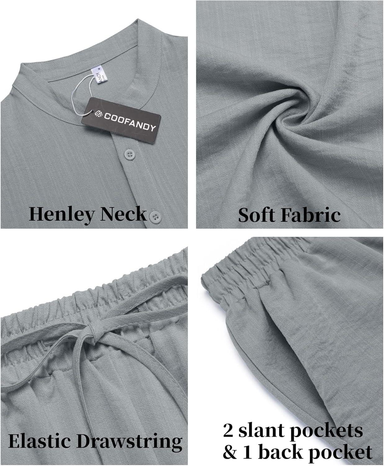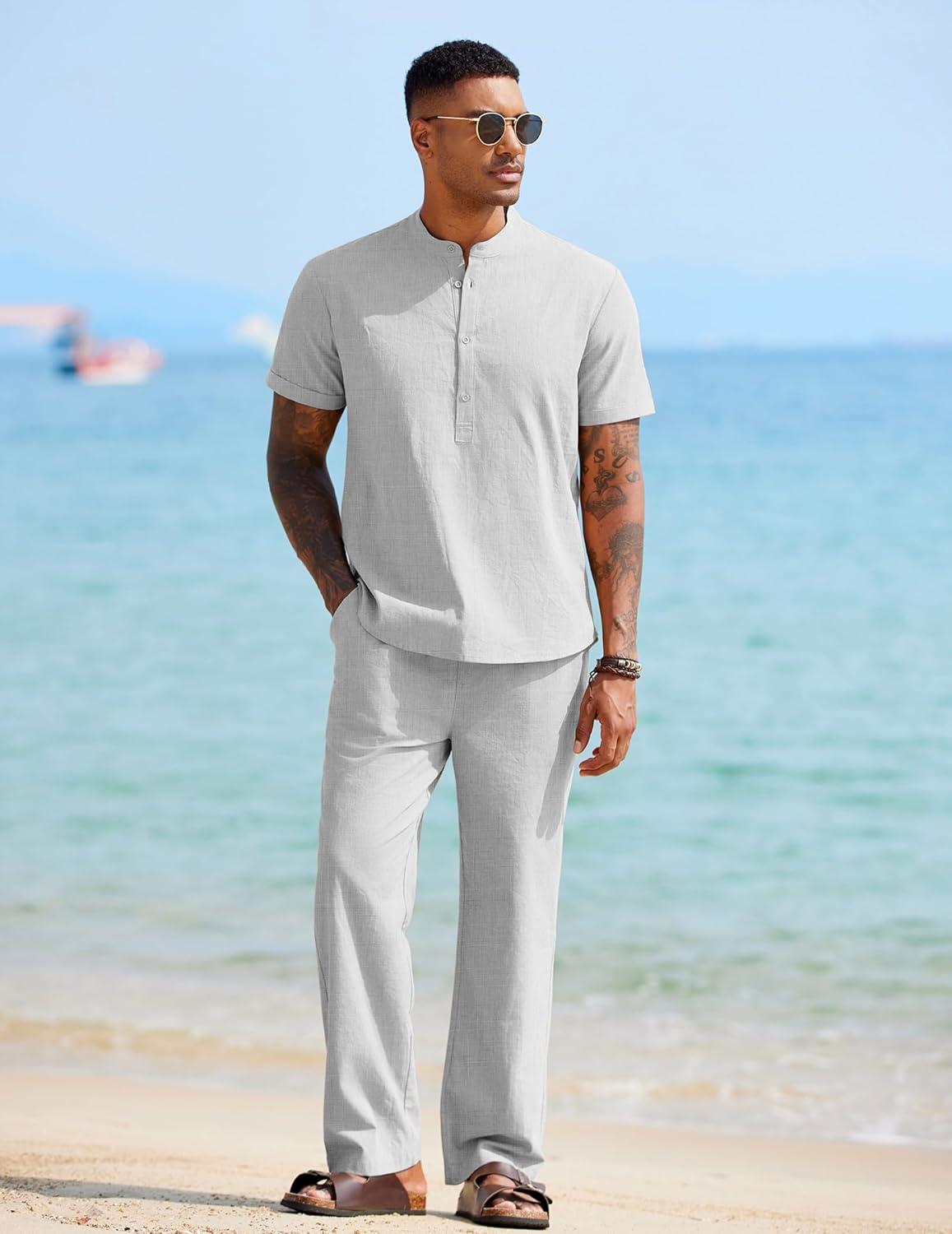 COOFANDY Mens 2 Pieces Cotton Linen Sets Short Sleeve Casual Henley Shirt Summer Beach Pants Lounge Vacation Outfits Set(Light Grey)