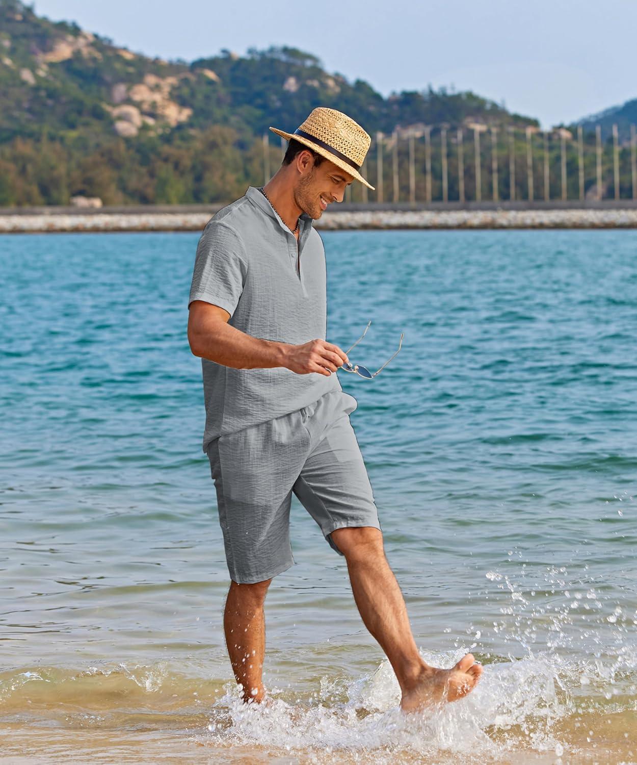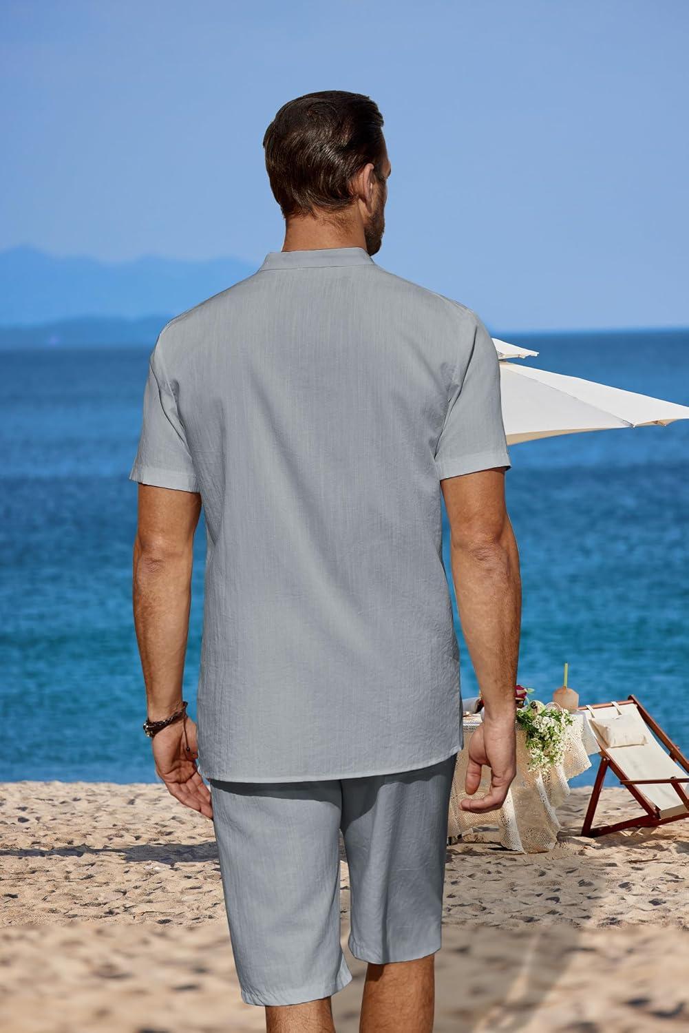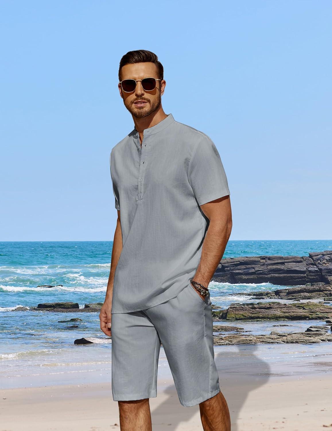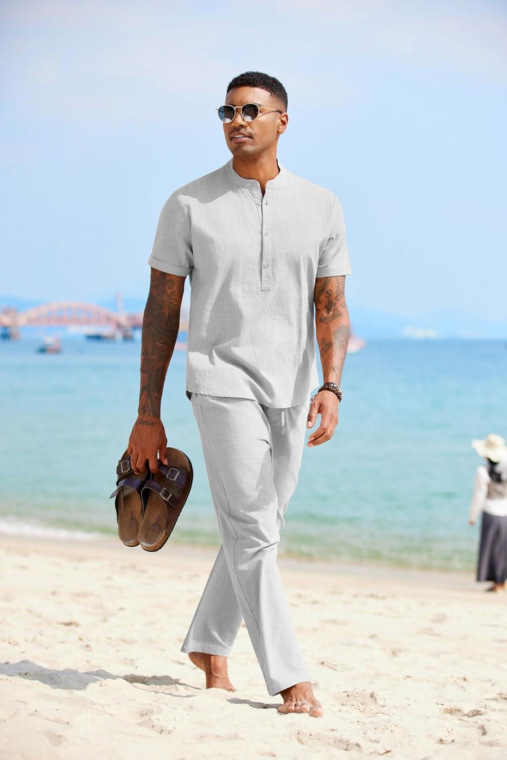 COOFANDY Mens 2 Pieces Cotton Linen Sets Short Sleeve Casual Henley Shirt Summer Beach Pants Lounge Vacation Outfits Set(Light Grey)