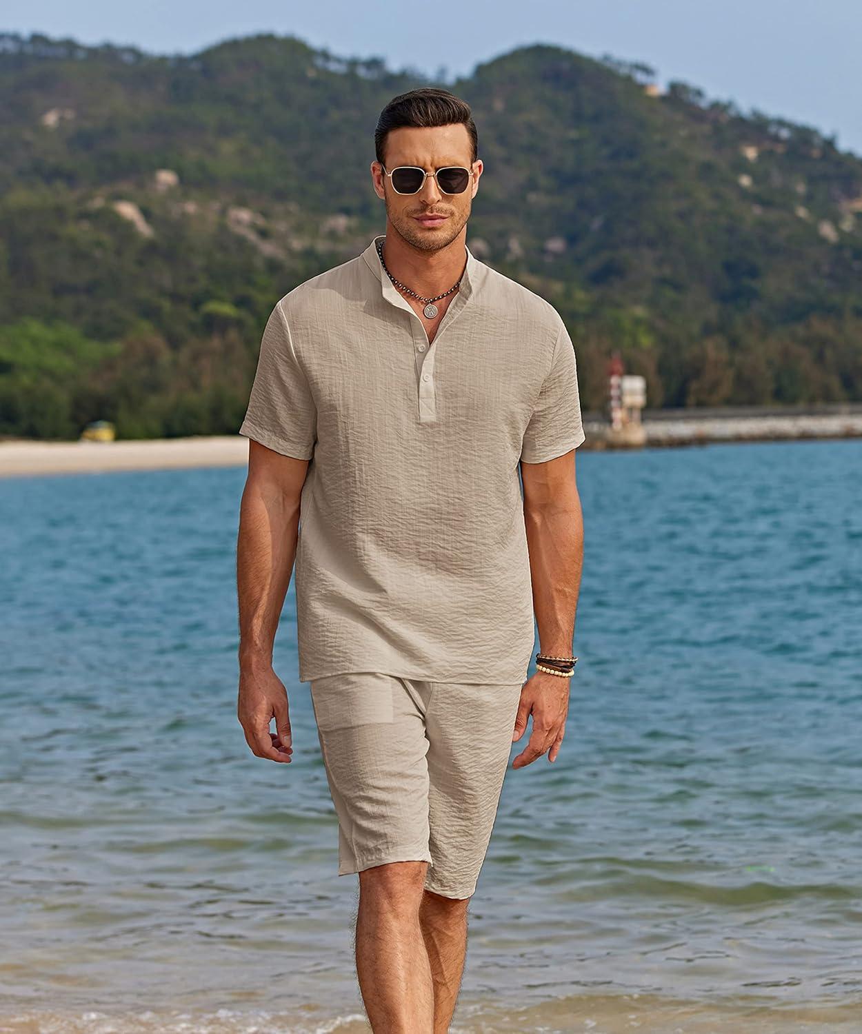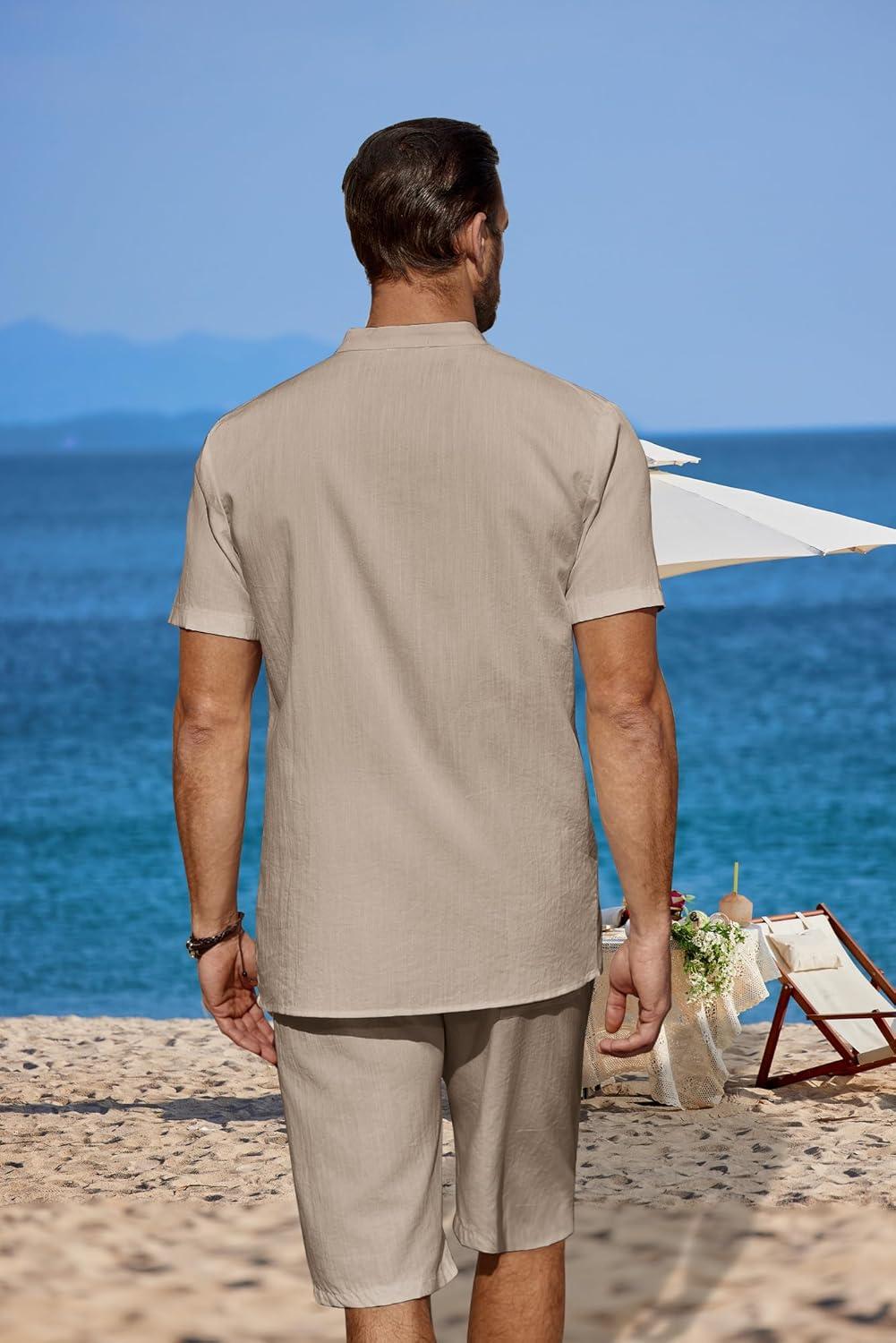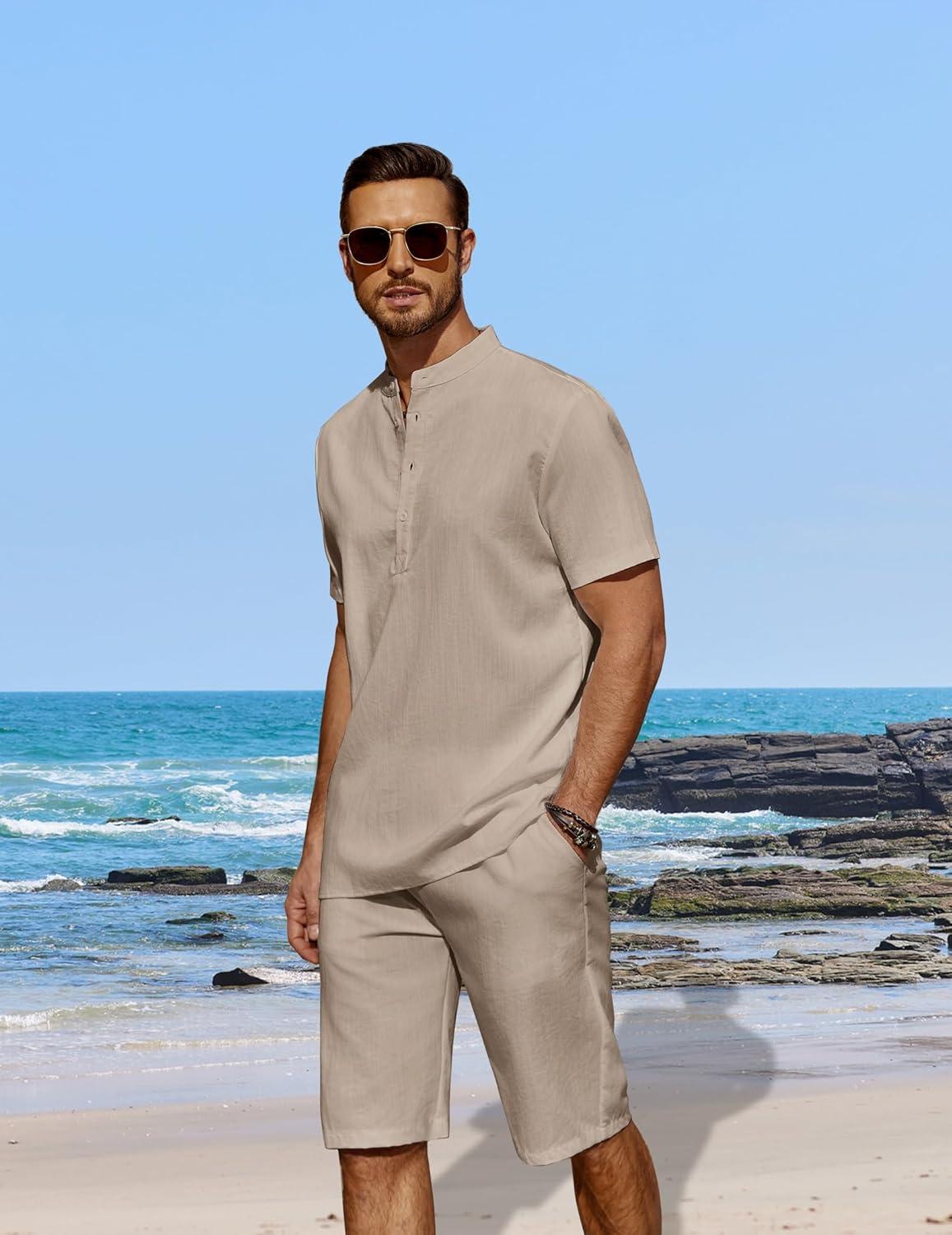 COOFANDY Men’s 2 Pieces Linen Set Casual Henley Shirts Short Sleeve Beach Yoga Shorts Summer Pants Outfits(Light Khaki)