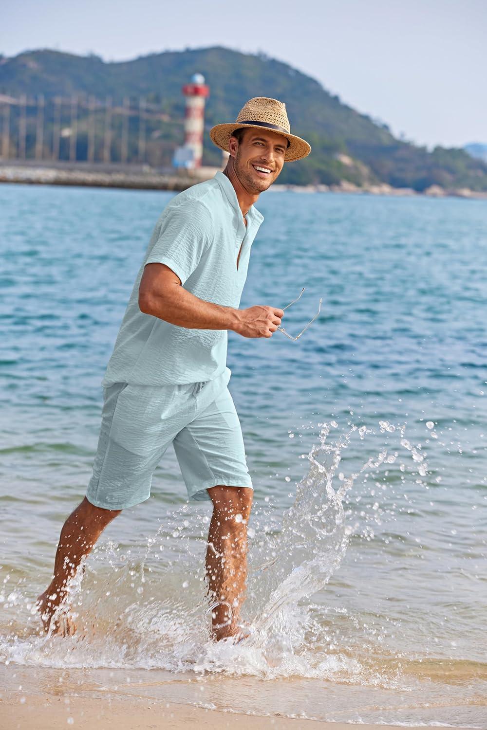 COOFANDY Mens 2 Pieces Cotton Linen Sets Short Sleeve Casual Henley Shirt Summer Beach Pants Lounge Vacation Outfits Set(Light Blue)