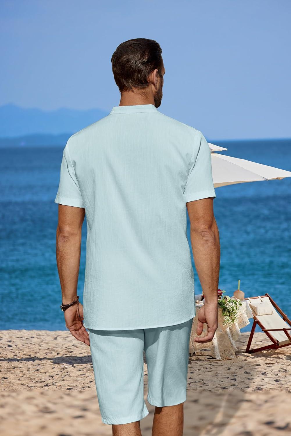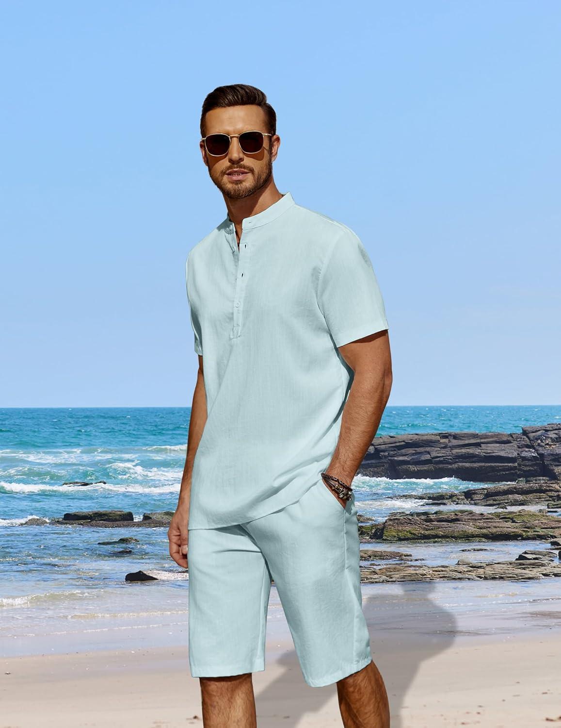 COOFANDY Men’s 2 Pieces Linen Set Casual Henley Shirts Short Sleeve Beach Yoga Shorts Summer Pants Outfits(Light Blue)