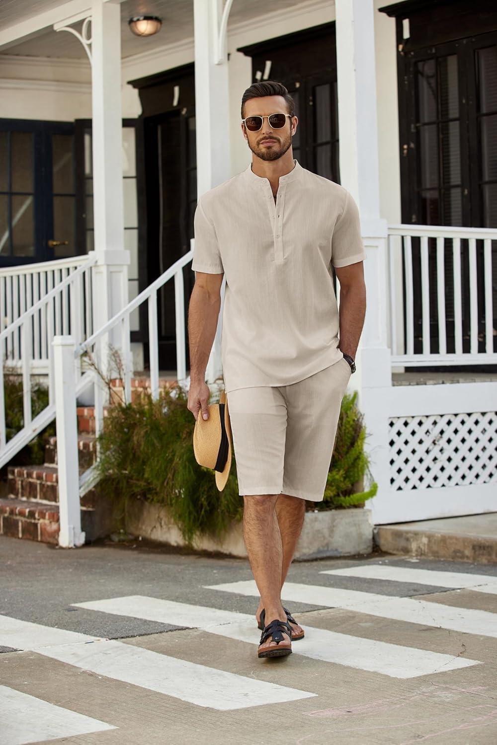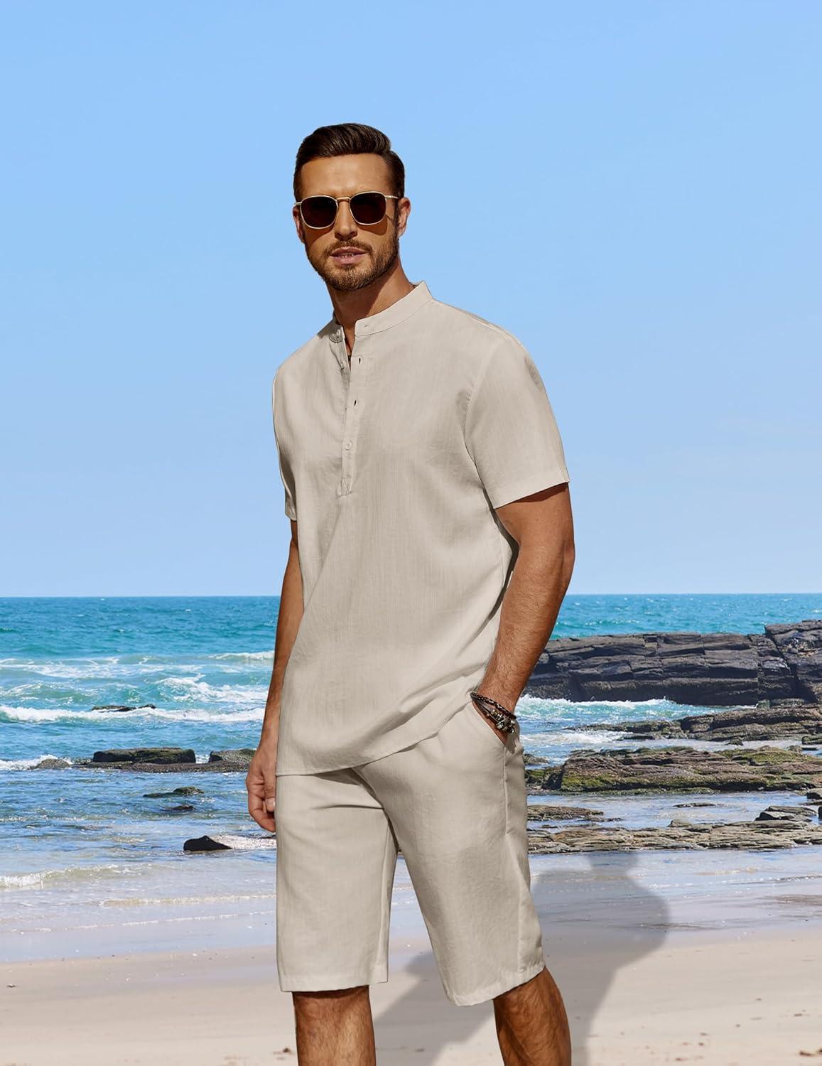 COOFANDY Men’s 2 Pieces Linen Set Casual Henley Shirts Short Sleeve Beach Yoga Shorts Summer Pants Outfits(Beige)