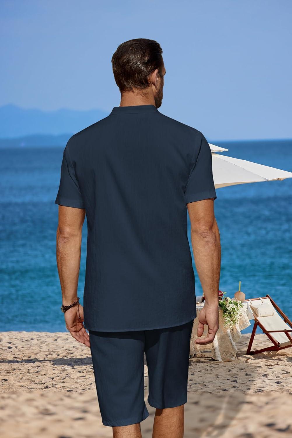 COOFANDY Mens 2 Pieces Cotton Linen Sets Short Sleeve Casual Henley Shirt Summer Beach Pants Lounge Vacation Outfits Set(Navy Blue)