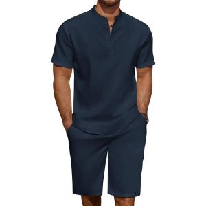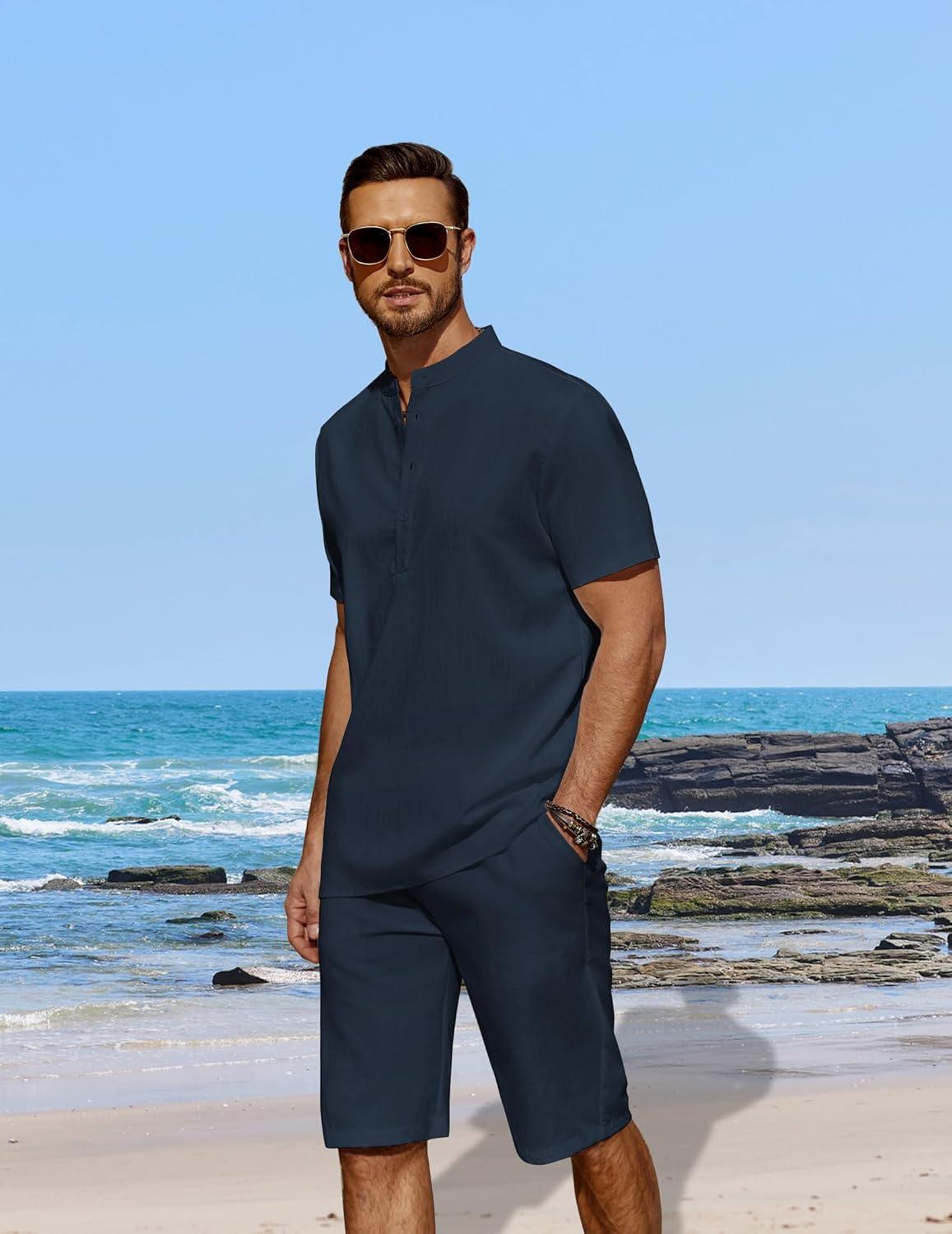 COOFANDY Men’s 2 Pieces Linen Set Casual Henley Shirts Short Sleeve Beach Yoga Shorts Summer Pants Outfits(Dark Blue)