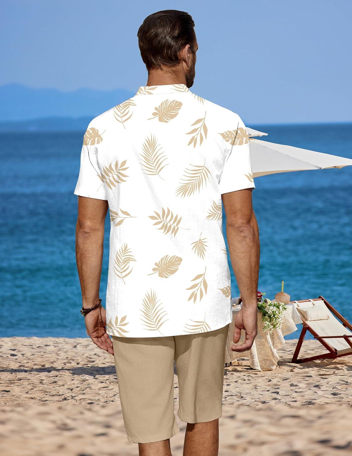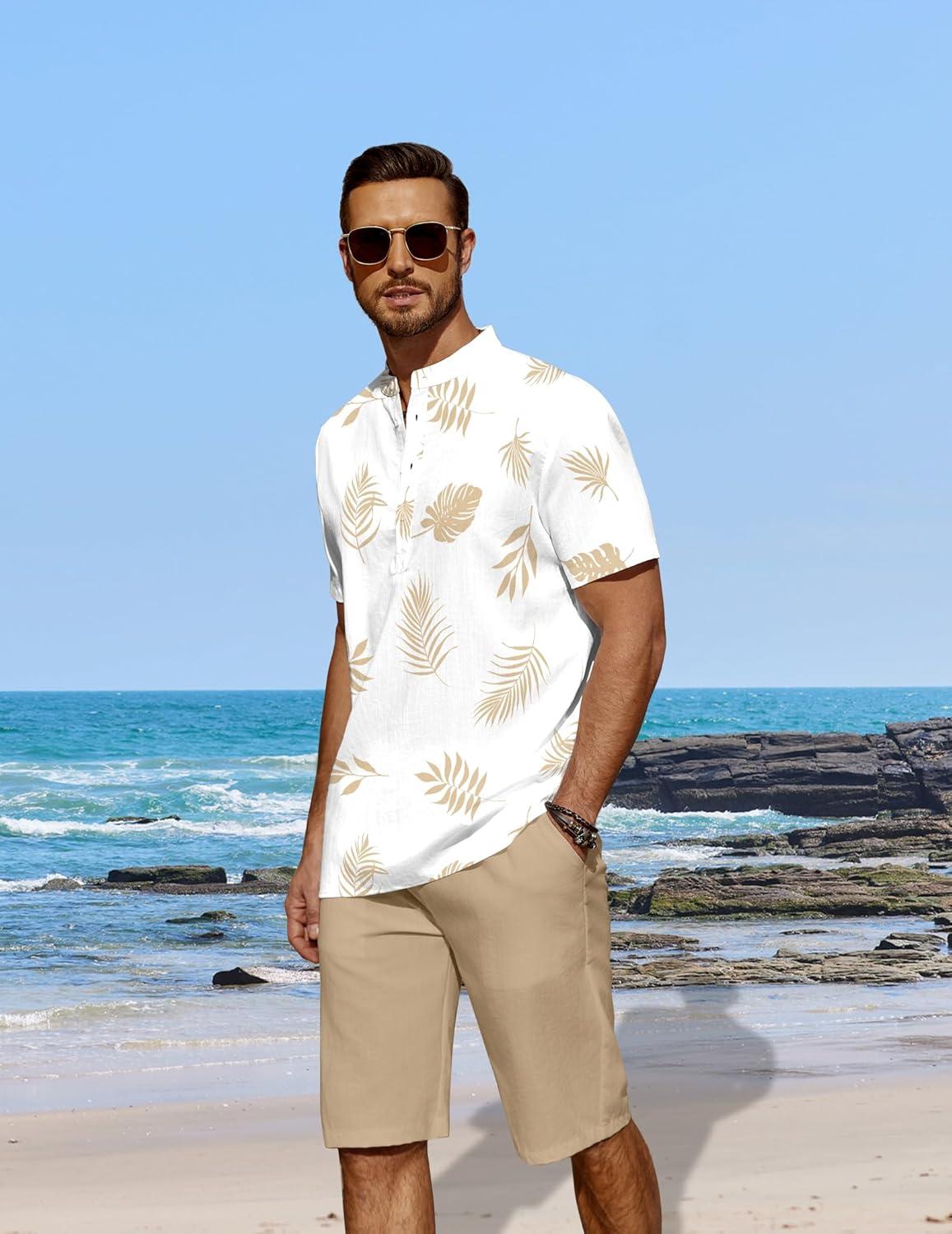 COOFANDY Men’s 2 Pieces Linen Set Casual Henley Shirts Short Sleeve Beach Yoga Shorts Summer Pants Outfits(Palm Pattern)
