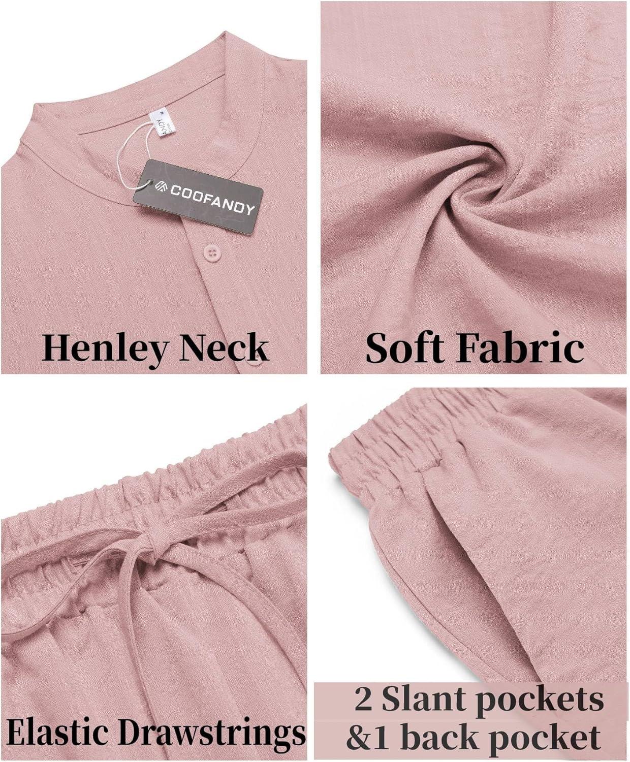 COOFANDY Men’s 2 Pieces Cotton Linen Set Casual Short Sleeve Henley Shirts Beach Yoga Pants Summer Outfits(Pink)