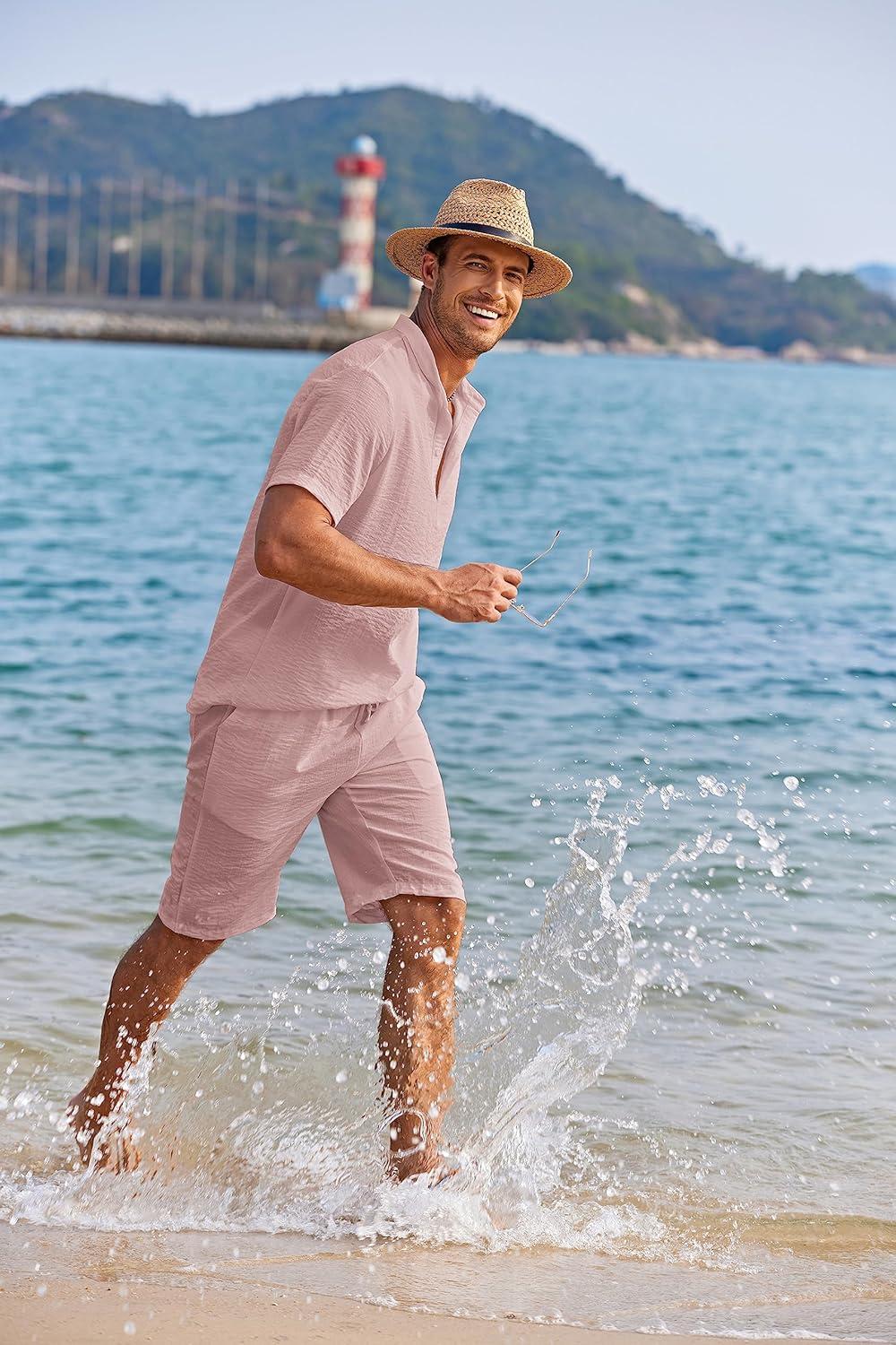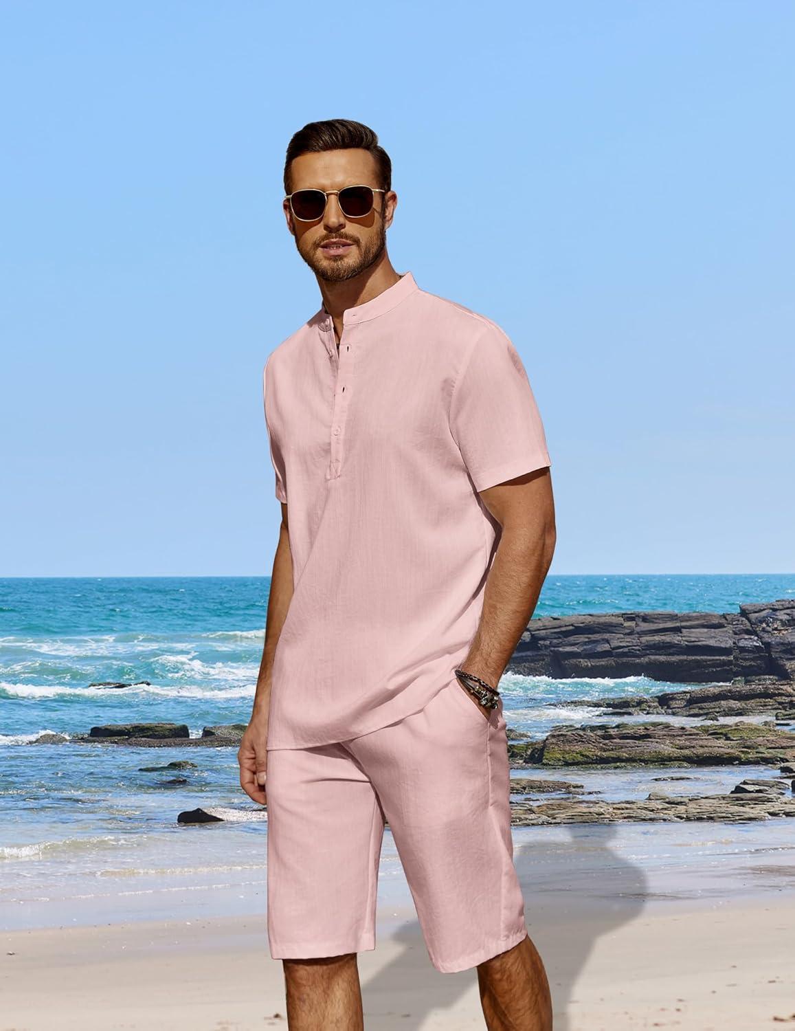 COOFANDY Men’s 2 Pieces Linen Set Casual Henley Shirts Short Sleeve Beach Yoga Shorts Summer Pants Outfits(Pink)