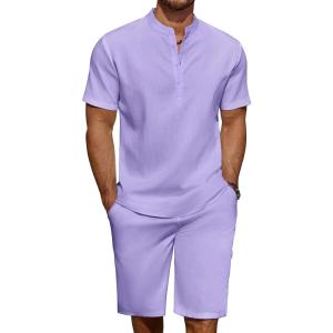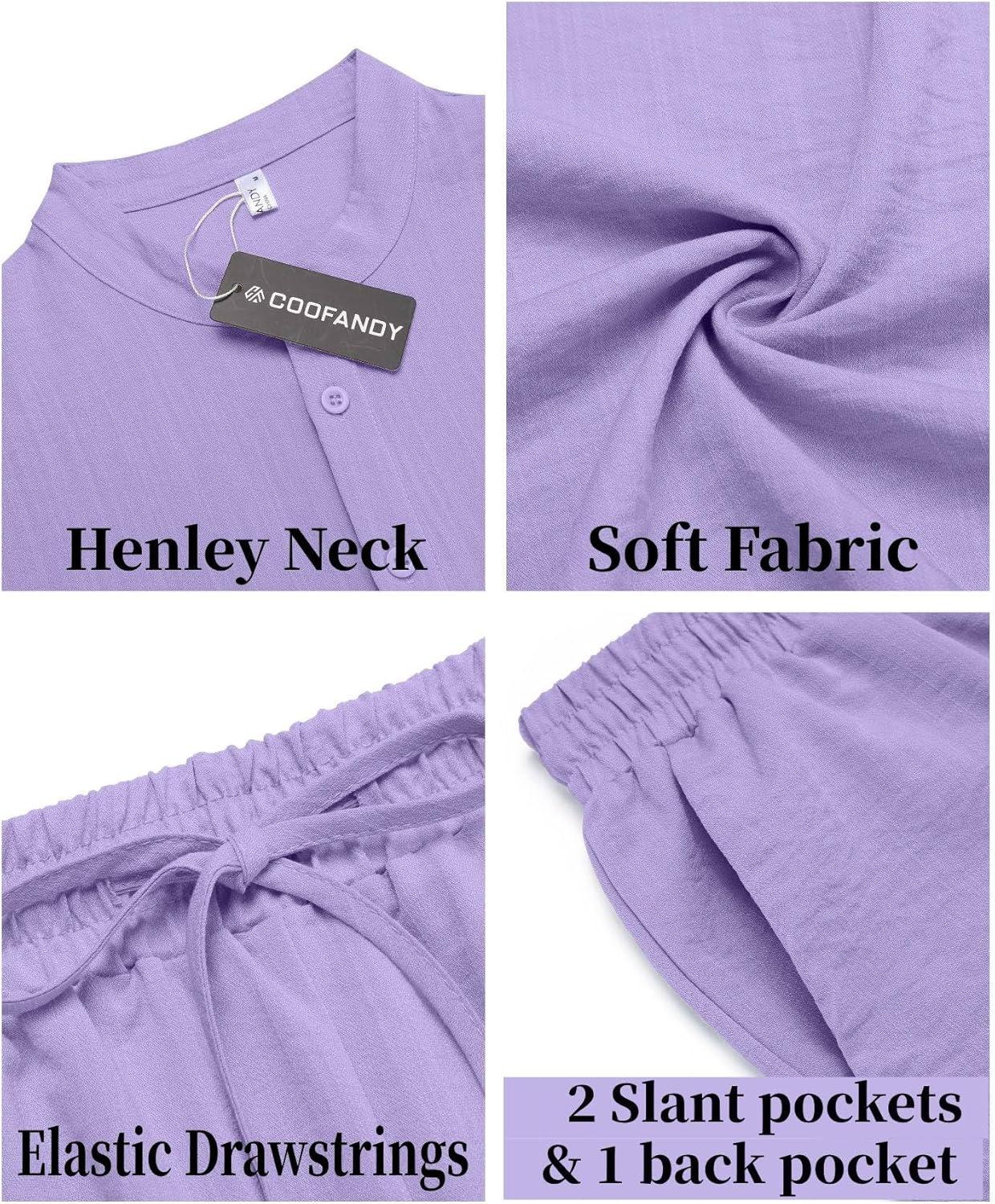 COOFANDY Men’s 2 Pieces Linen Set Casual Henley Shirts Short Sleeve Beach Yoga Shorts Summer Pants Outfits(Purple)