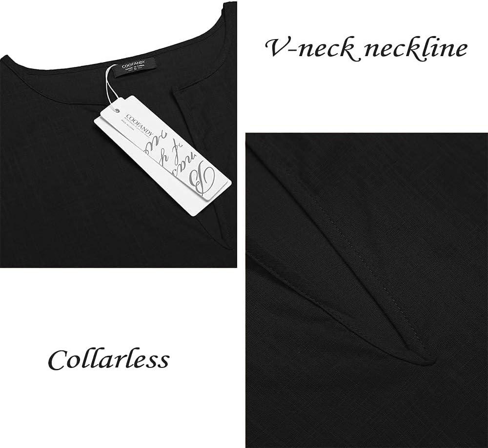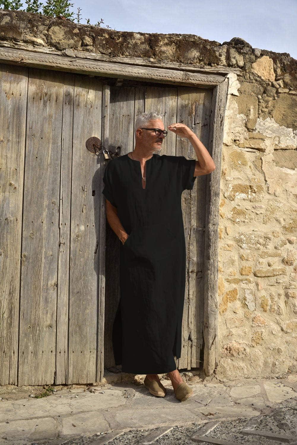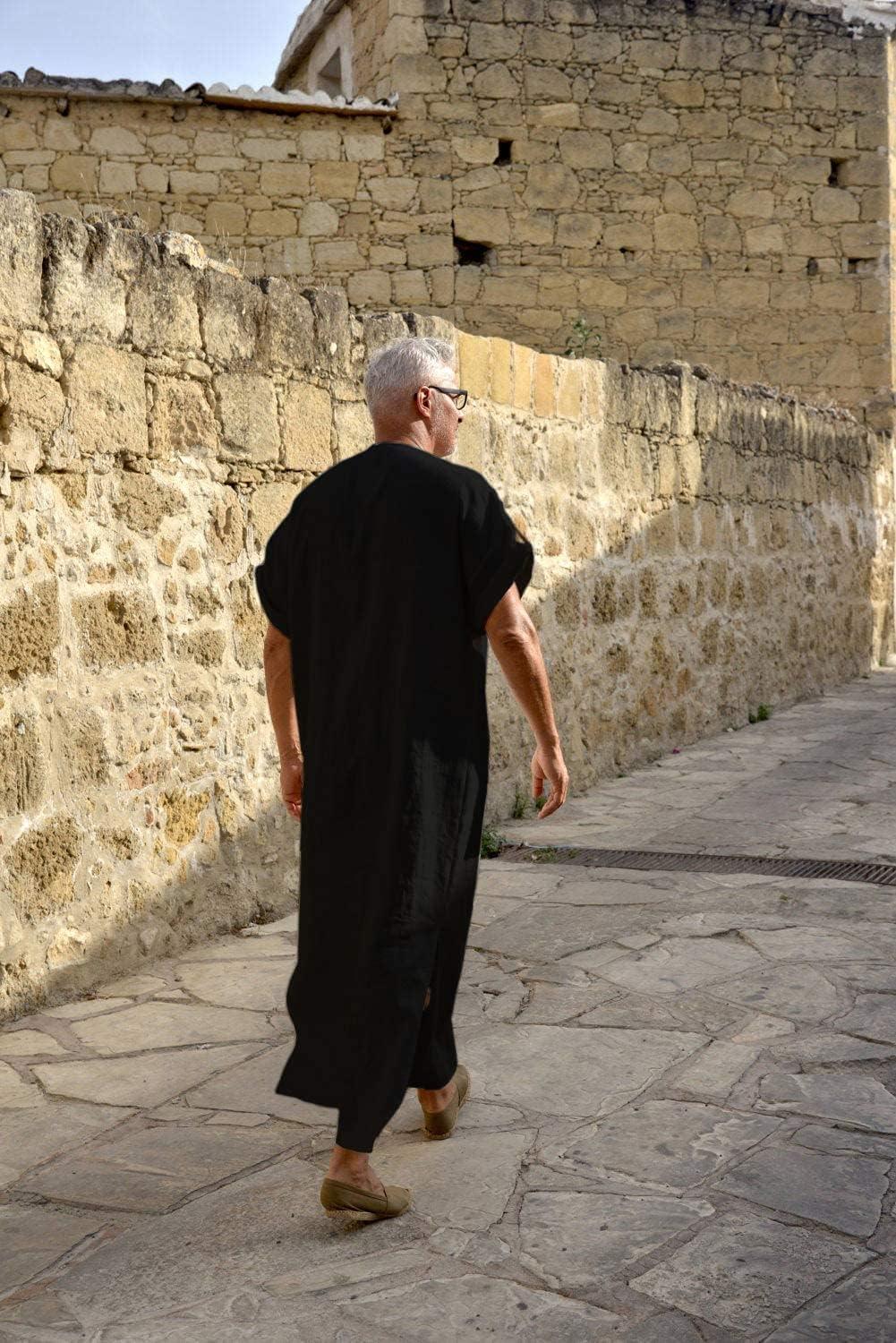 COOFANDY Men’s V-Neck Linen Robe Short Sleeve Kaftan Thobe Long Gown Casual Shirt for Beach, Summer(Black)