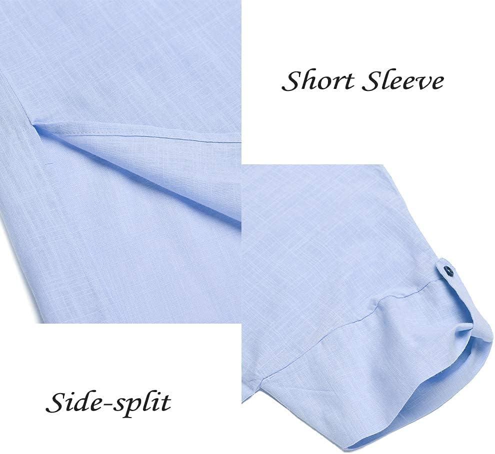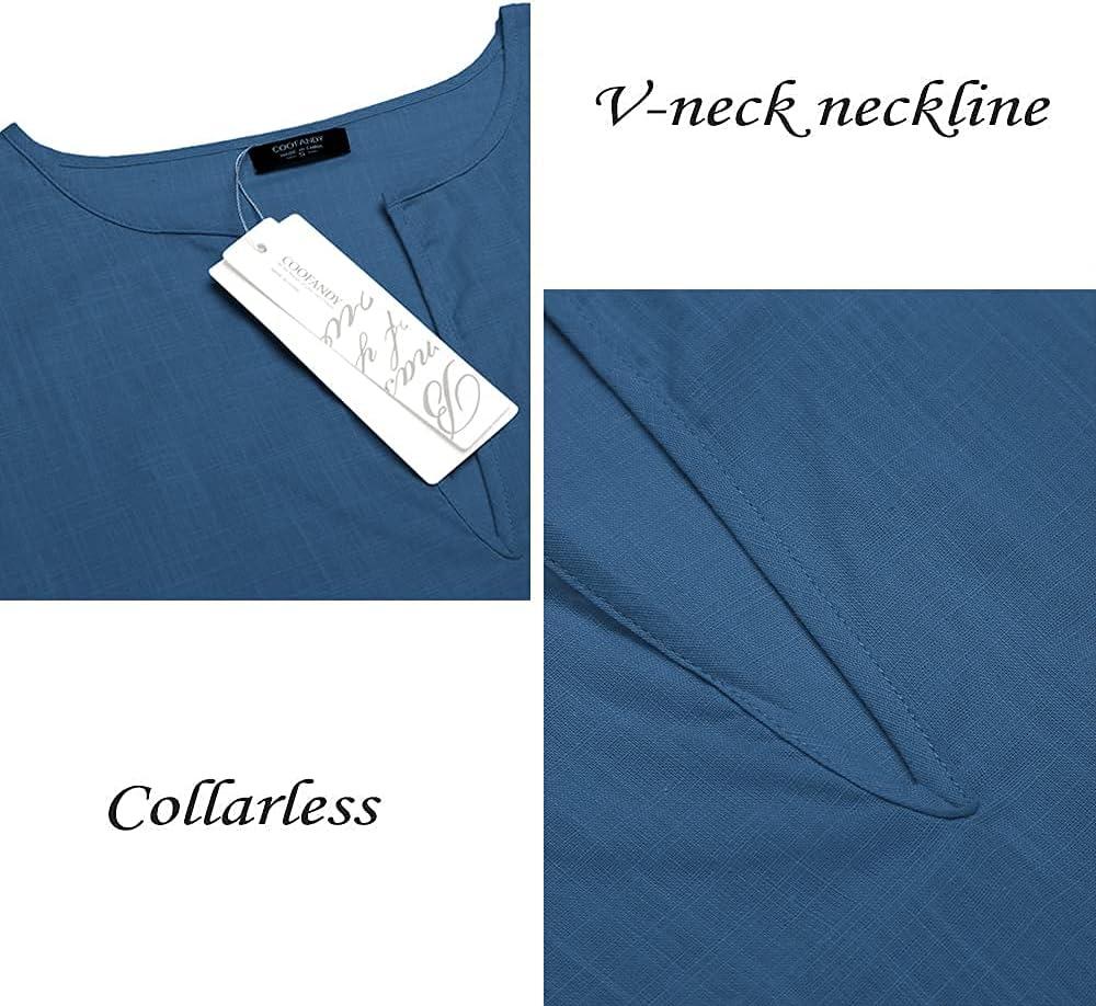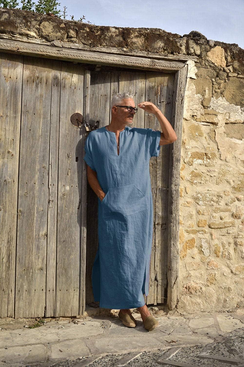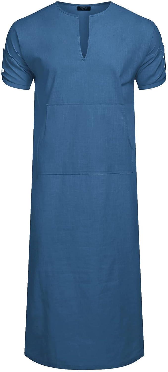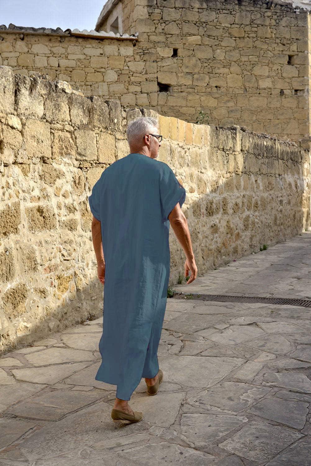 COOFANDY Men’s V-Neck Linen Robe Short Sleeve Kaftan Thobe Long Gown Casual Shirt for Beach, Summer(Blue)