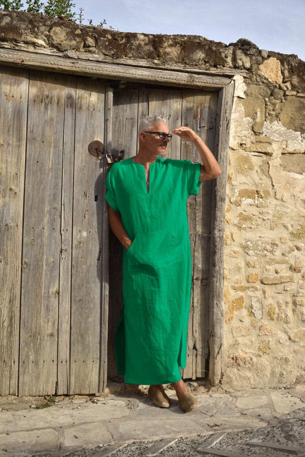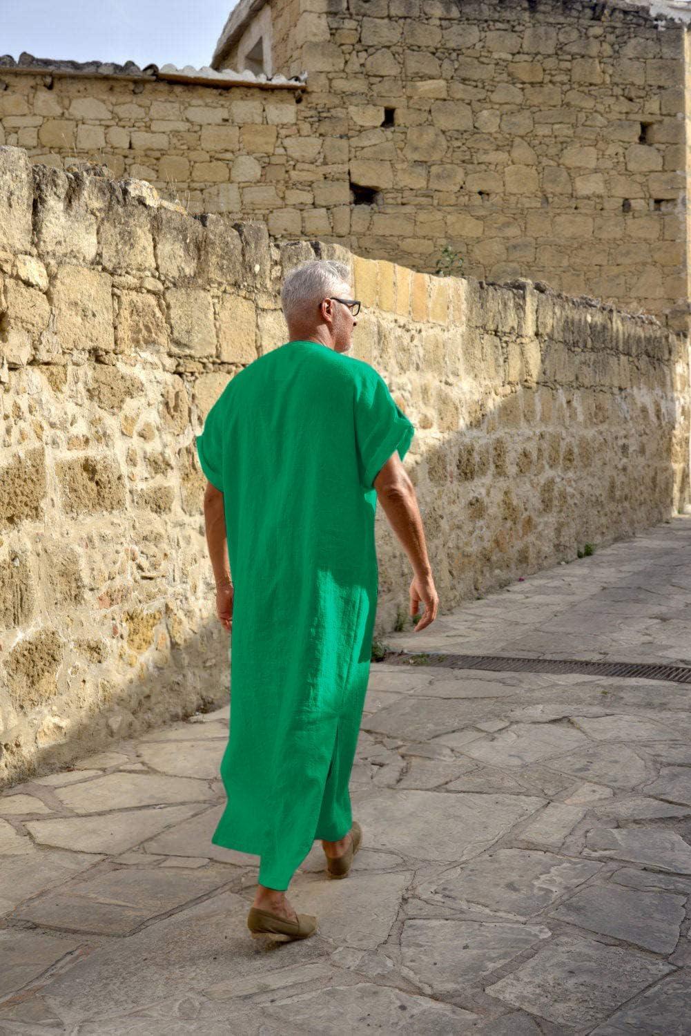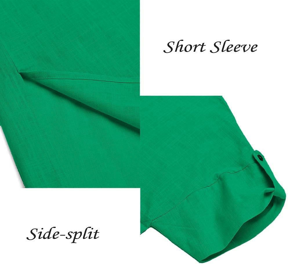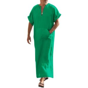 COOFANDY Men’s V-Neck Linen Robe Short Sleeve Kaftan Thobe Long Gown Casual Shirt for Beach, Summer(Deep Green)