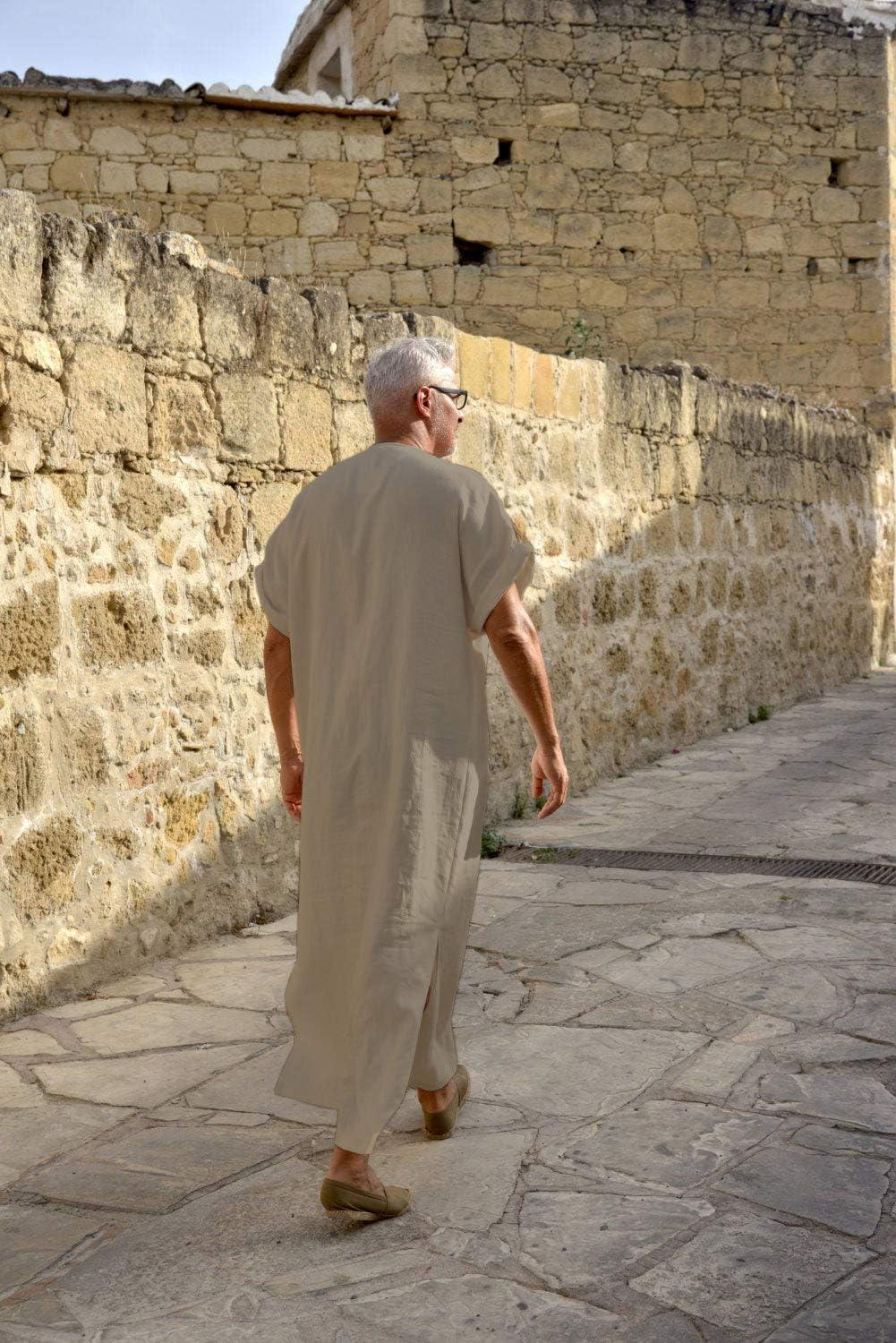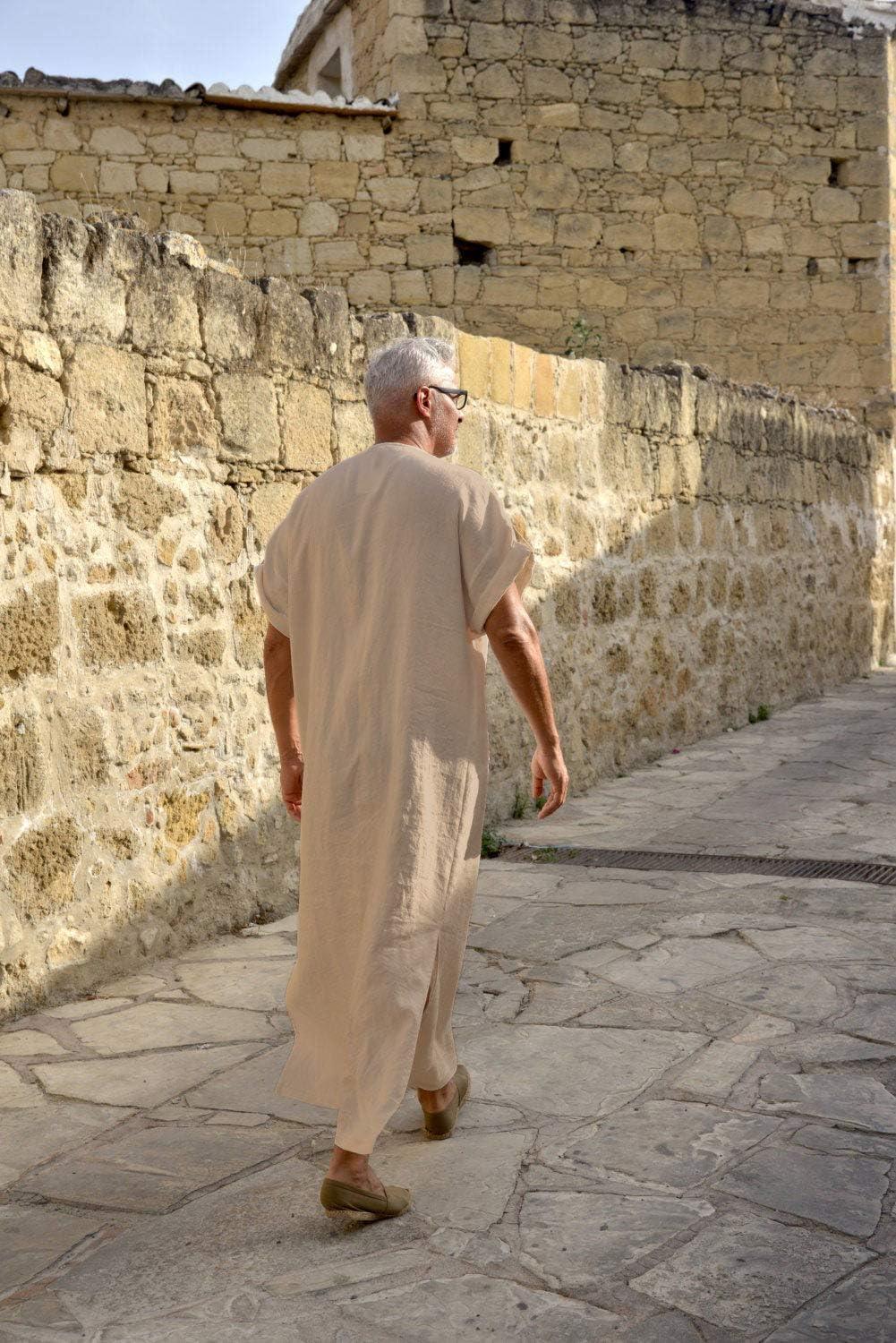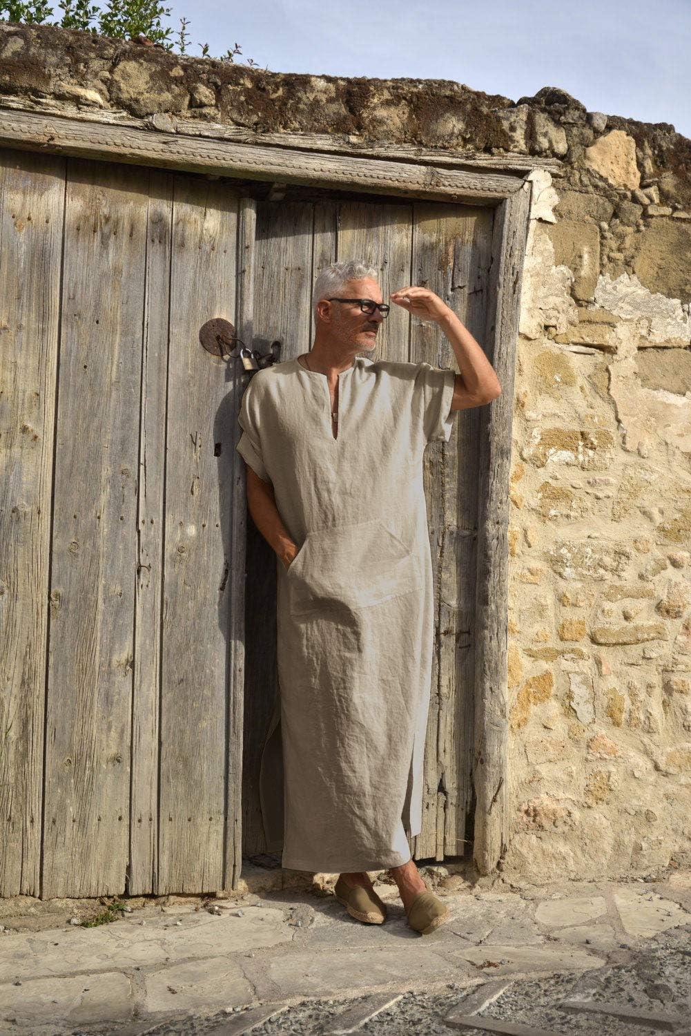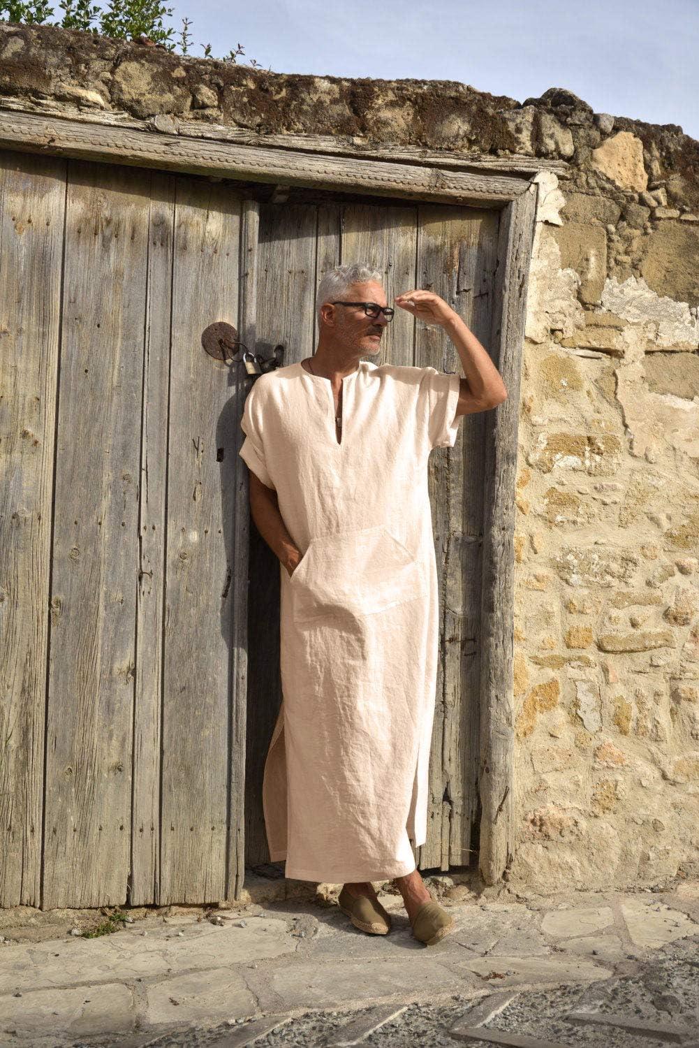 COOFANDY Men’s V-Neck Linen Robe Short Sleeve Kaftan Thobe Long Gown Casual Shirt for Beach, Summer(Light Khaki)