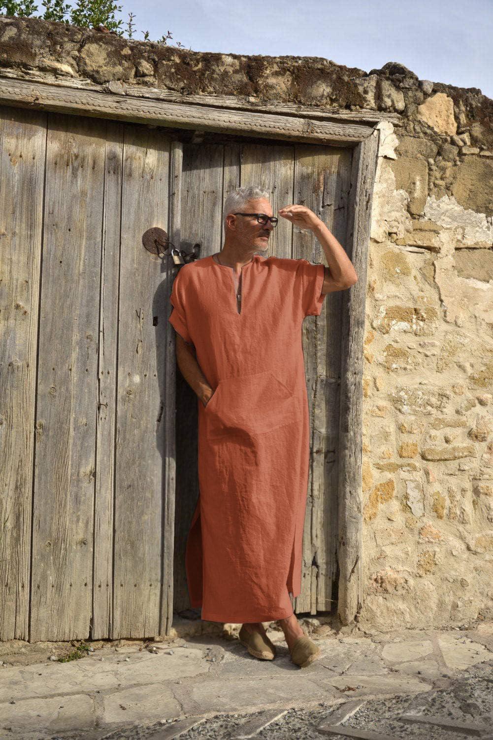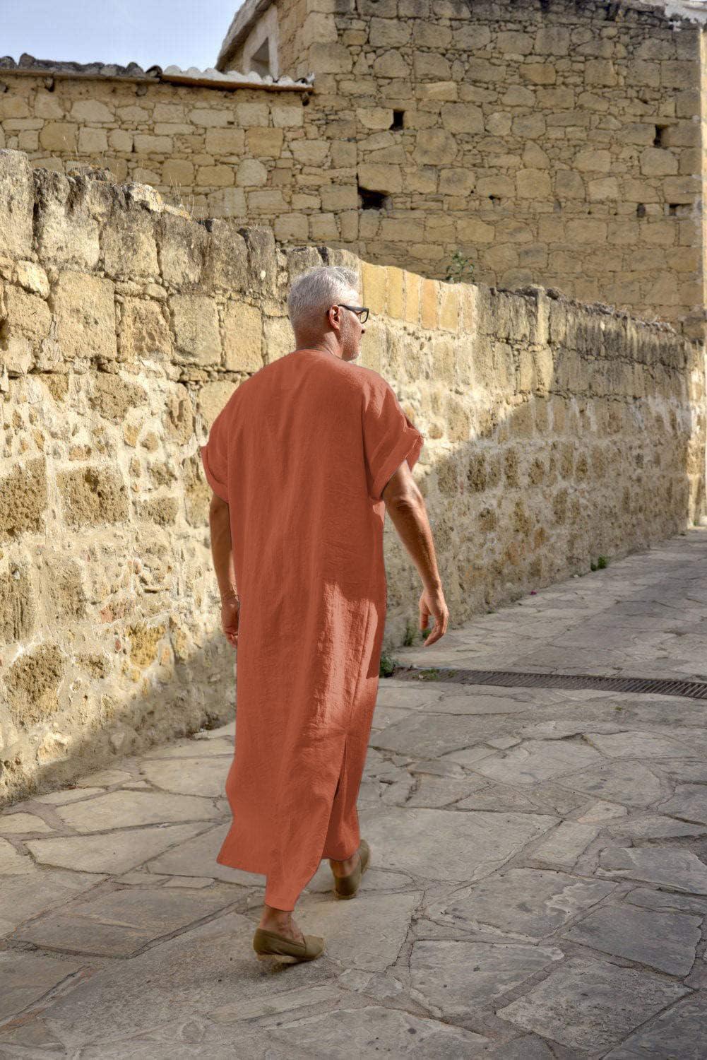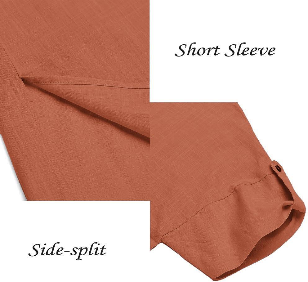 COOFANDY Men’s V-Neck Linen Robe Short Sleeve Kaftan Thobe Long Gown Casual Shirt for Beach, Summer(Dark Pink)