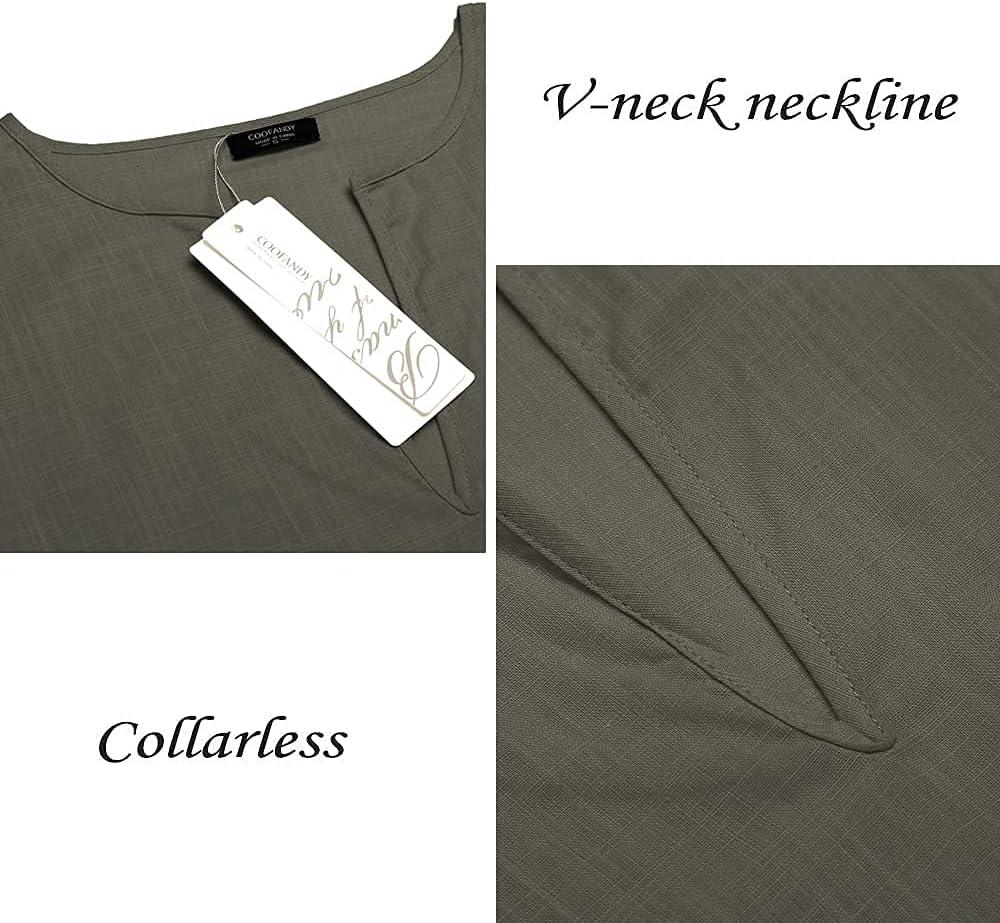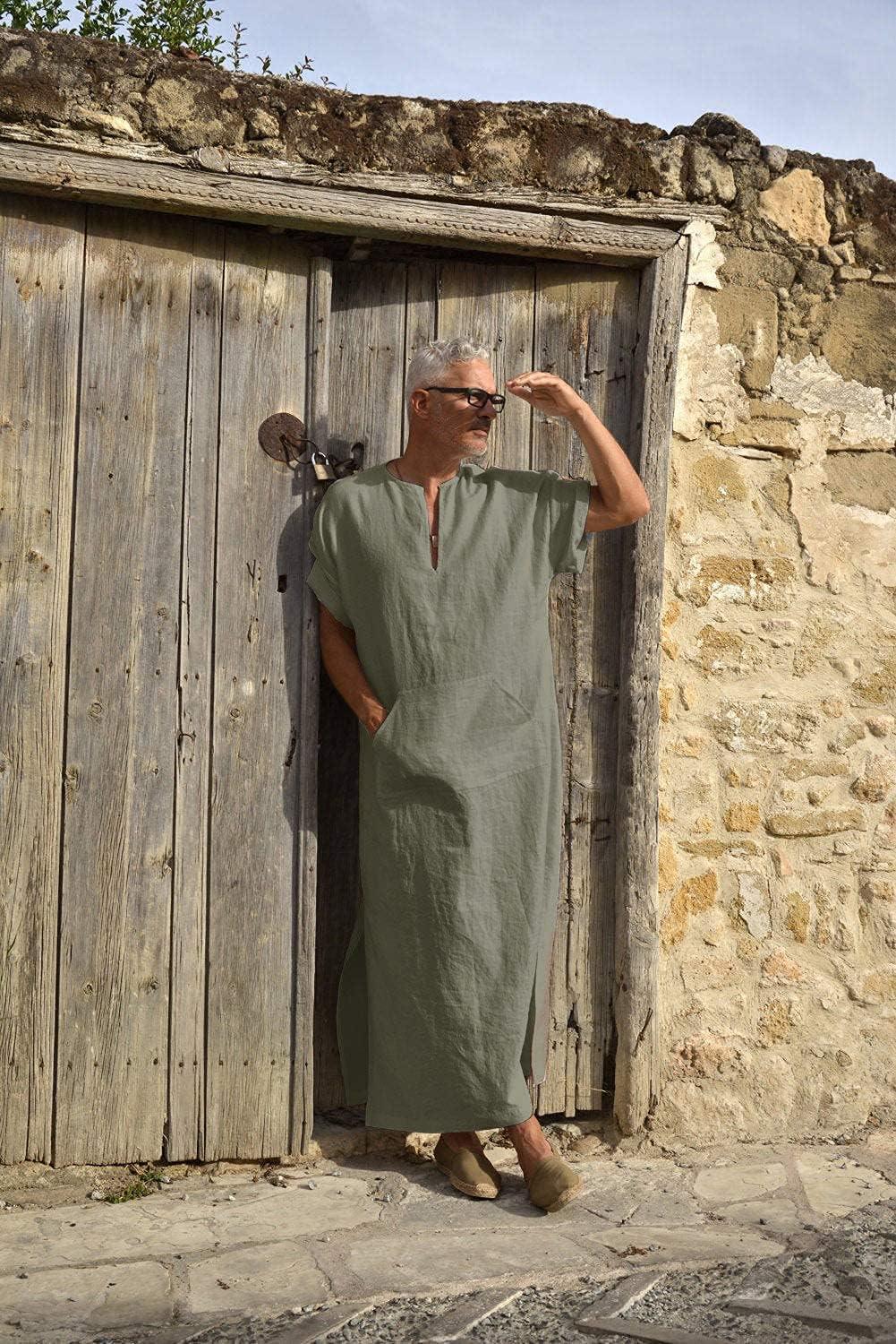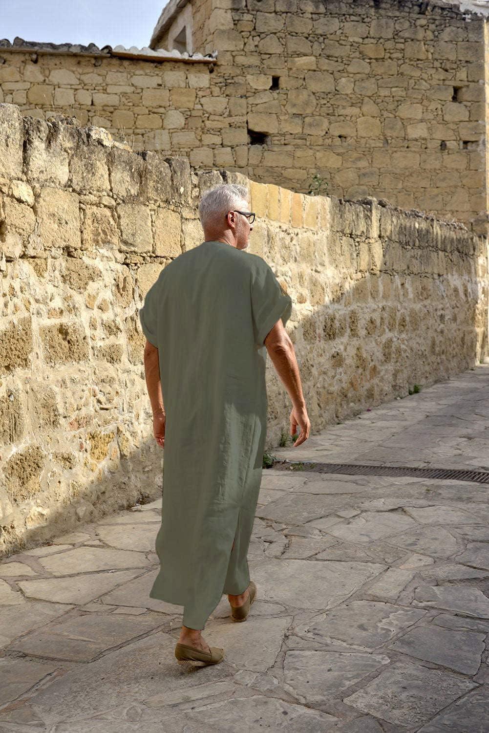 COOFANDY Men’s V-Neck Linen Robe Short Sleeve Kaftan Thobe Long Gown Casual Shirt for Beach, Summer(Olive Green)