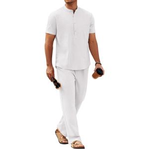 COOFANDY Mens 2 Pieces Cotton Linen Sets Short Sleeve Casual Henley Shirt Summer Beach Pants Lounge Vacation Outfits Set(A-white)