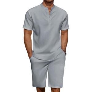 COOFANDY Men’s 2 Pieces Linen Set Casual Henley Shirts Short Sleeve Beach Yoga Shorts Summer Pants Outfits(Grey)