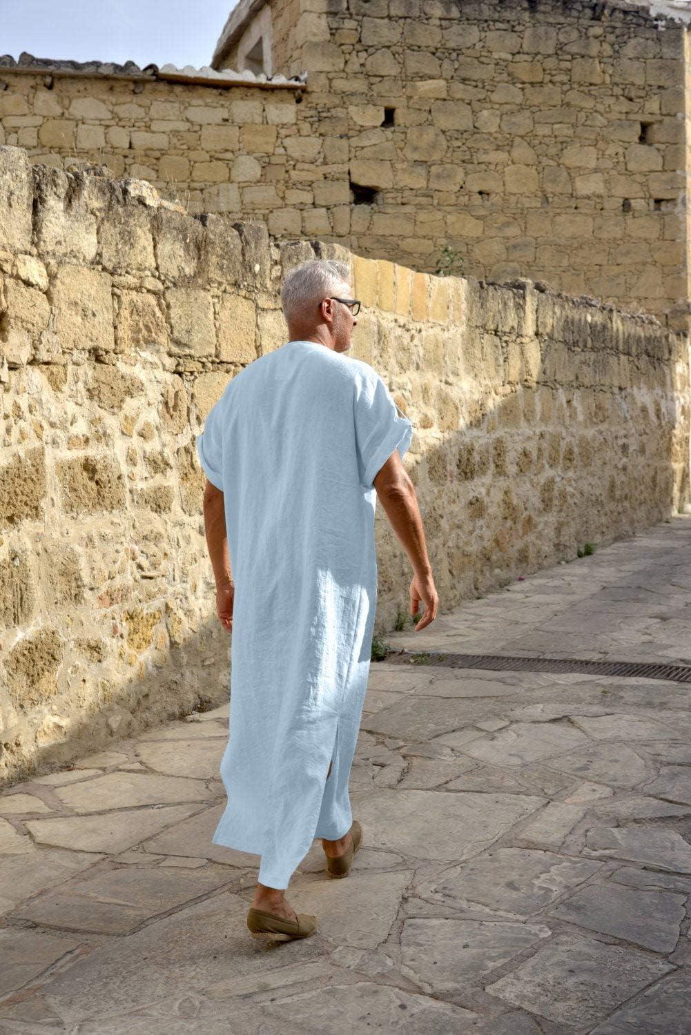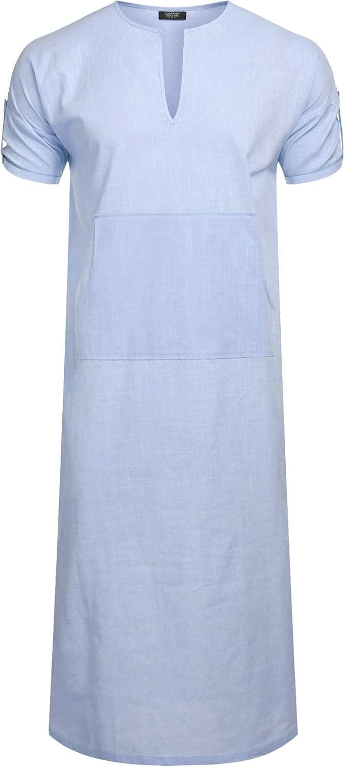 COOFANDY Men’s V-Neck Linen Robe Short Sleeve Kaftan Thobe Long Gown Casual Shirt for Beach, Summer(Light Blue)