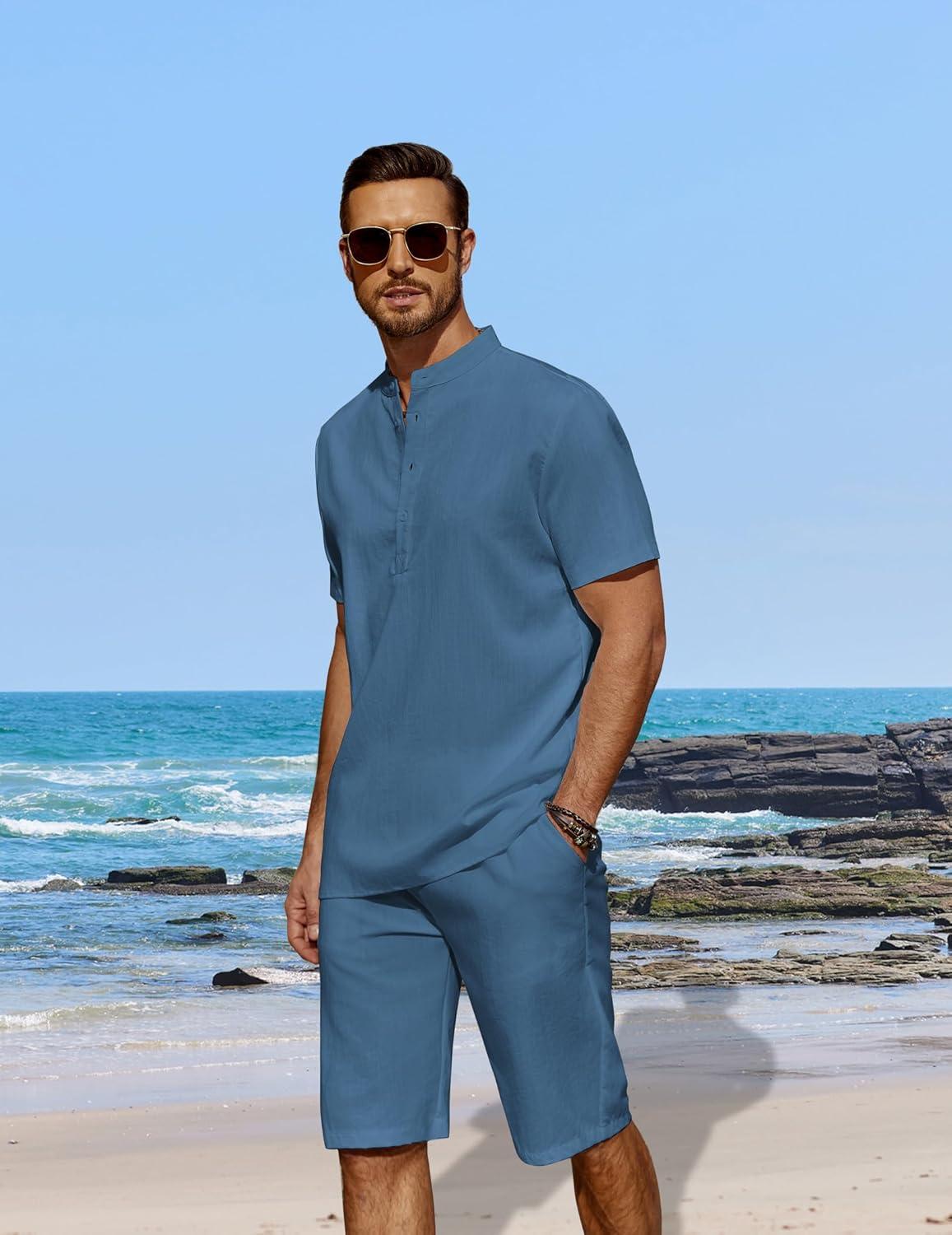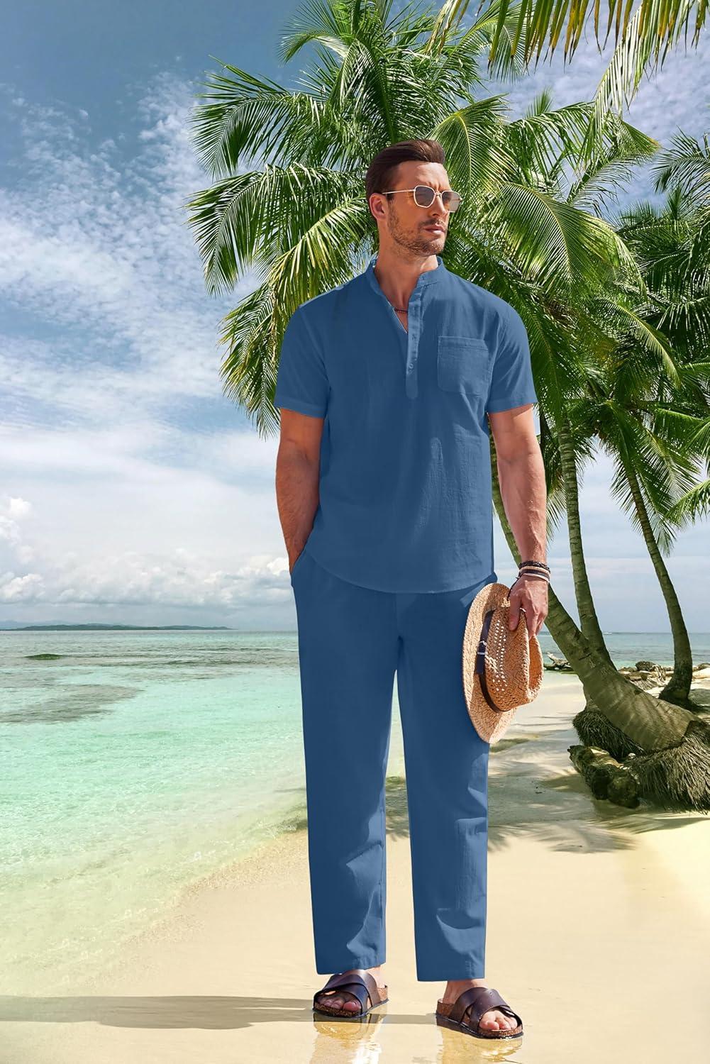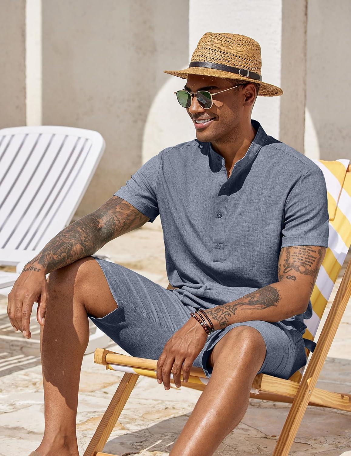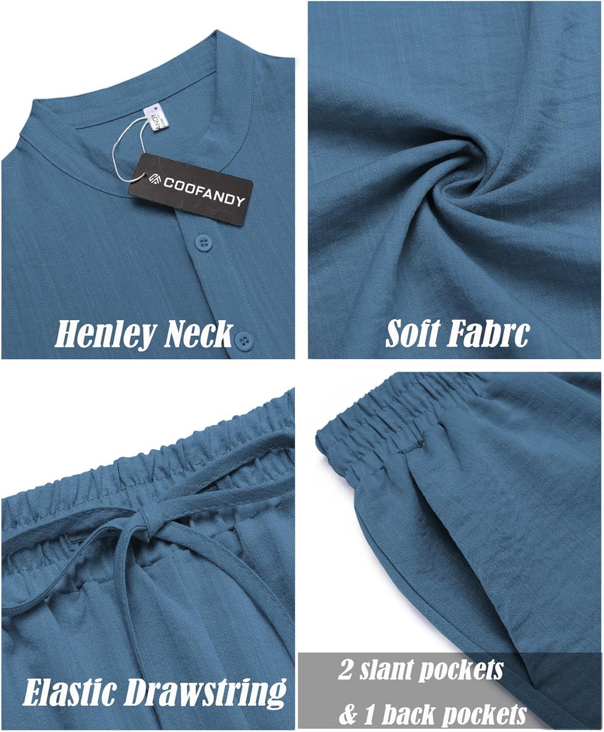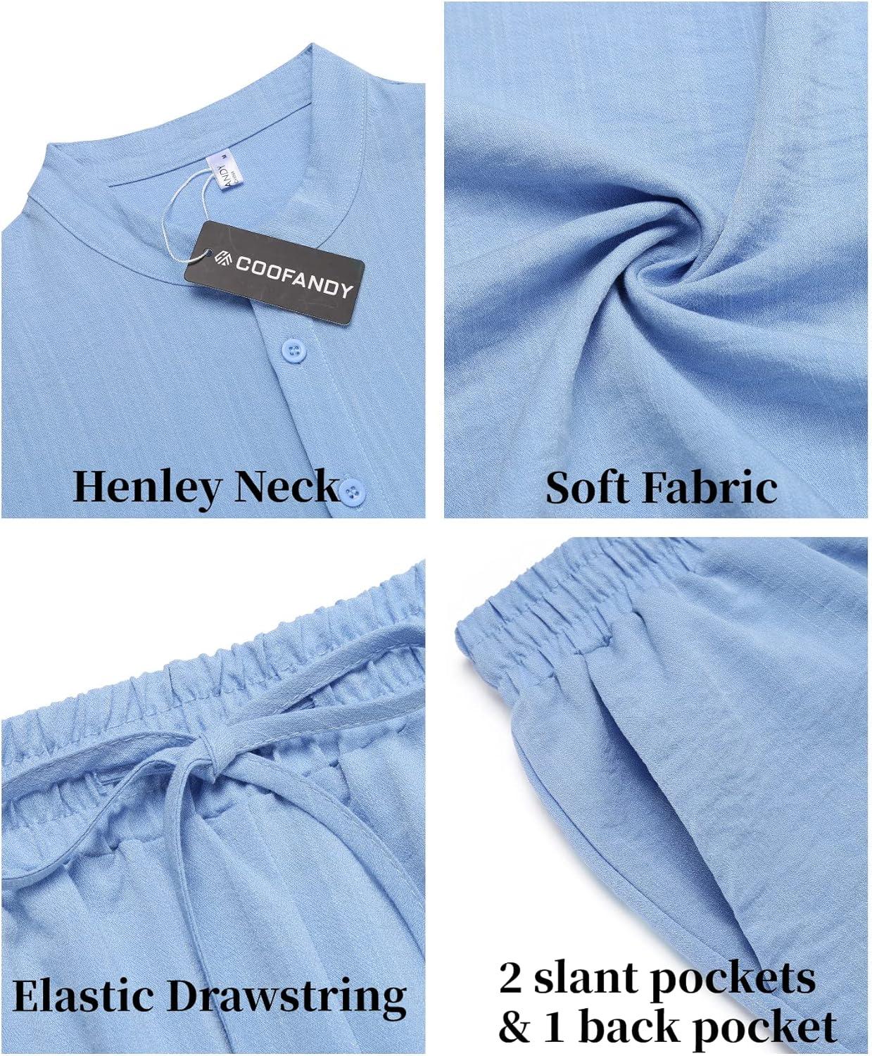COOFANDY Men’s 2 Pieces Cotton Linen Set Casual Short Sleeve Henley Shirts Beach Yoga Pants Summer Outfits(Denim Blue)
