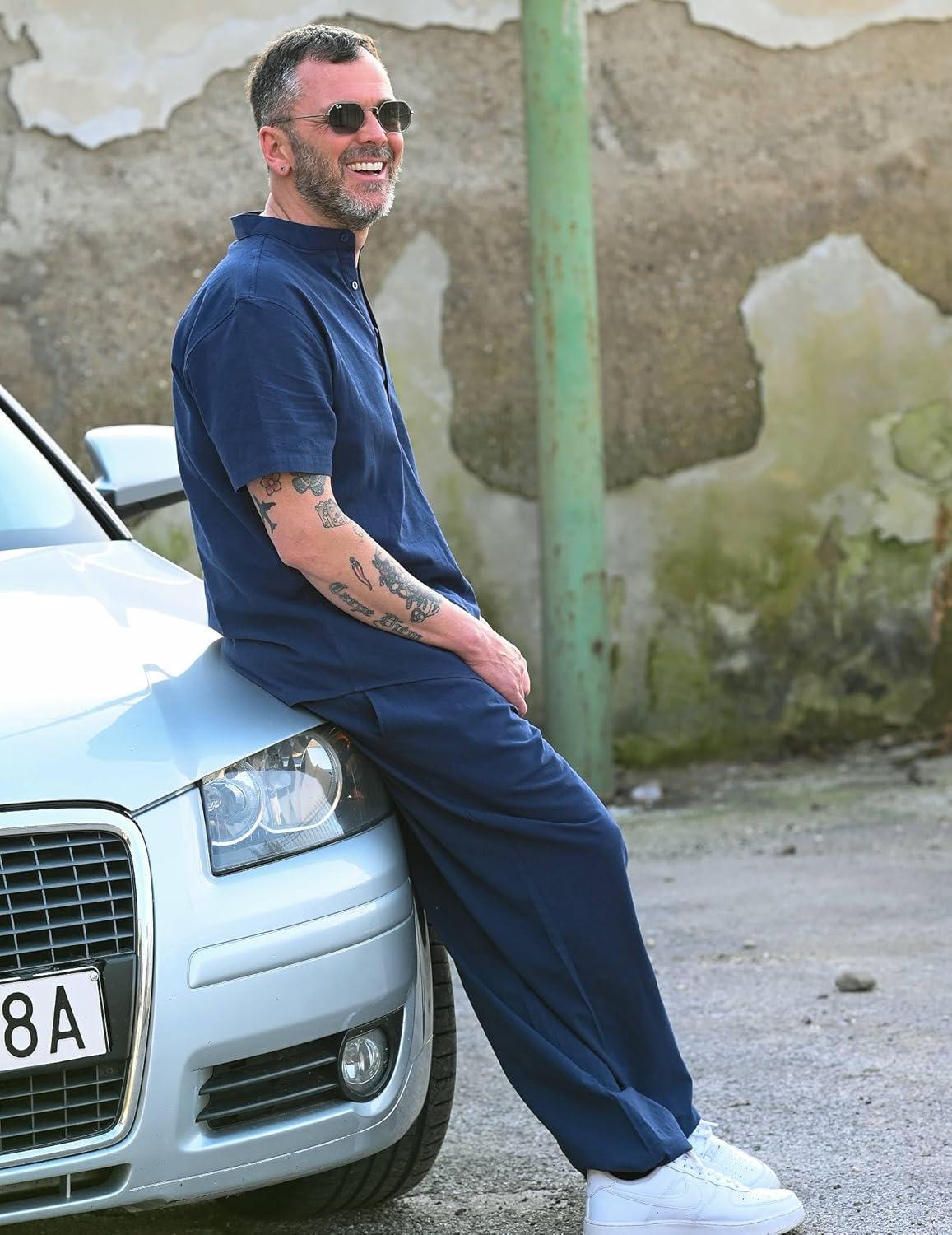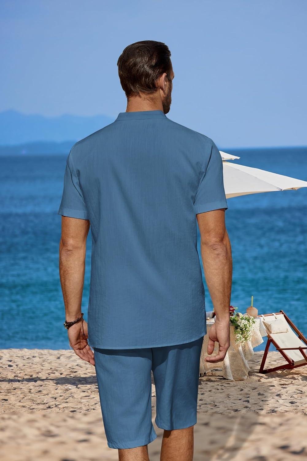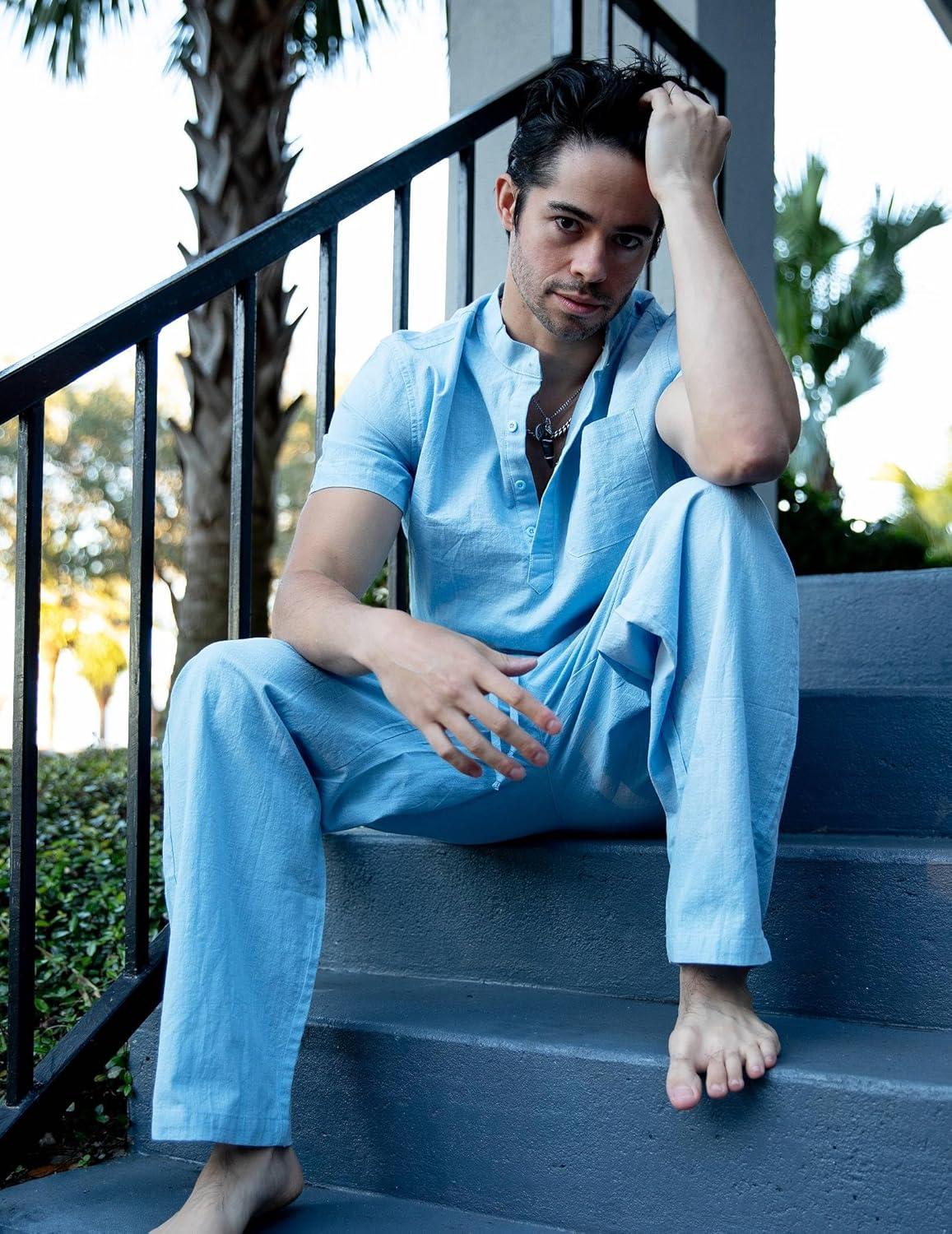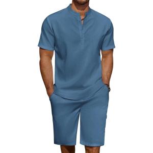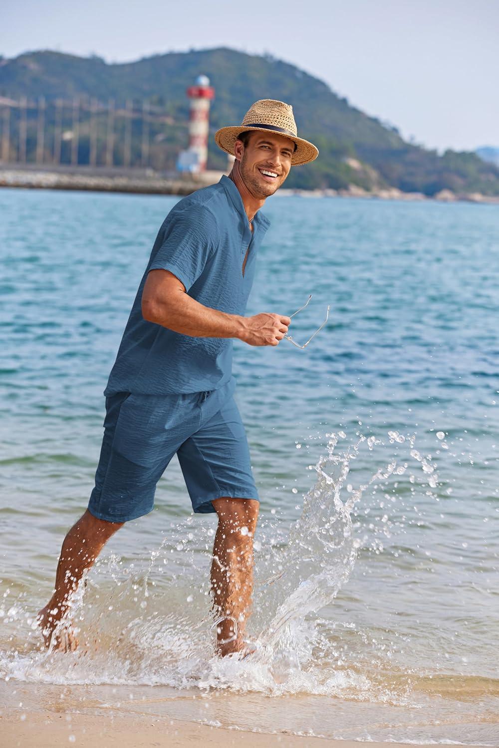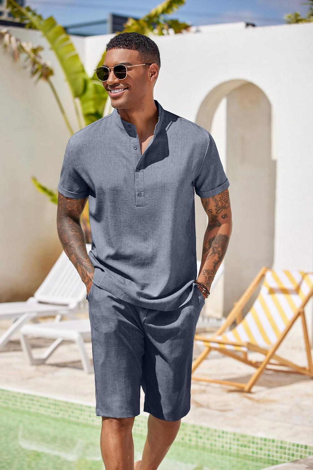 COOFANDY Men’s 2 Pieces Cotton Linen Set Casual Short Sleeve Henley Shirts Beach Yoga Pants Summer Outfits(Denim Blue)
