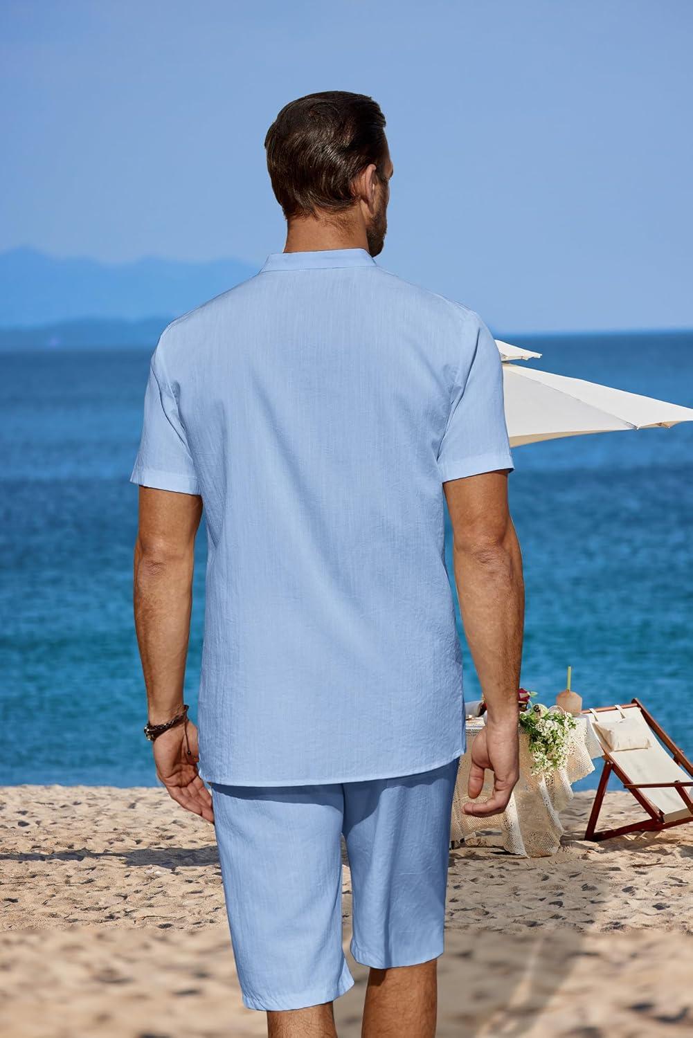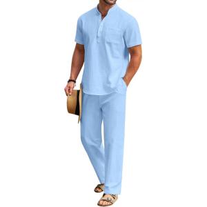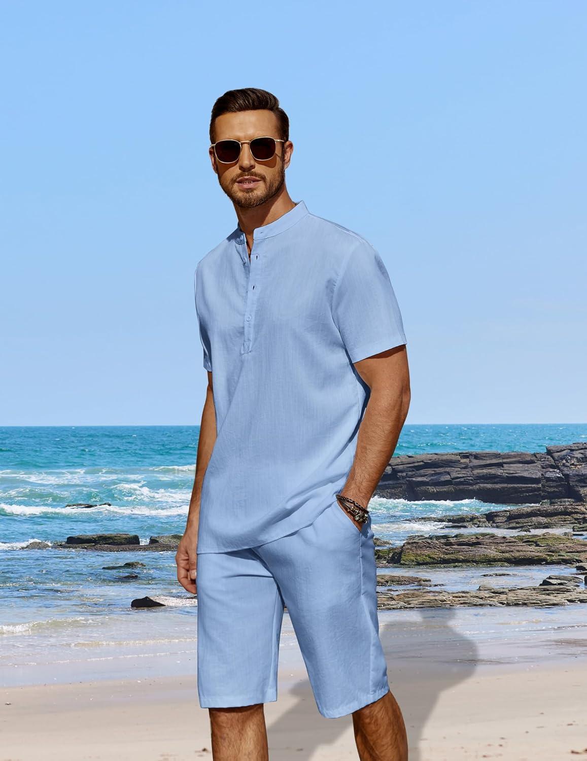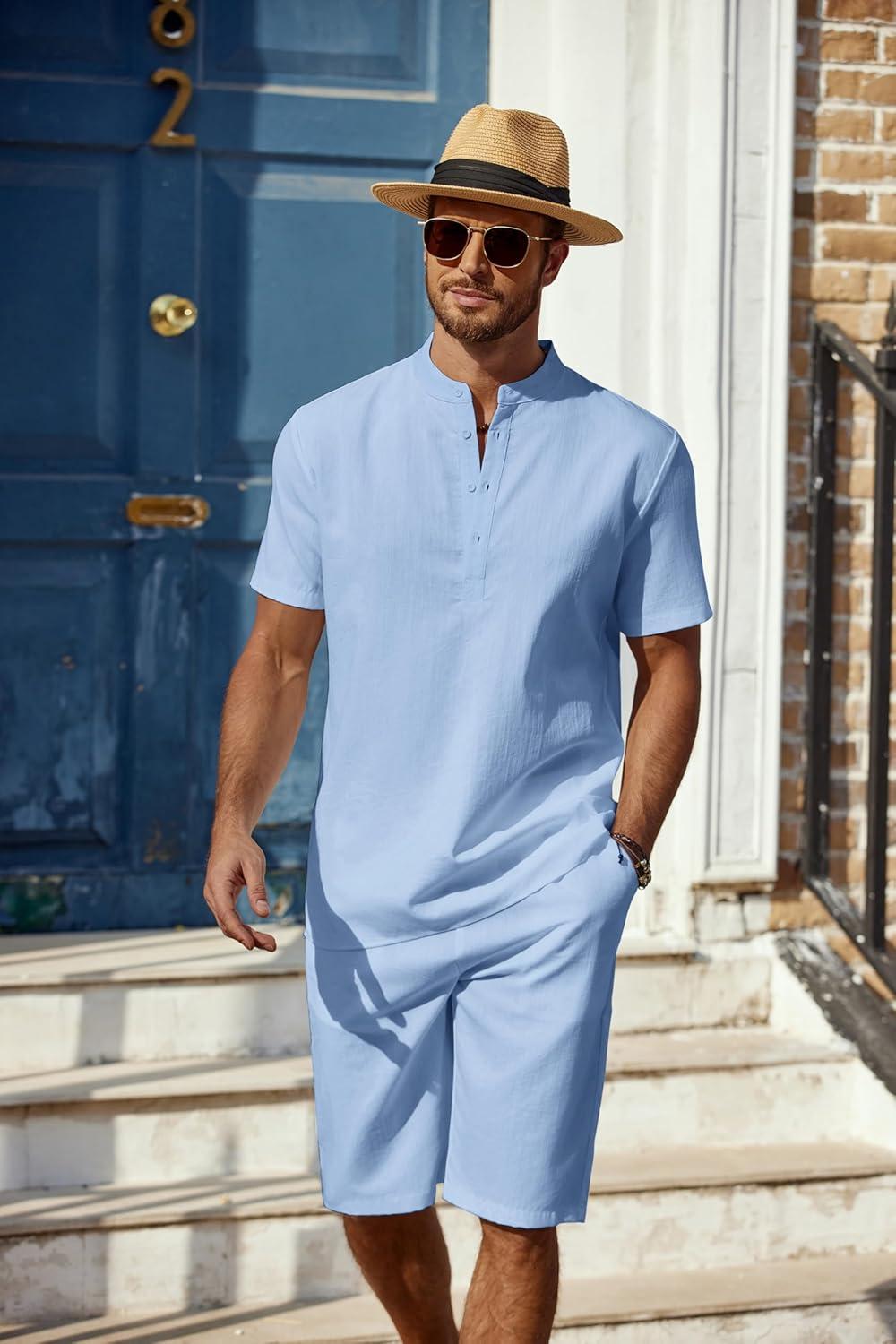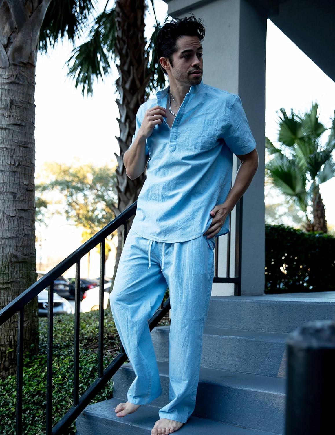 COOFANDY Men’s 2 Pieces Cotton Linen Set Casual Short Sleeve Henley Shirts Beach Yoga Pants Summer Outfits(Light Blue)