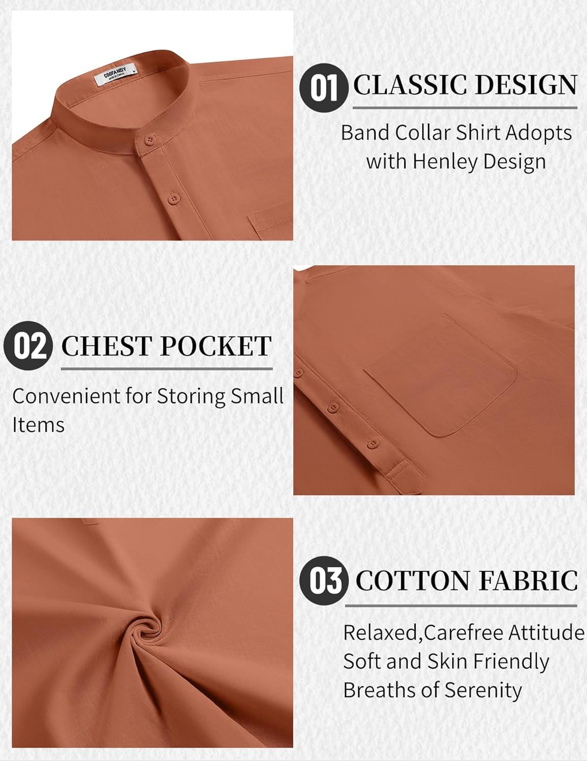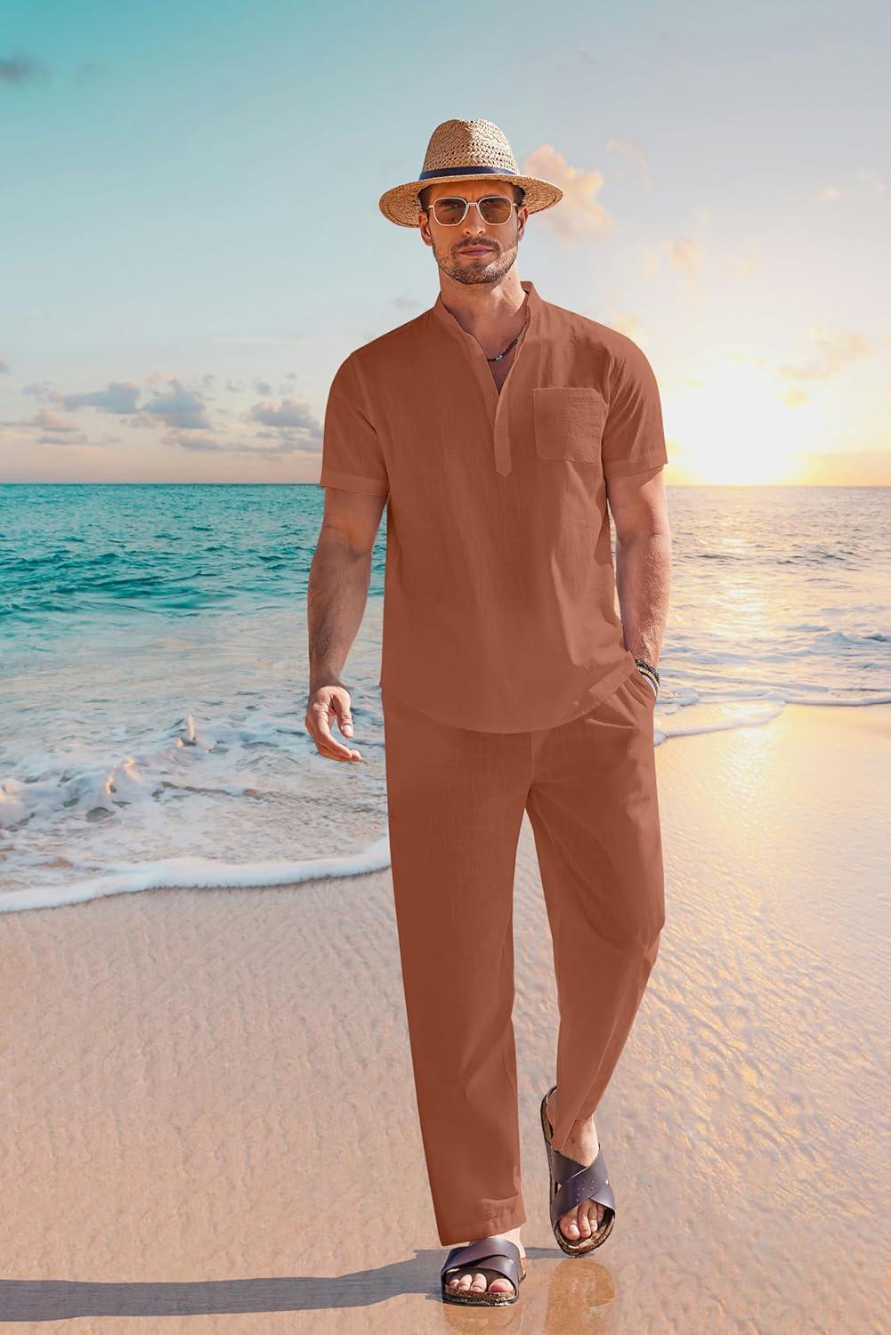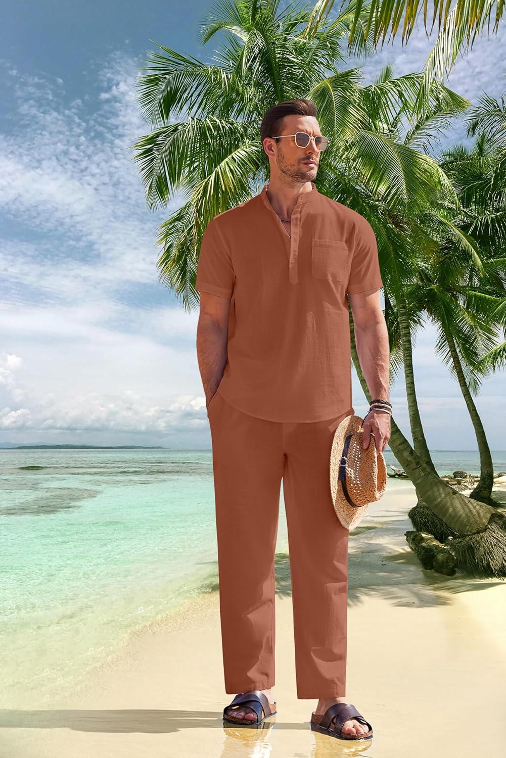 COOFANDY Men’s 2 Pieces Cotton Linen Set Casual Short Sleeve Henley Shirts Beach Yoga Pants Summer Outfits(Caramel)