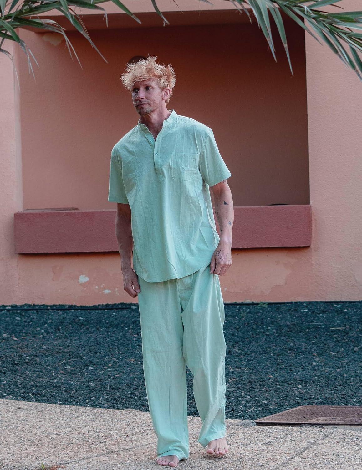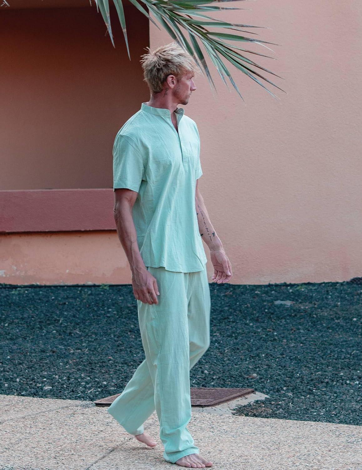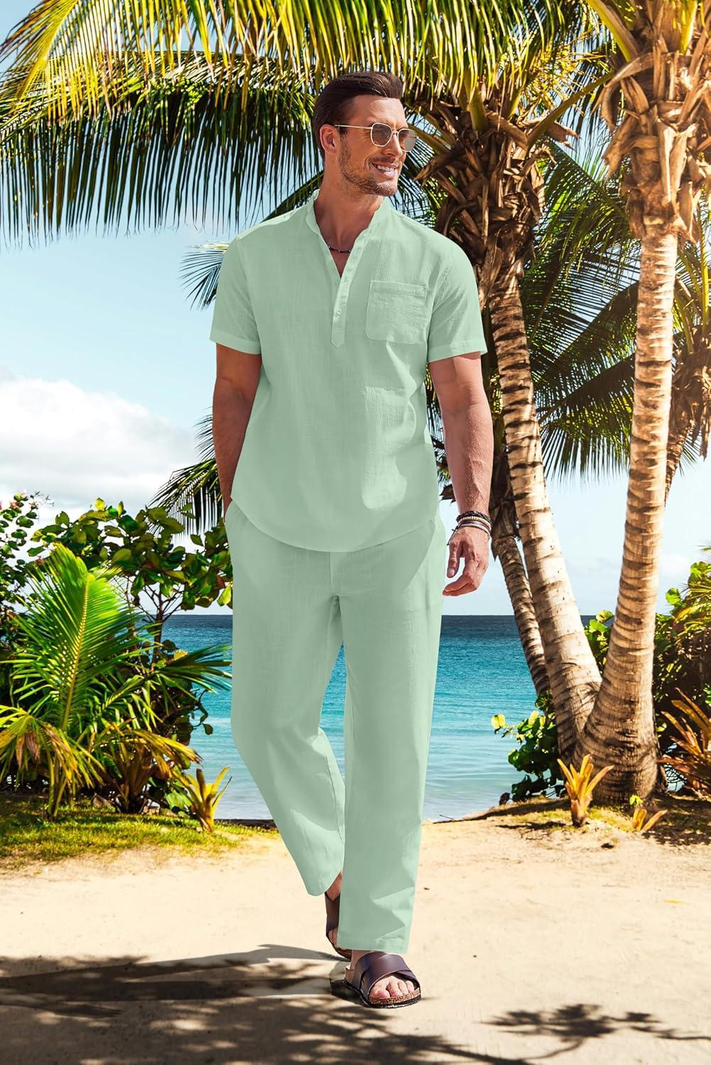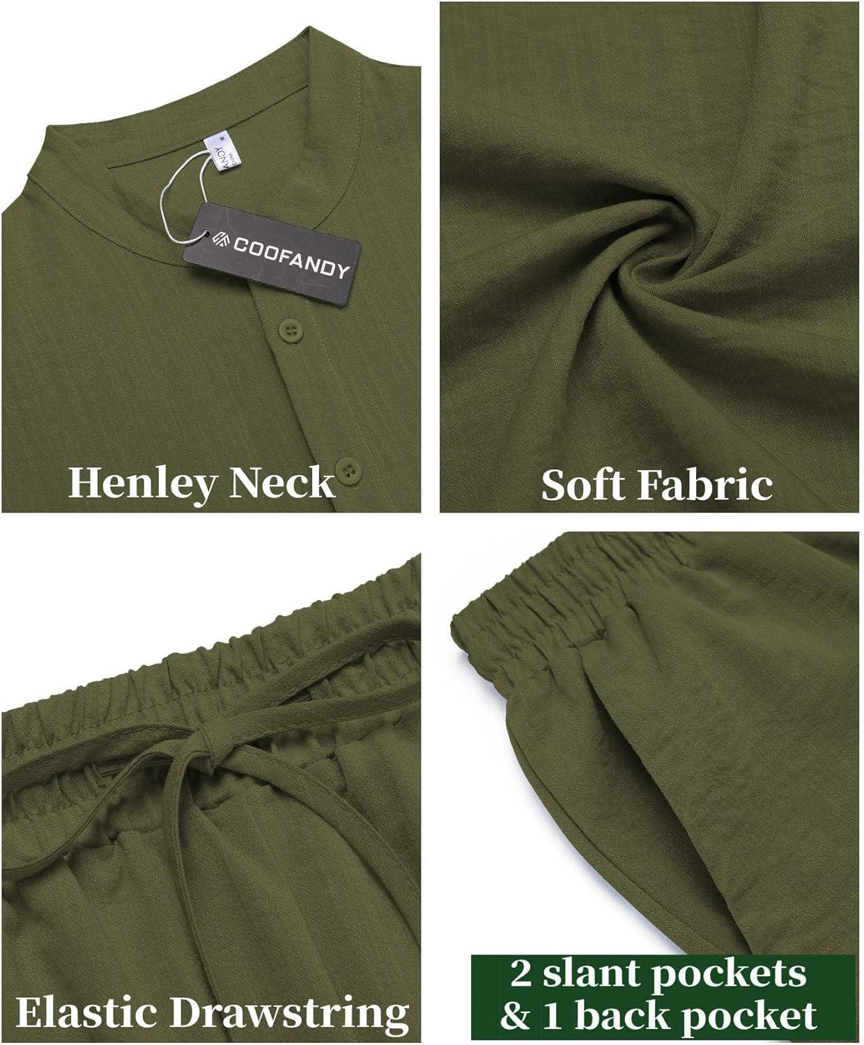 COOFANDY Men’s 2 Pieces Cotton Linen Set Casual Short Sleeve Henley Shirts Beach Yoga Pants Summer Outfits(Green)