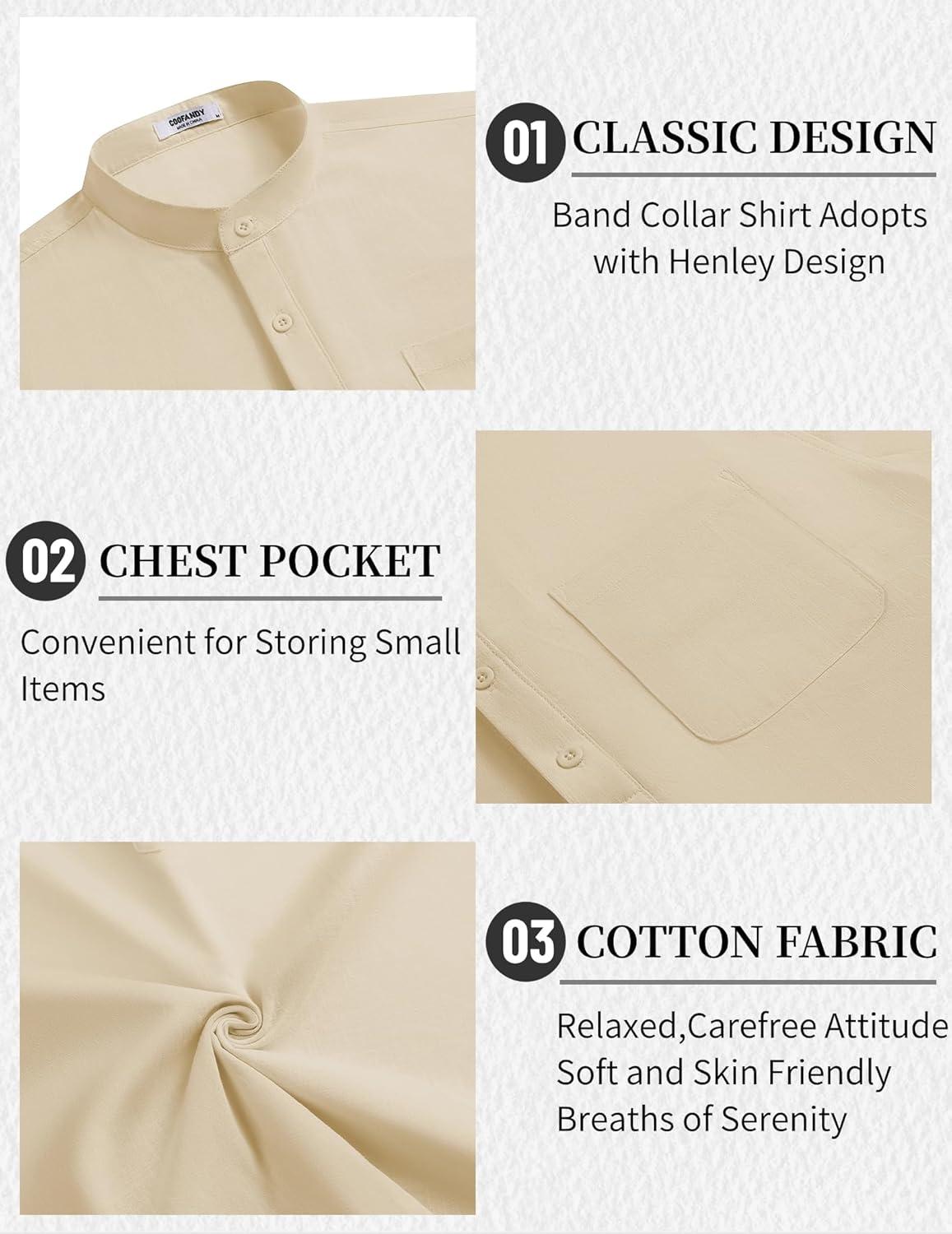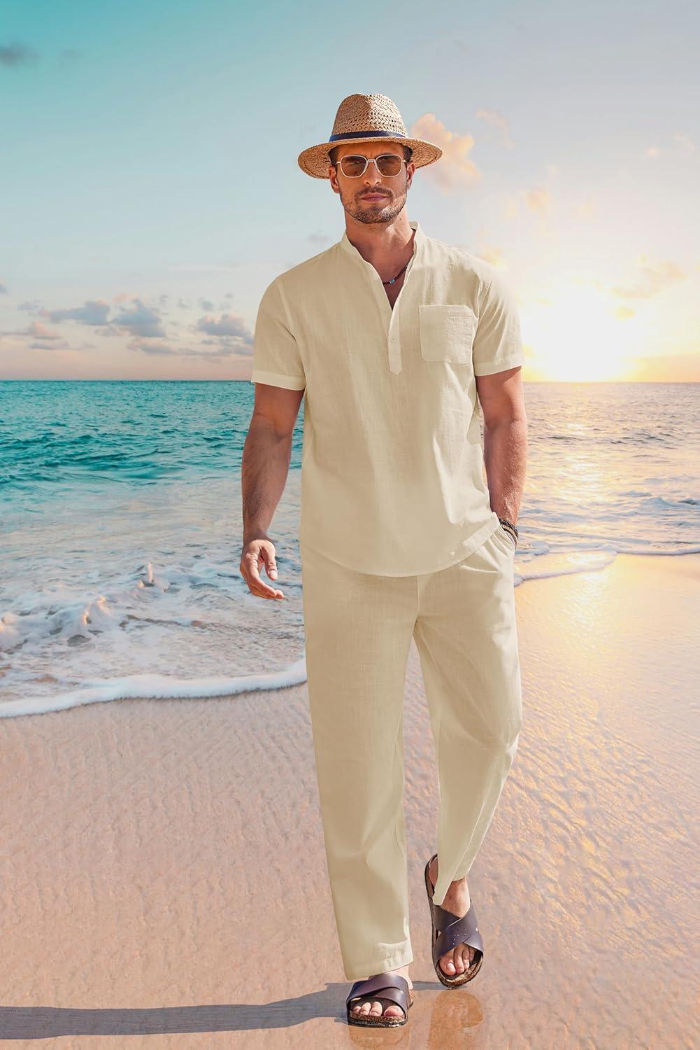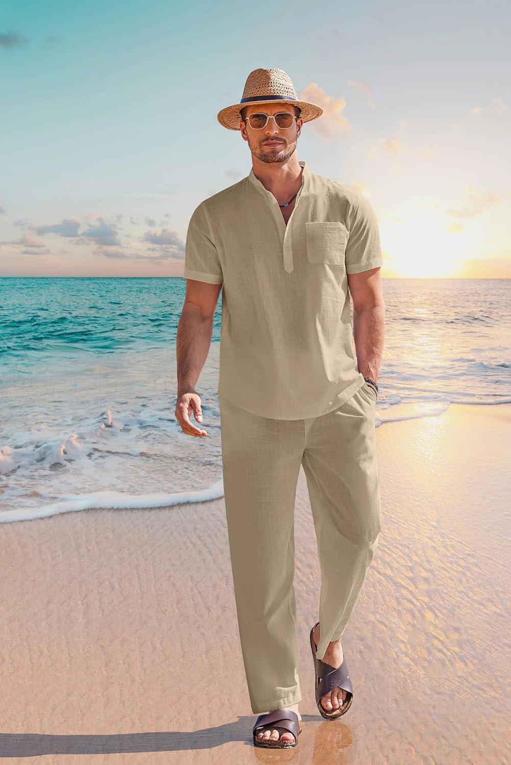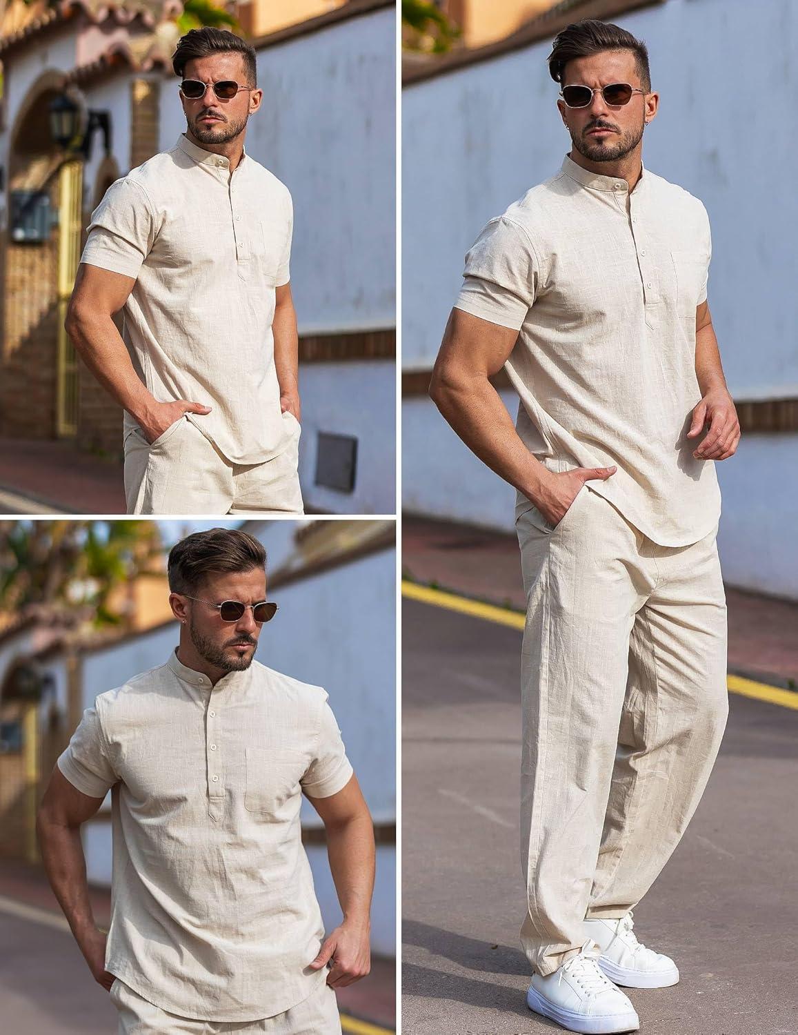 COOFANDY Men’s 2 Pieces Cotton Linen Set Casual Short Sleeve Henley Shirts Beach Yoga Pants Summer Outfits(Light Khaki)