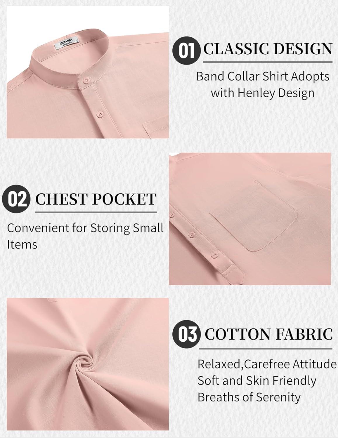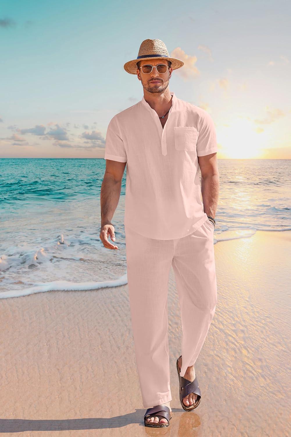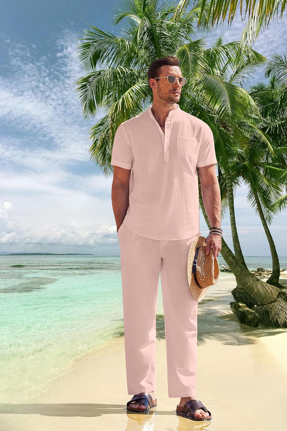 COOFANDY Men’s 2 Pieces Cotton Linen Set Casual Short Sleeve Henley Shirts Beach Yoga Pants Summer Outfits(Pink)