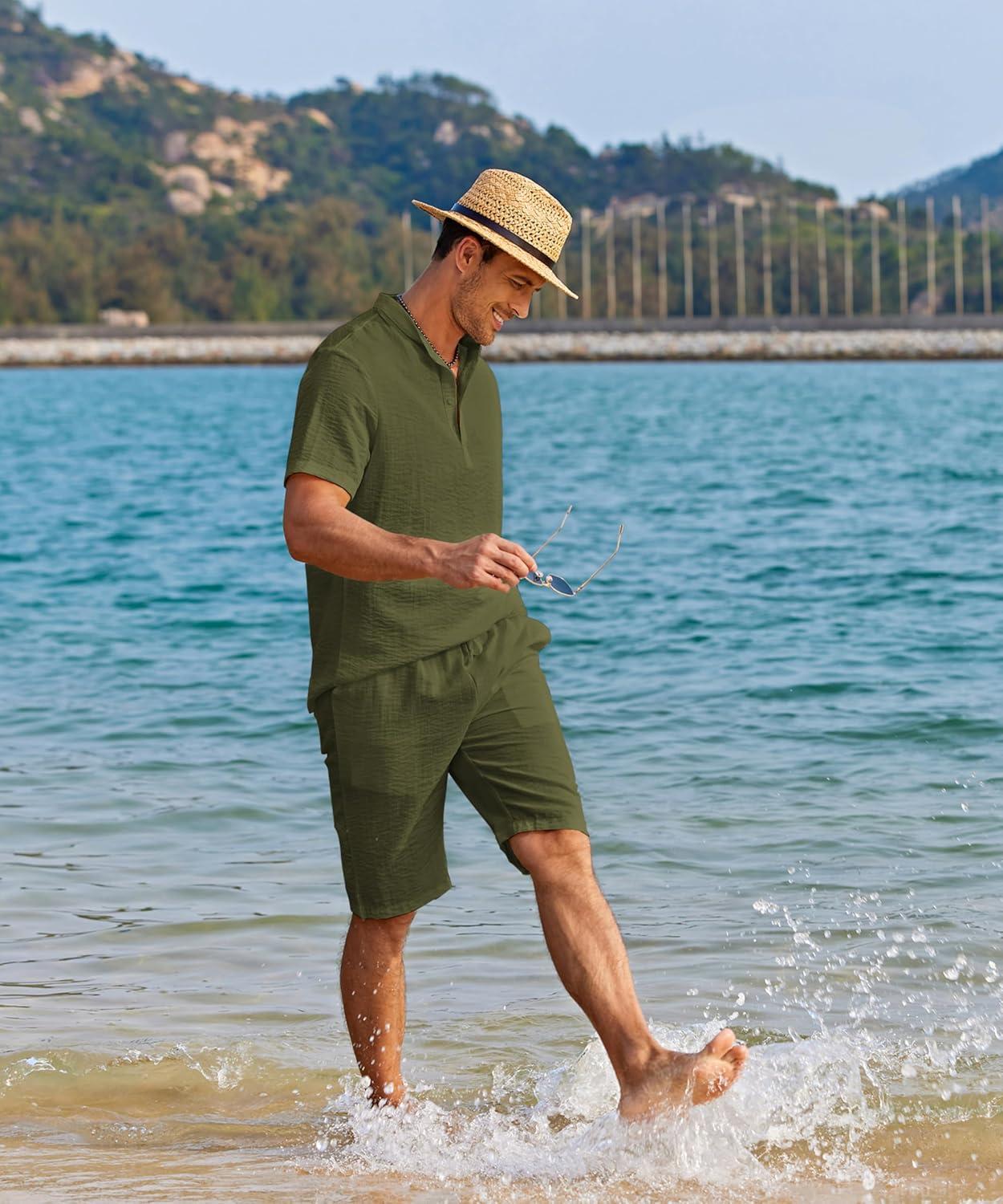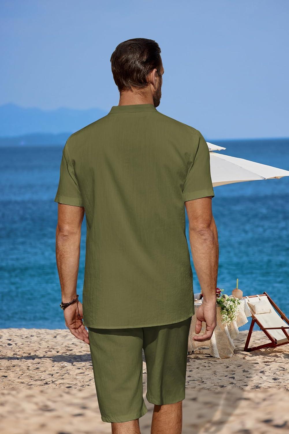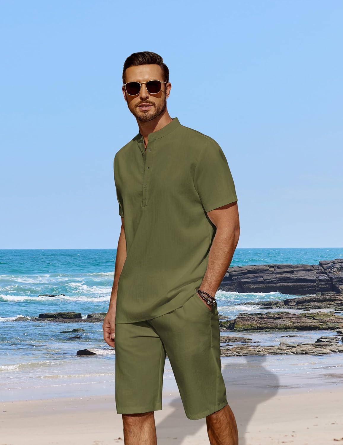 COOFANDY Men’s 2 Pieces Linen Set Casual Henley Shirts Short Sleeve Beach Yoga Shorts Summer Pants Outfits(Army Green)