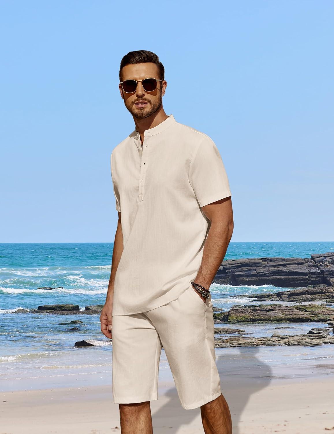 COOFANDY Men’s 2 Pieces Linen Set Casual Henley Shirts Short Sleeve Beach Yoga Shorts Summer Pants Outfits(Beige)