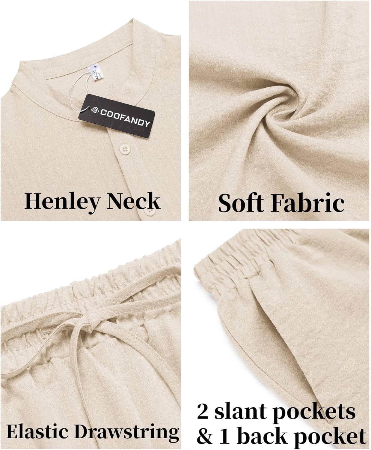 COOFANDY Men’s 2 Pieces Cotton Linen Set Casual Short Sleeve Henley Shirts Beach Yoga Pants Summer Outfits(Khaki)