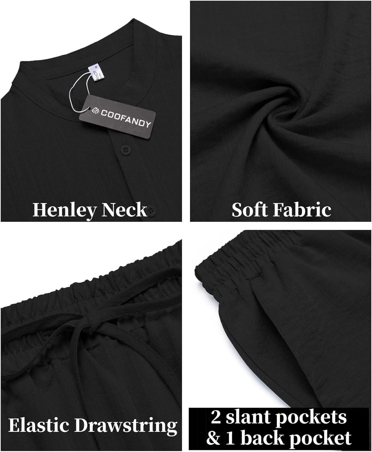 COOFANDY Men’s 2 Pieces Linen Set Casual Henley Shirts Short Sleeve Beach Yoga Shorts Summer Pants Outfits(Black)
