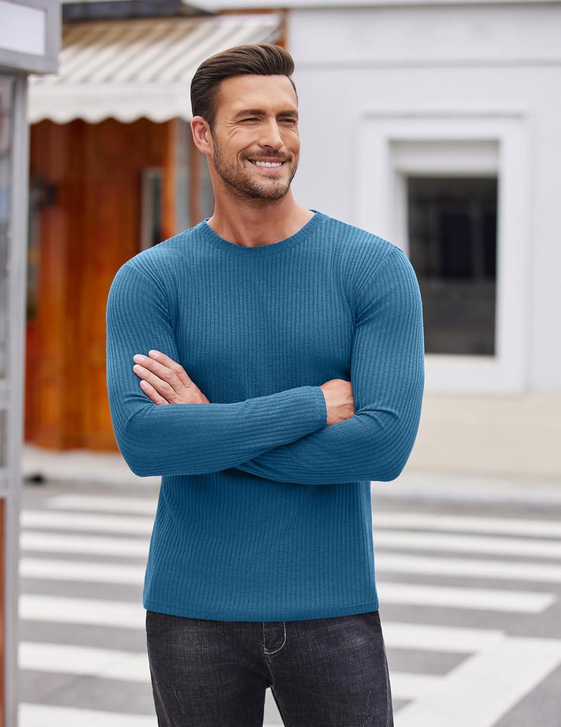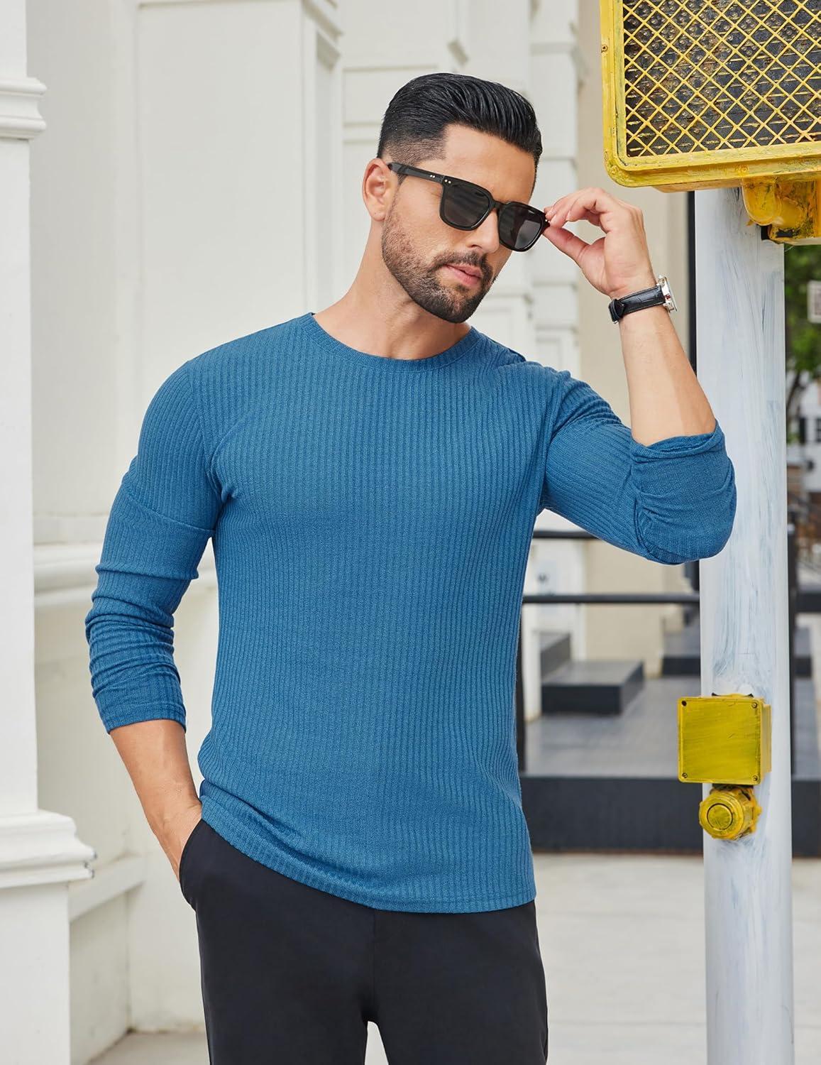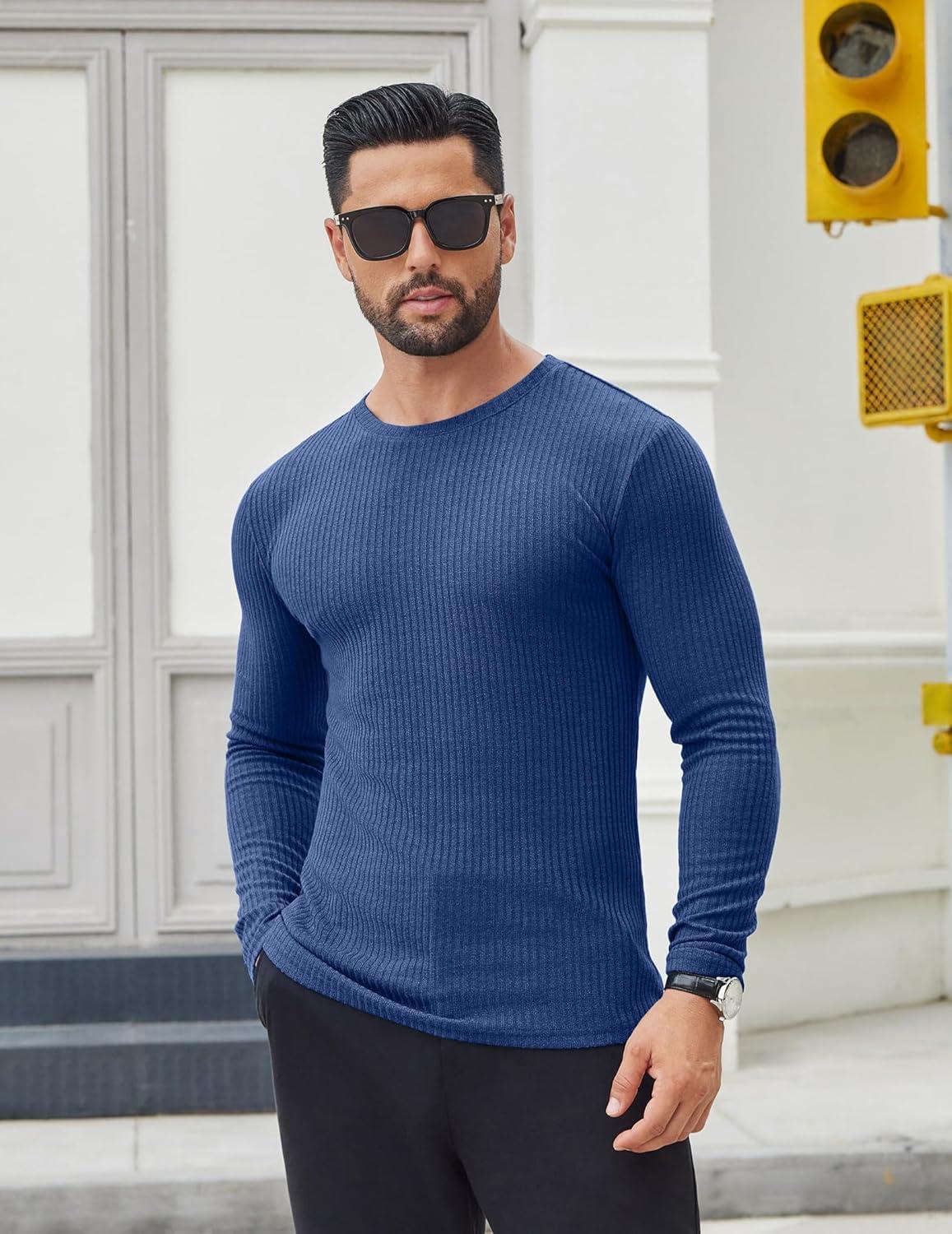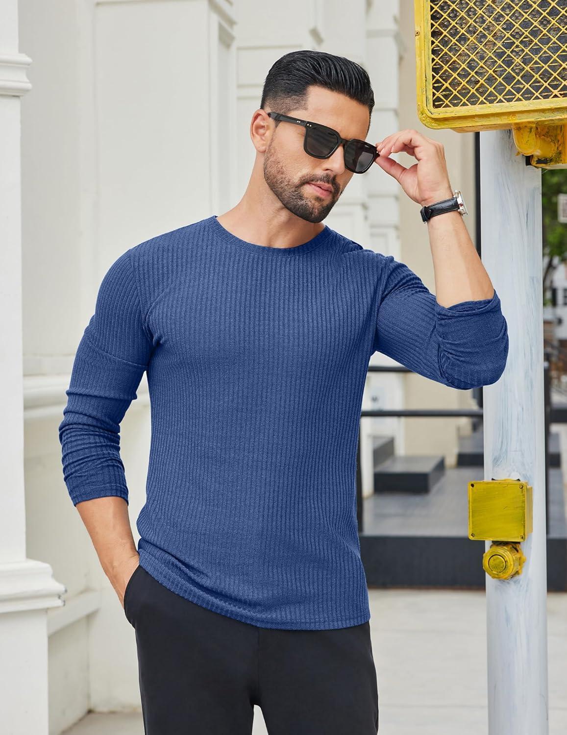 COOFANDY Men 2 Pack Muscle Fitted T Shirt Gym Workout Athletic Long Sleeves Tee(Denim Blue)