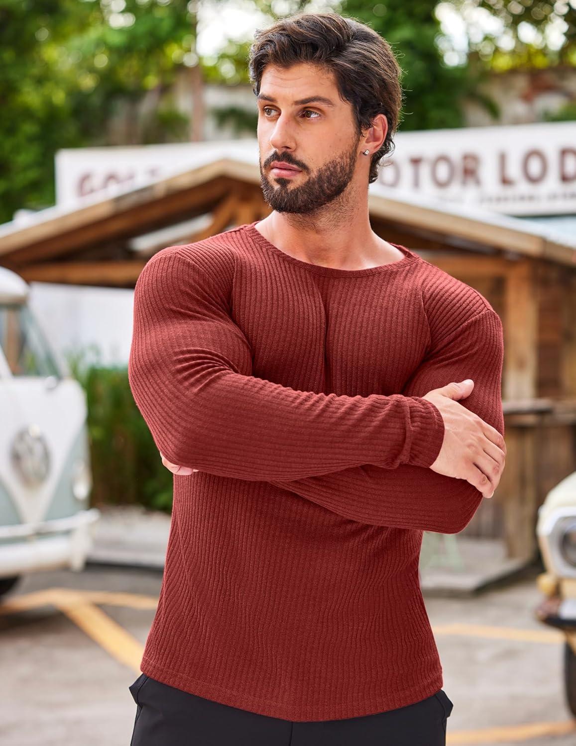 COOFANDY Men 2 Pack Muscle Fitted T Shirt Gym Workout Athletic Long Sleeves Tee(Dark Gery and Brown)