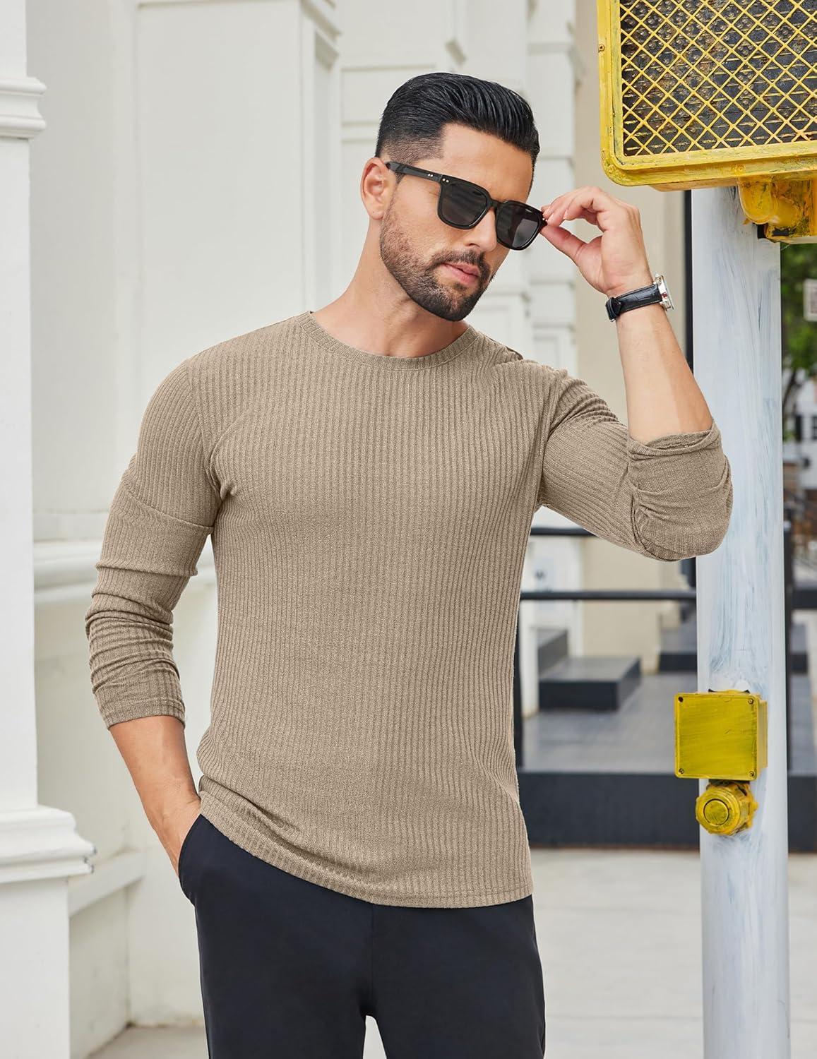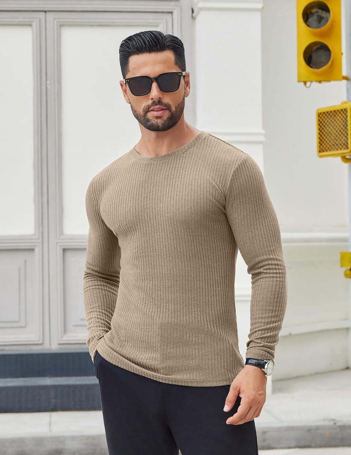 COOFANDY Men 2 Pack Muscle Fitted T Shirt Gym Workout Athletic Long Sleeves Tee(Black/Khaki)