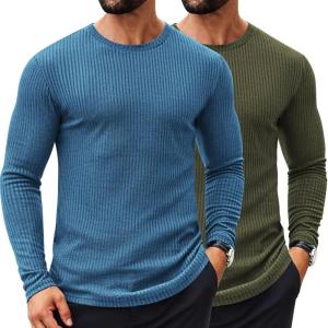 COOFANDY Men’s 2 Pack Muscle T-Shirt Stretch Long Sleeve Gym Workout Bodybuilding Training Tee Shirts Casual Hipster Tops(A-blue/Army Green)