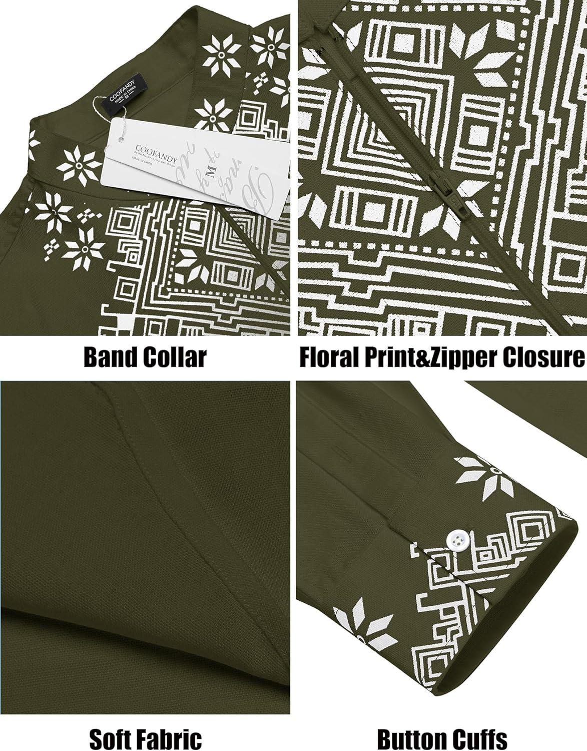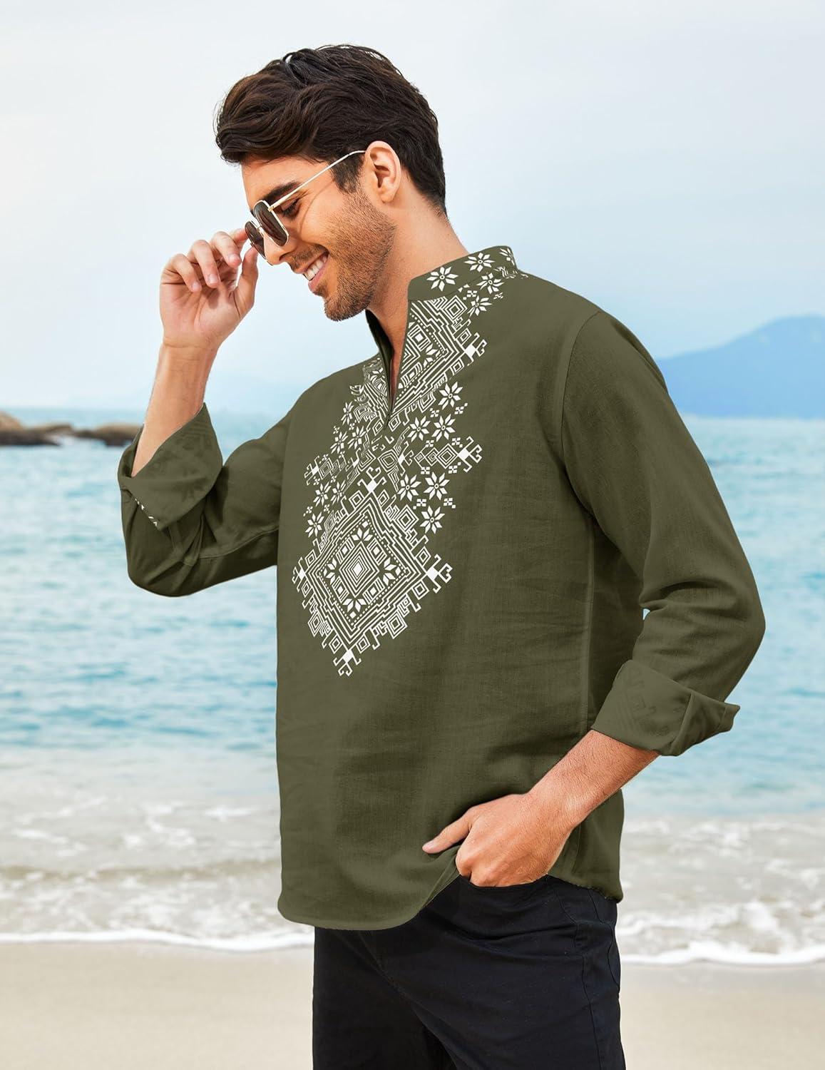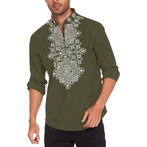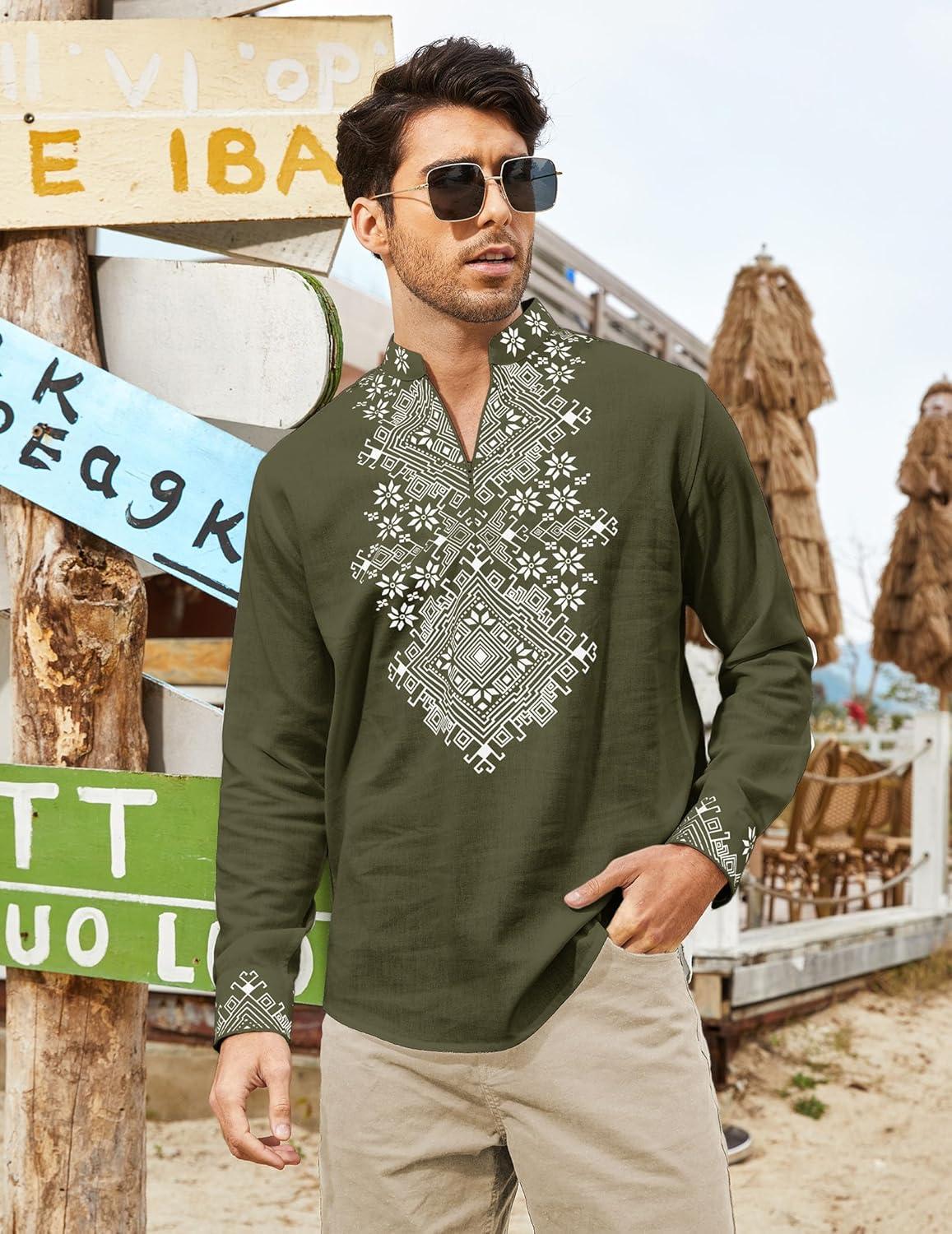 COOFANDY Men’s Henley Shirt Vyshyvanka Long Sleeve African Print Shirts Casual Zip Up Cotton Linen Beach Hippie Shirt(Army Green)