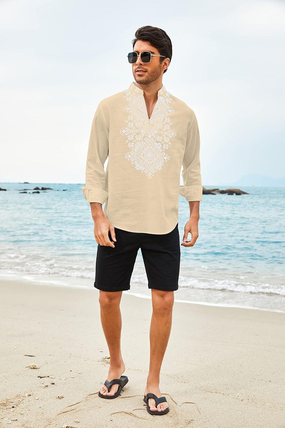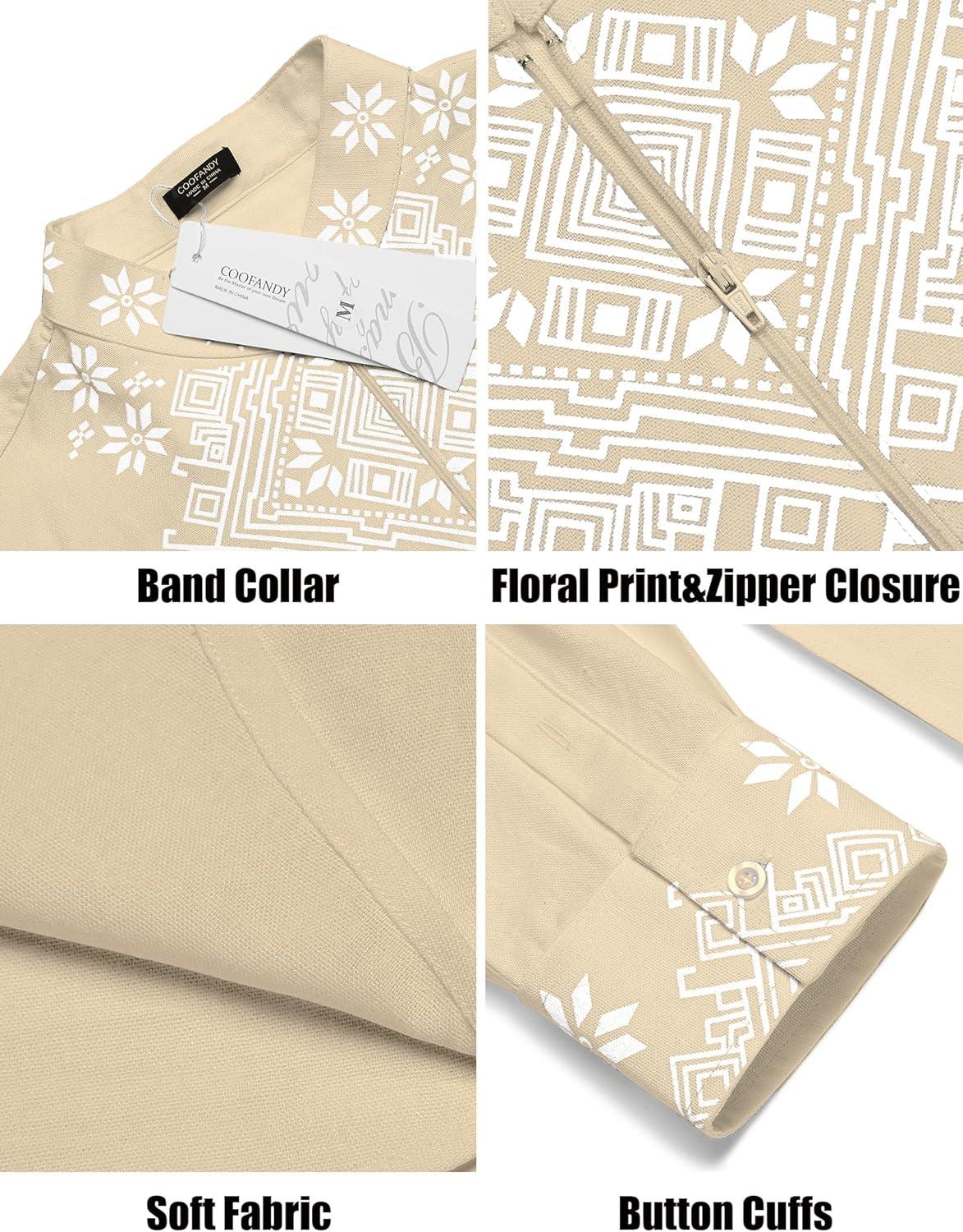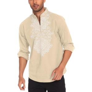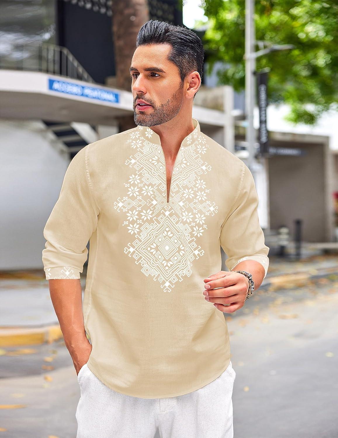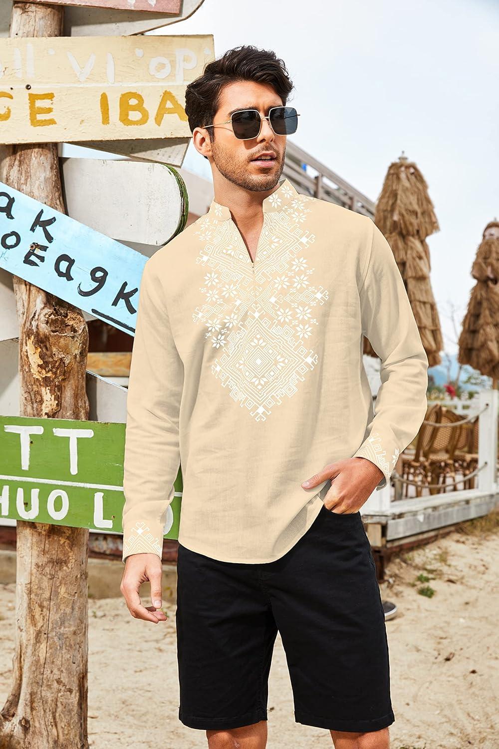 COOFANDY Men’s Henley Shirt Vyshyvanka Long Sleeve African Print Shirts Casual Zip Up Cotton Linen Beach Hippie Shirt(Beige)