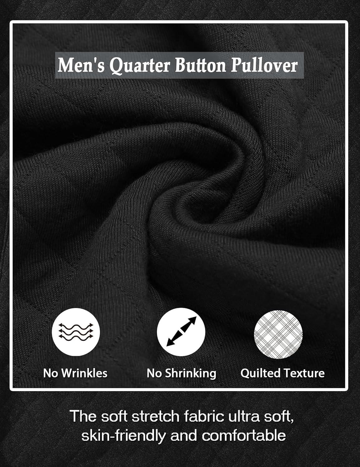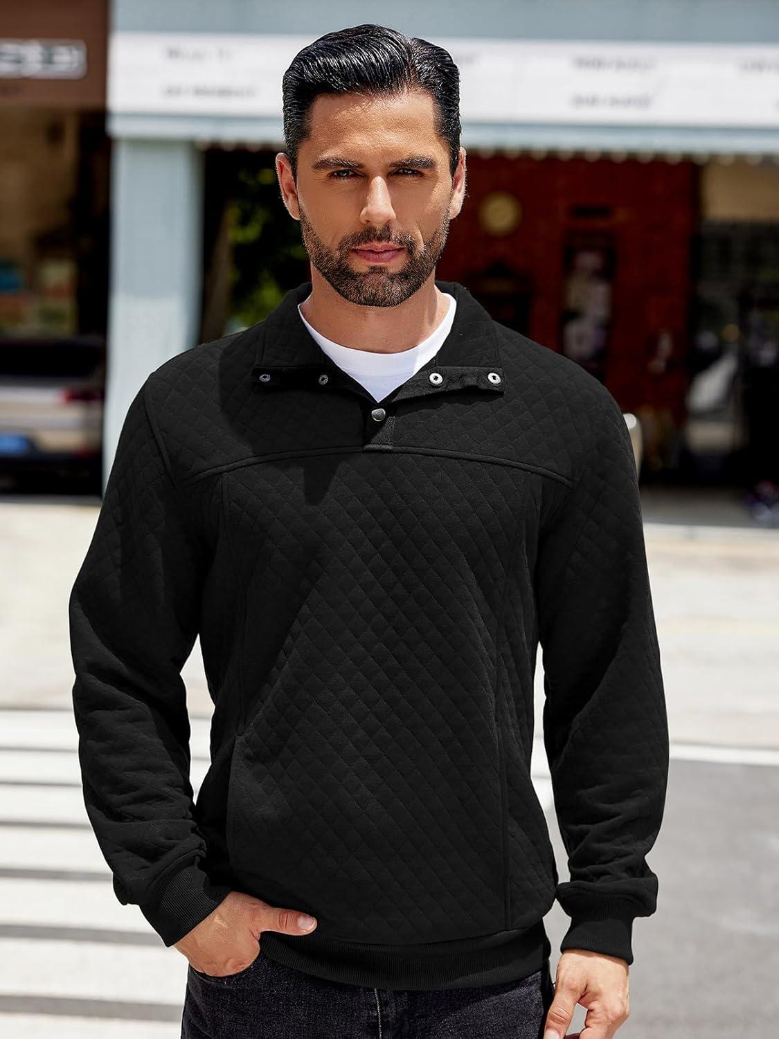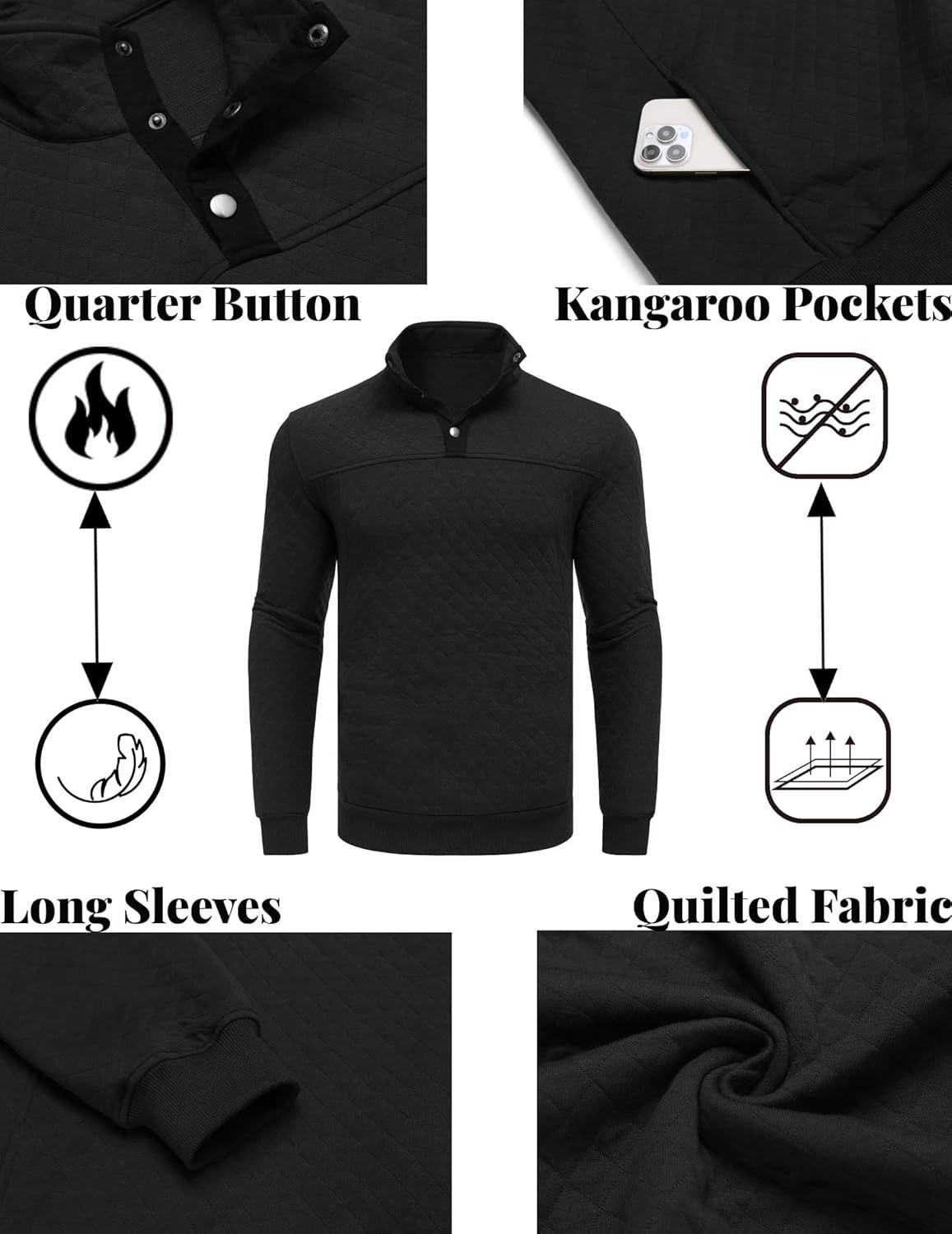 COOFANDY Mens Quarter Sweatshirt Quilted Long Sleeve Mock Neck Active Sweater Waffle Pullover Polo Shirts With Pockets(Black)