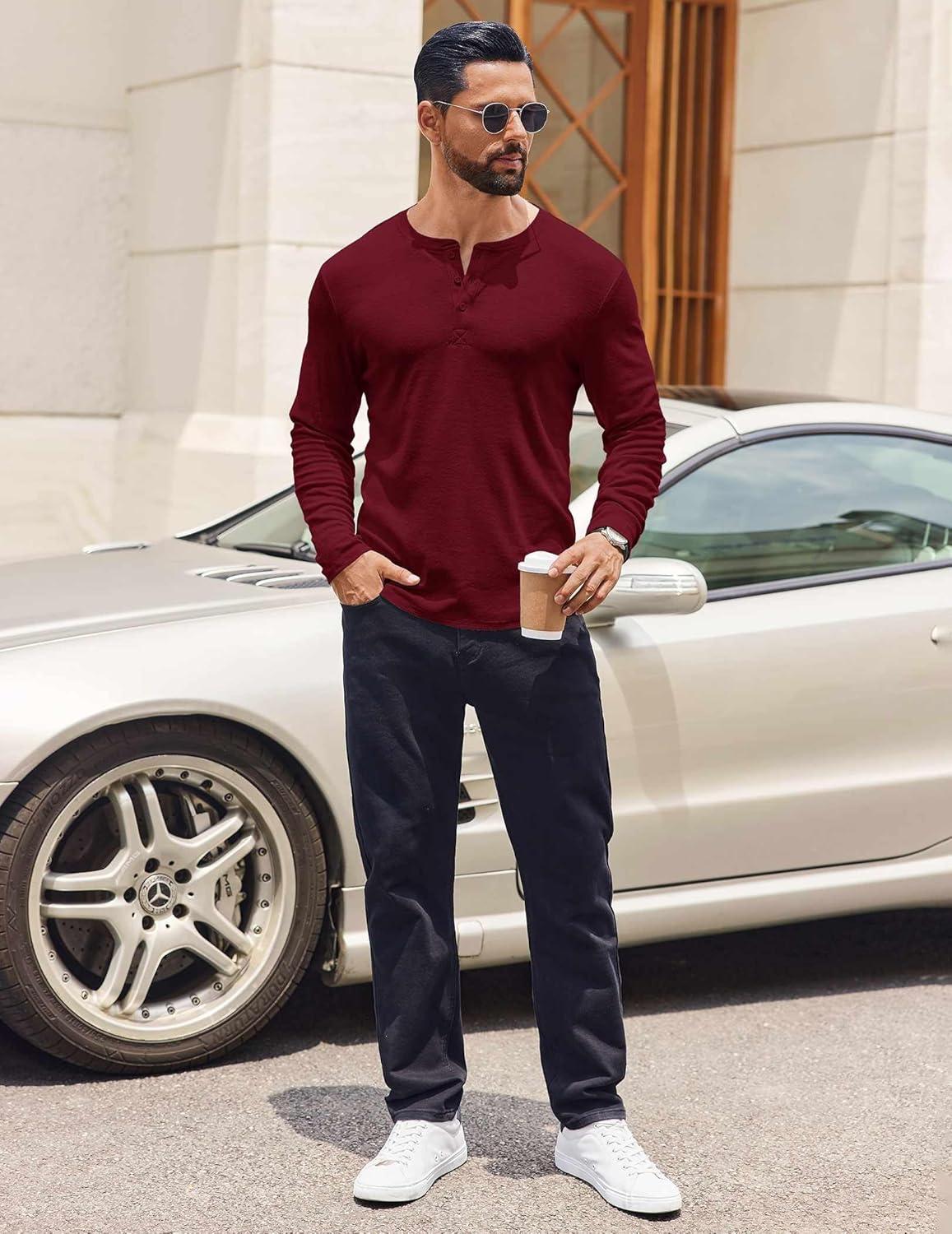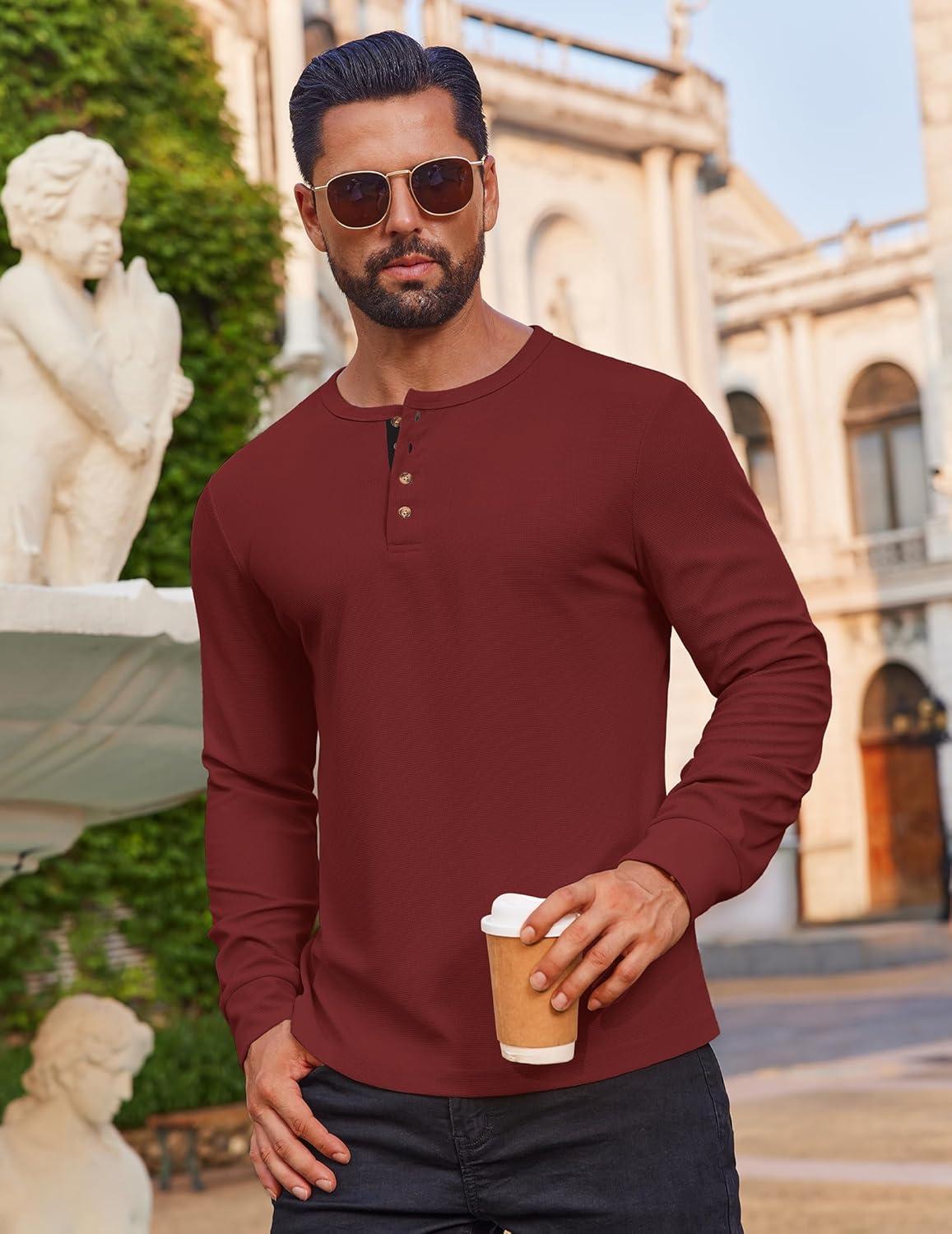 COOFANDY Mens Henley Shirts Long Sleeve Casual Pullover Shirt Fashion Button T-Shirt(Wine Red)
