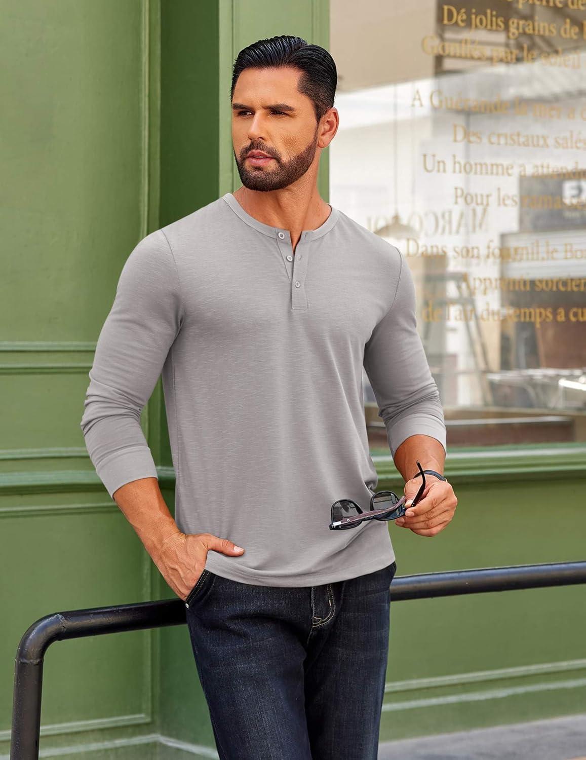 COOFANDY Men’s Long Sleeve Henley Shirts Cotton T-Shirts Casual Pullover Shirt Soft Stretch Basic Tees Fall Tops(Light Grey)