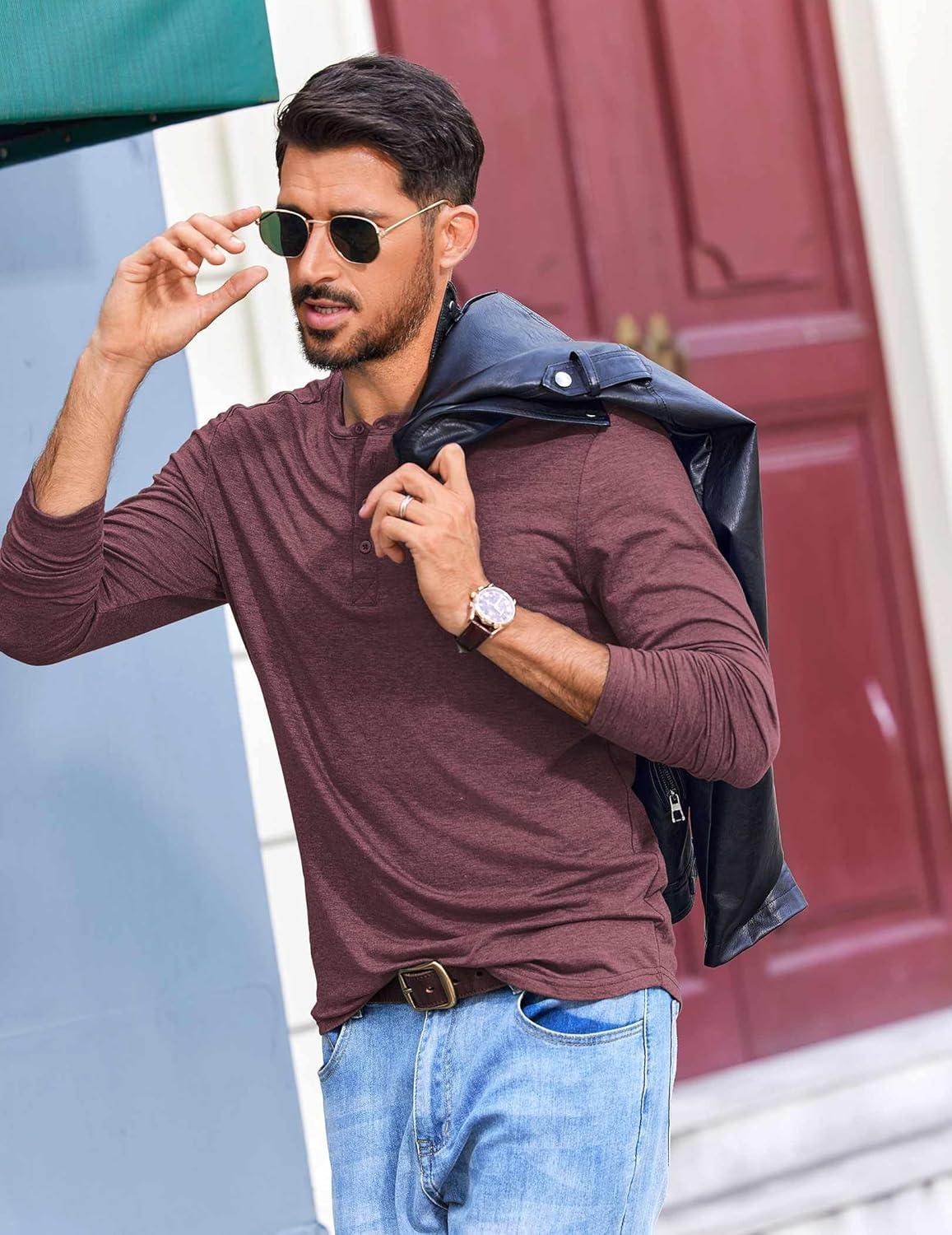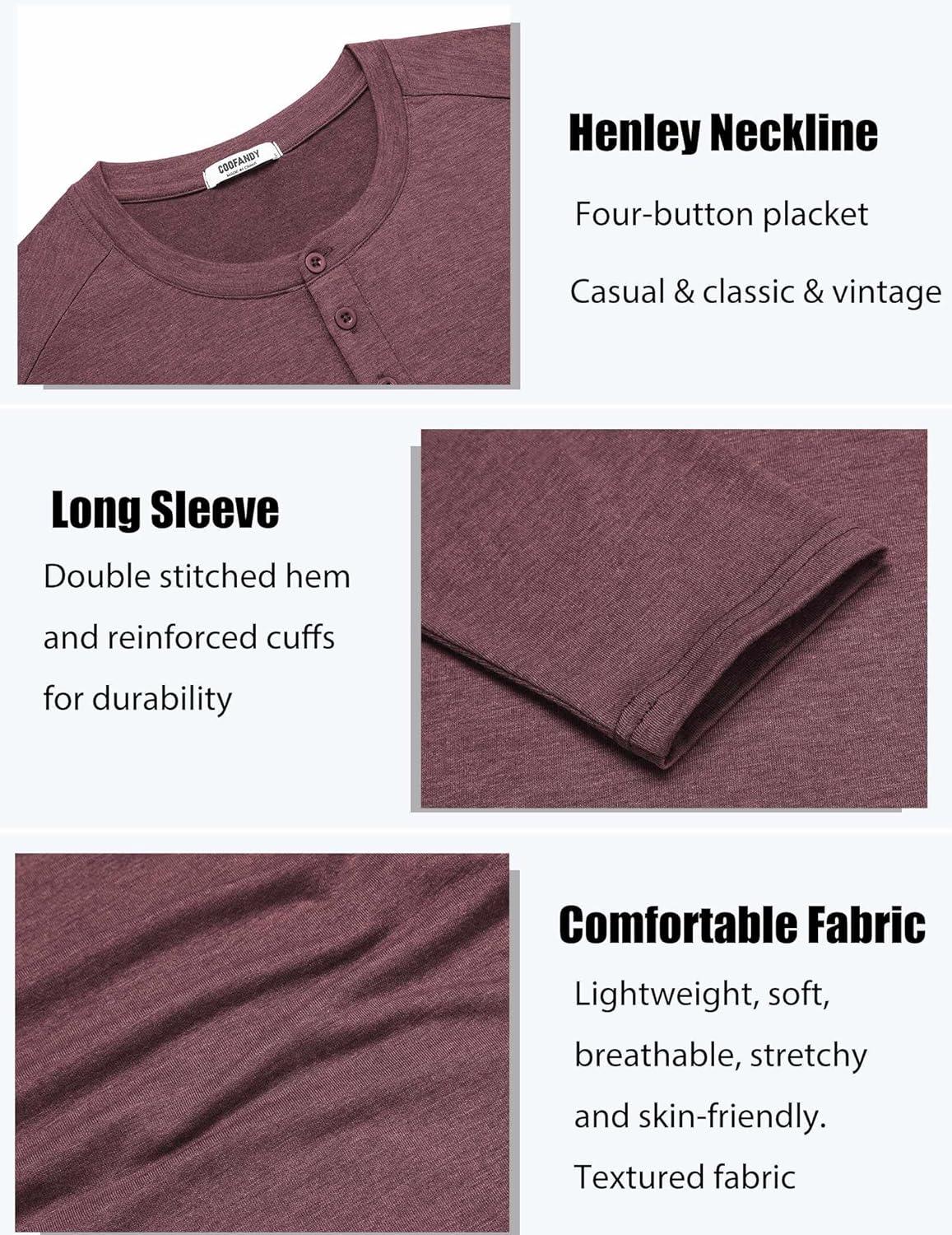 COOFANDY Mens Henley Shirts Long Sleeve T Shirts Casual Lightweight Fashion Button Pullover Tee Shirt(Wine Red)