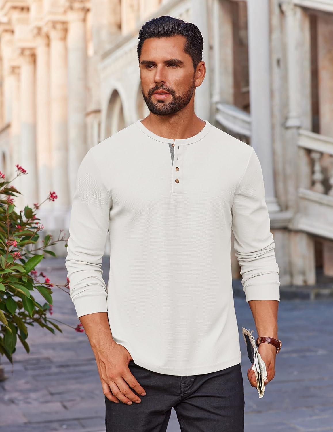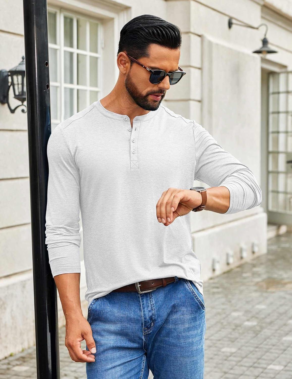 COOFANDY Mens Henley Shirts Long Sleeve Casual Pullover Shirt Fashion Button T-Shirt(White)