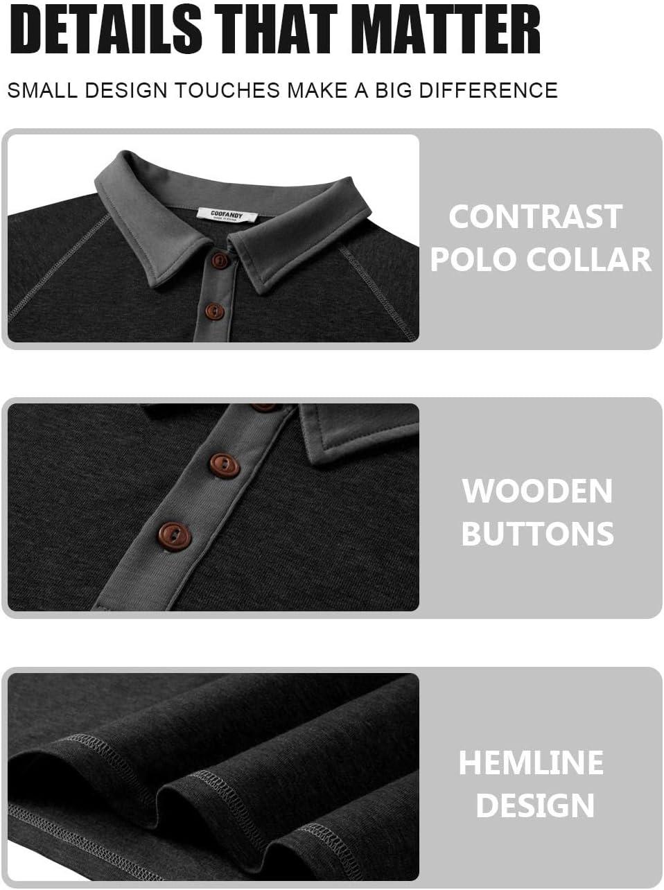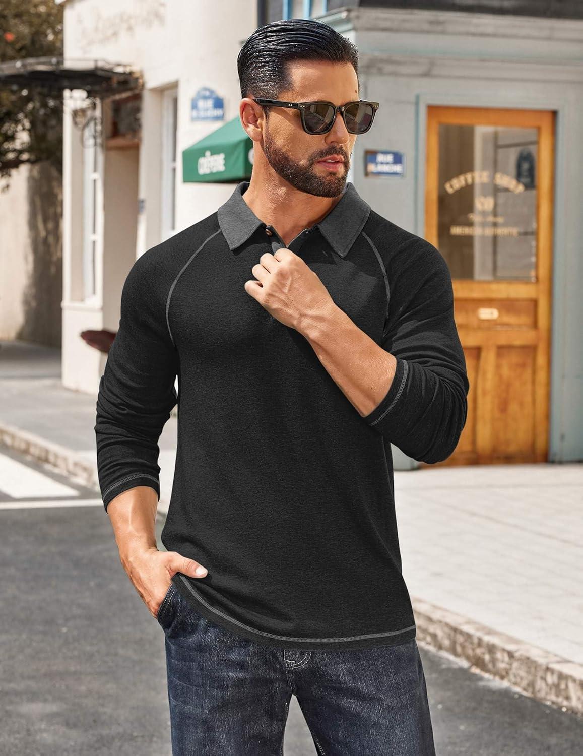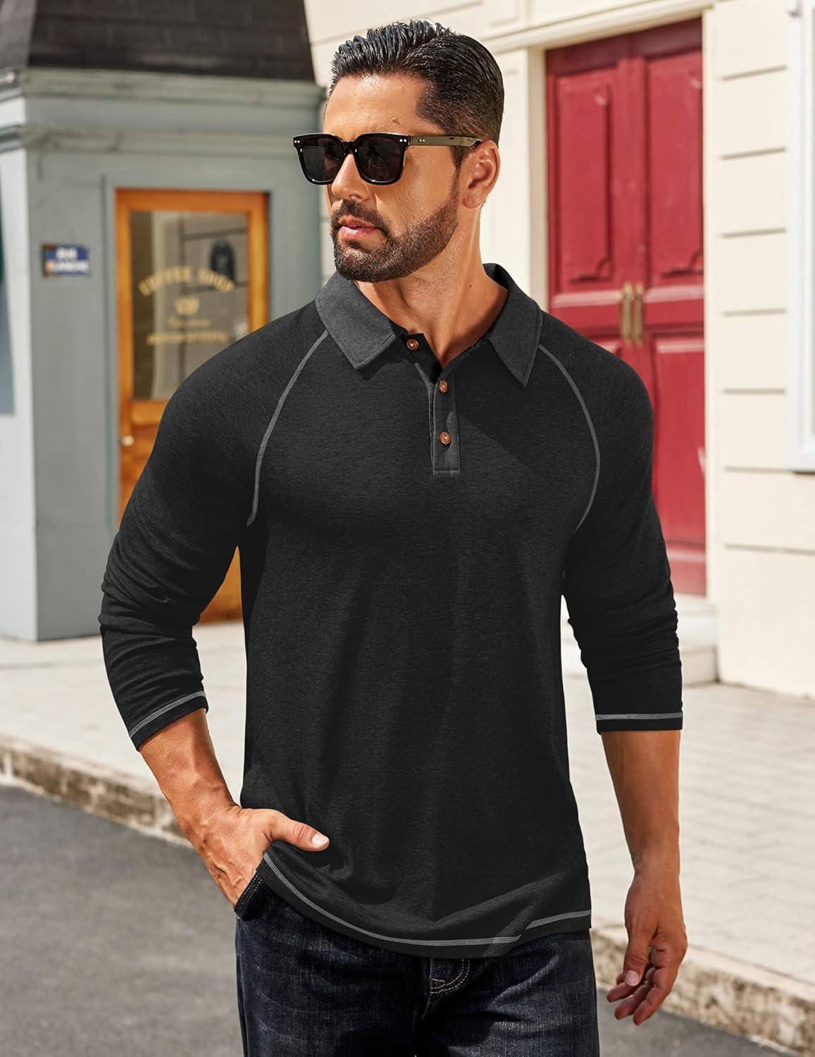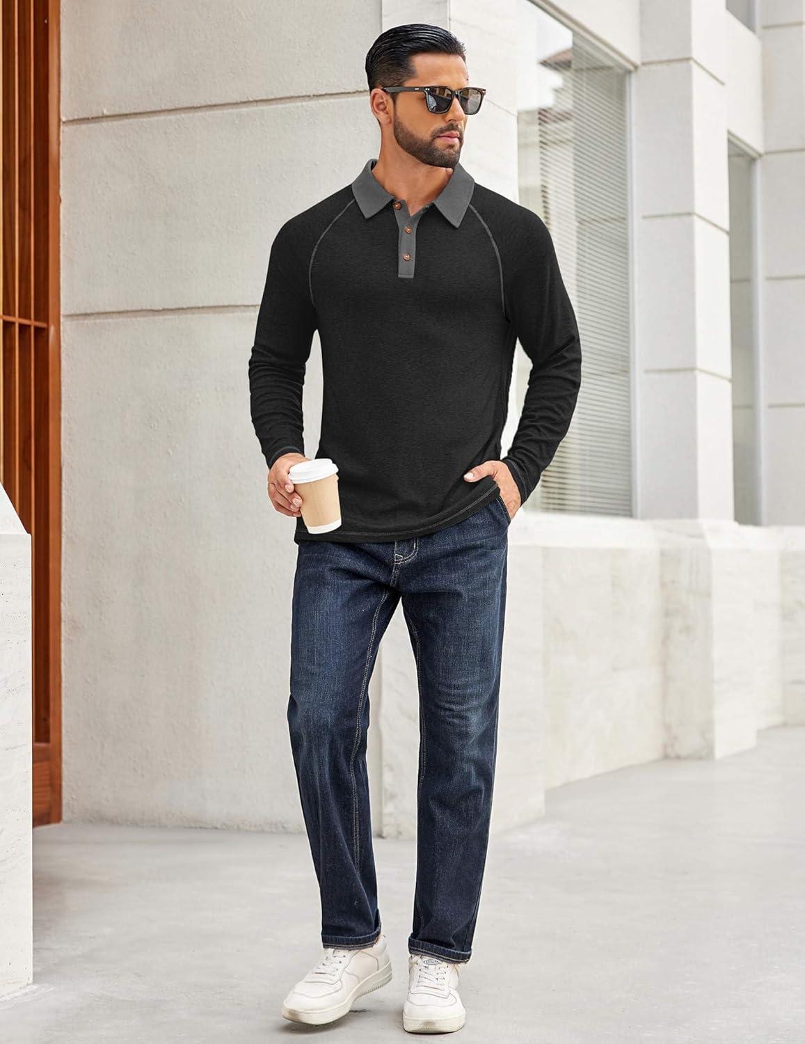COOFANDY Mens Long Sleeve Polo Shirts Casual Button Collared Shirts Raglan Golf T Shirt(Black)