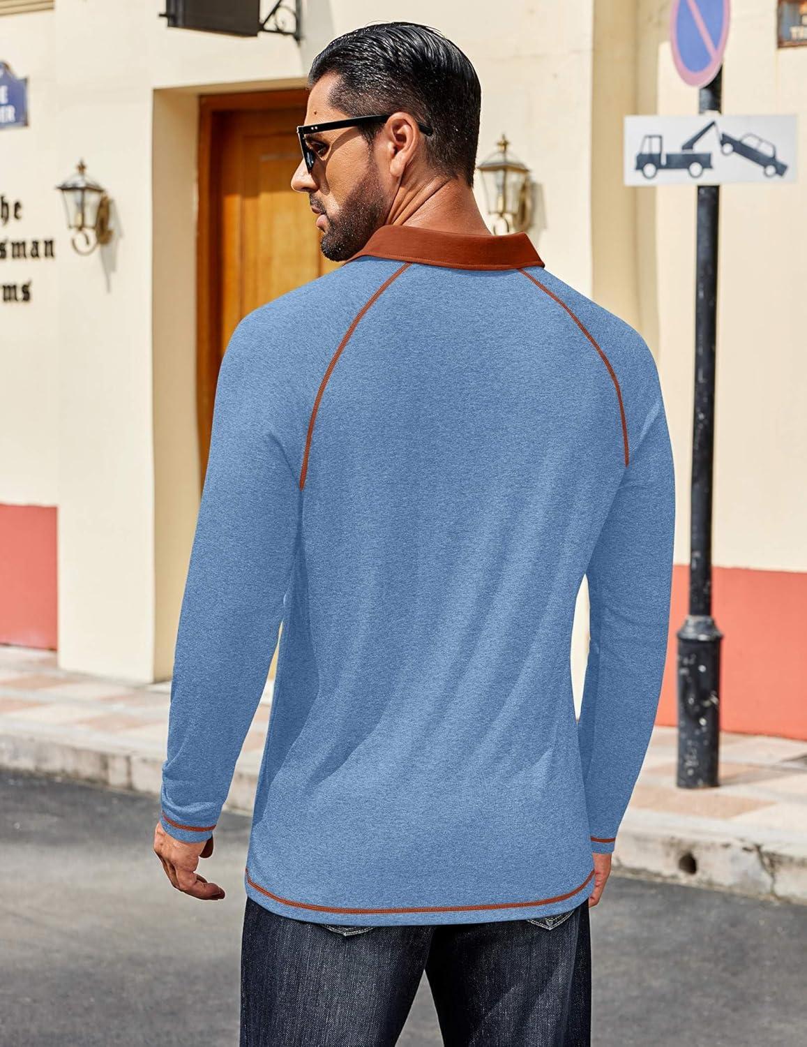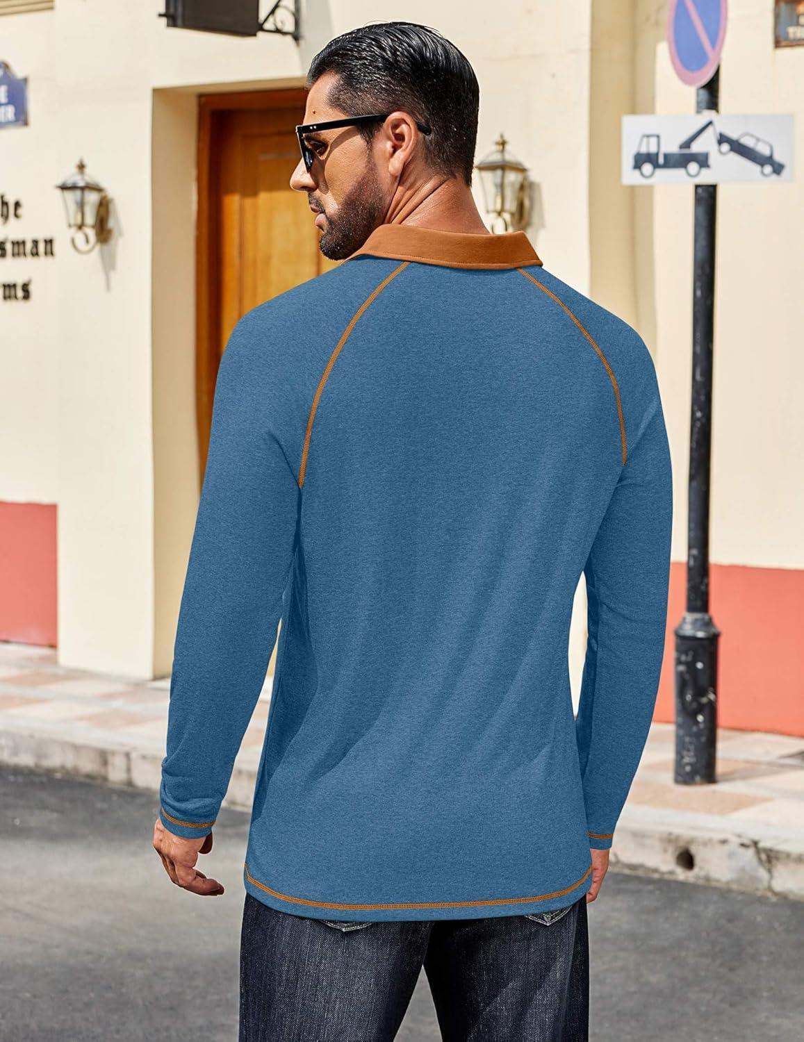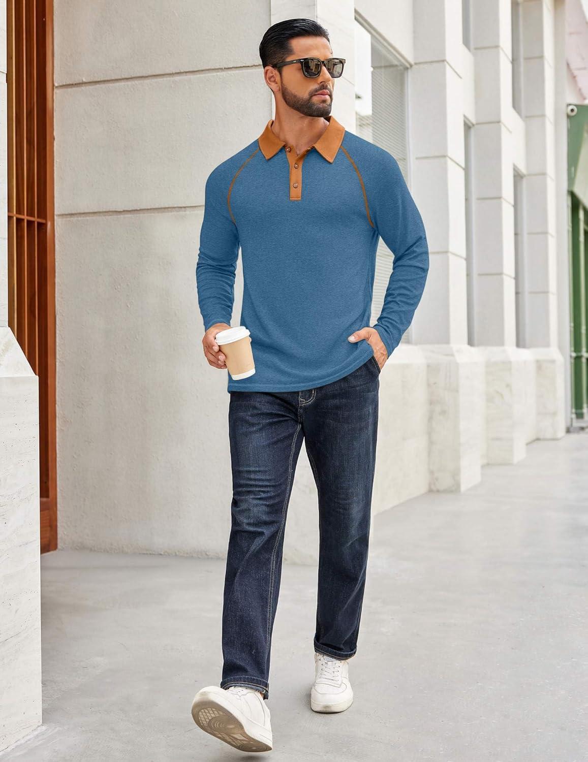 COOFANDY Mens Long Sleeve Polo Shirts Casual Button Collared Shirts Raglan Golf T Shirt(Denim Blue)