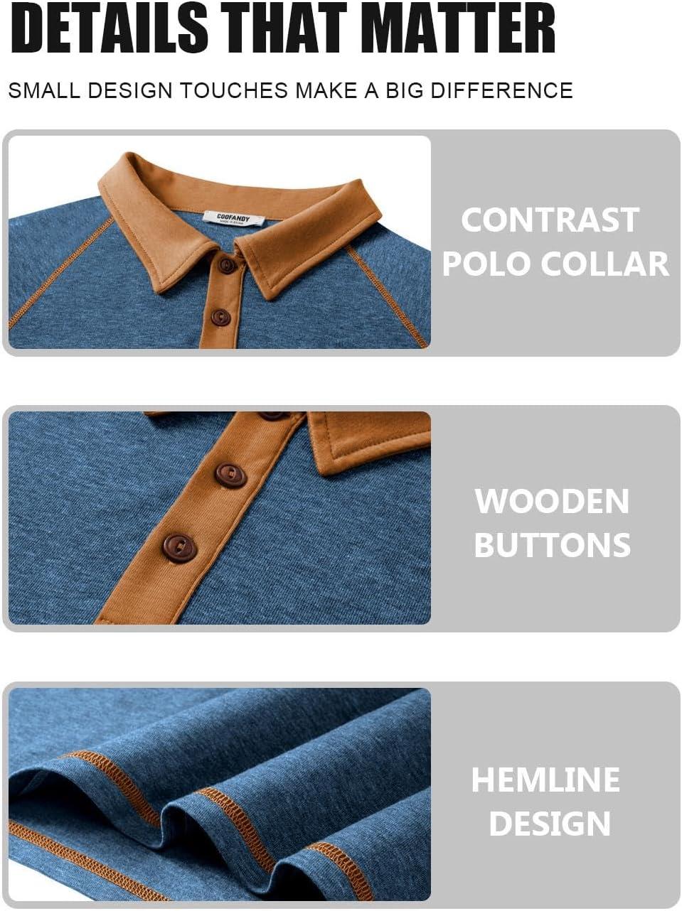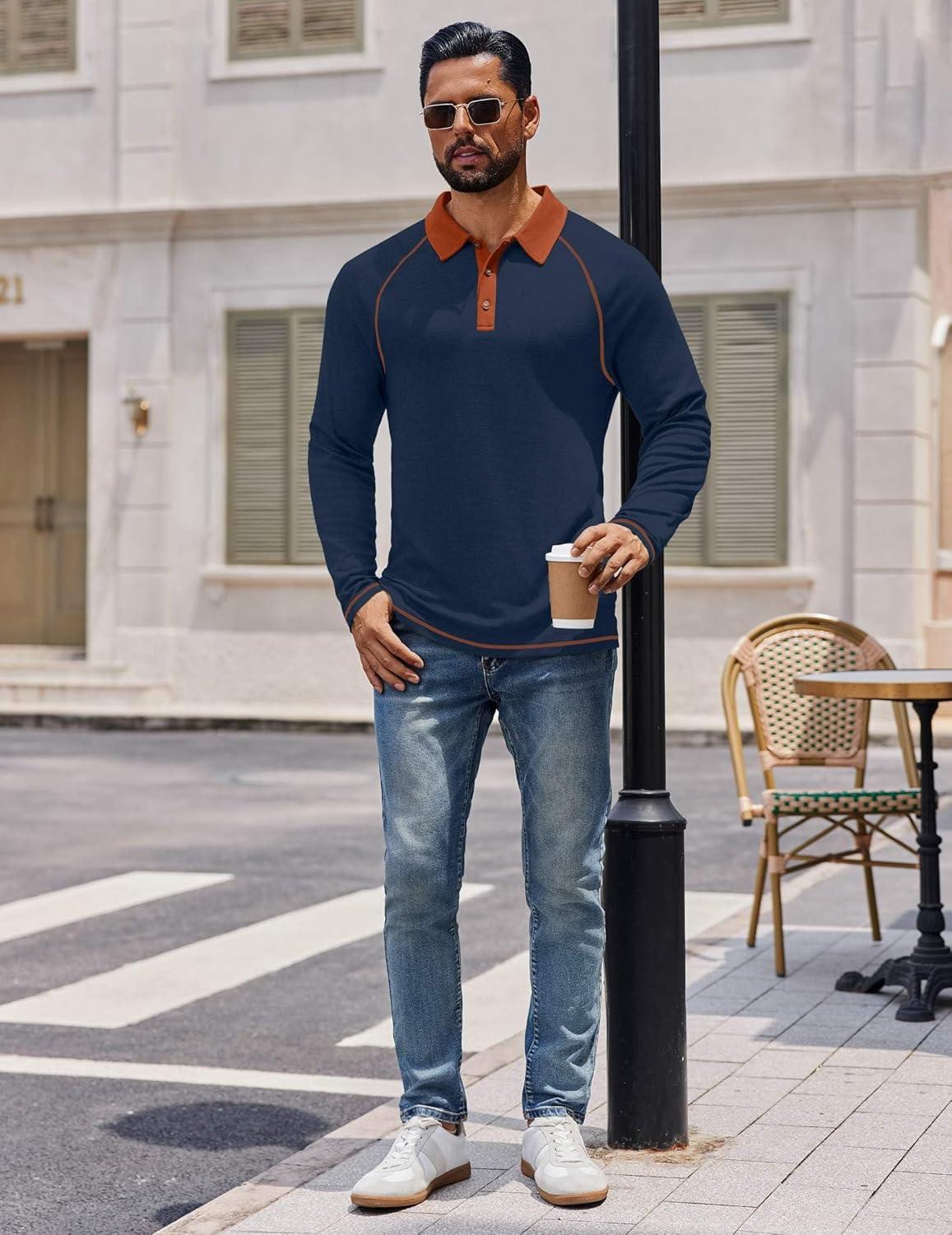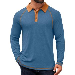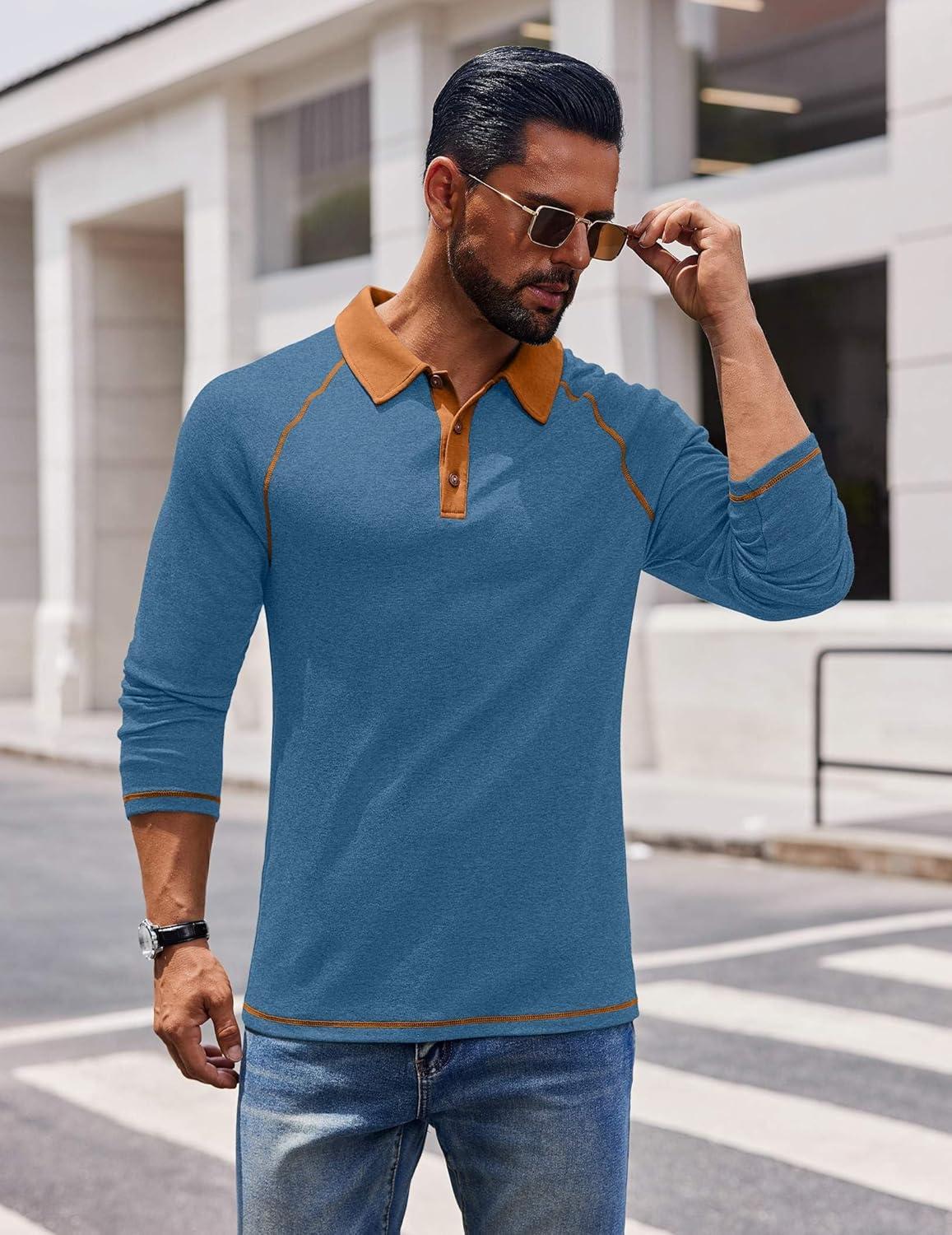 COOFANDY Mens Long Sleeve Polo Shirts Casual Button Collared Shirts Raglan Golf T Shirt(Denim Blue)