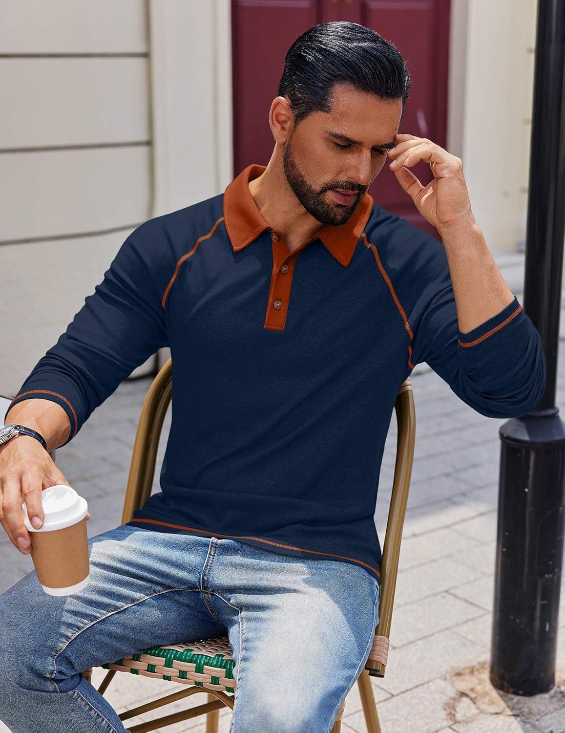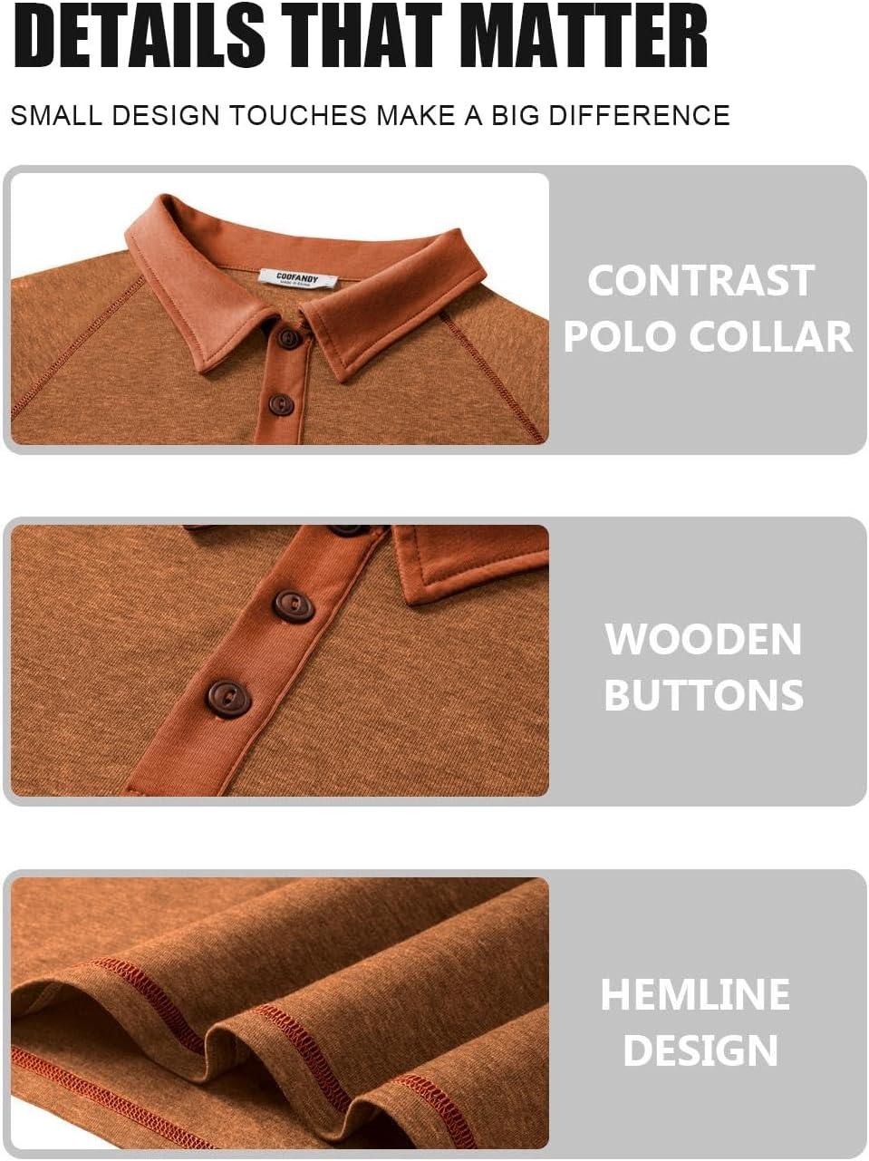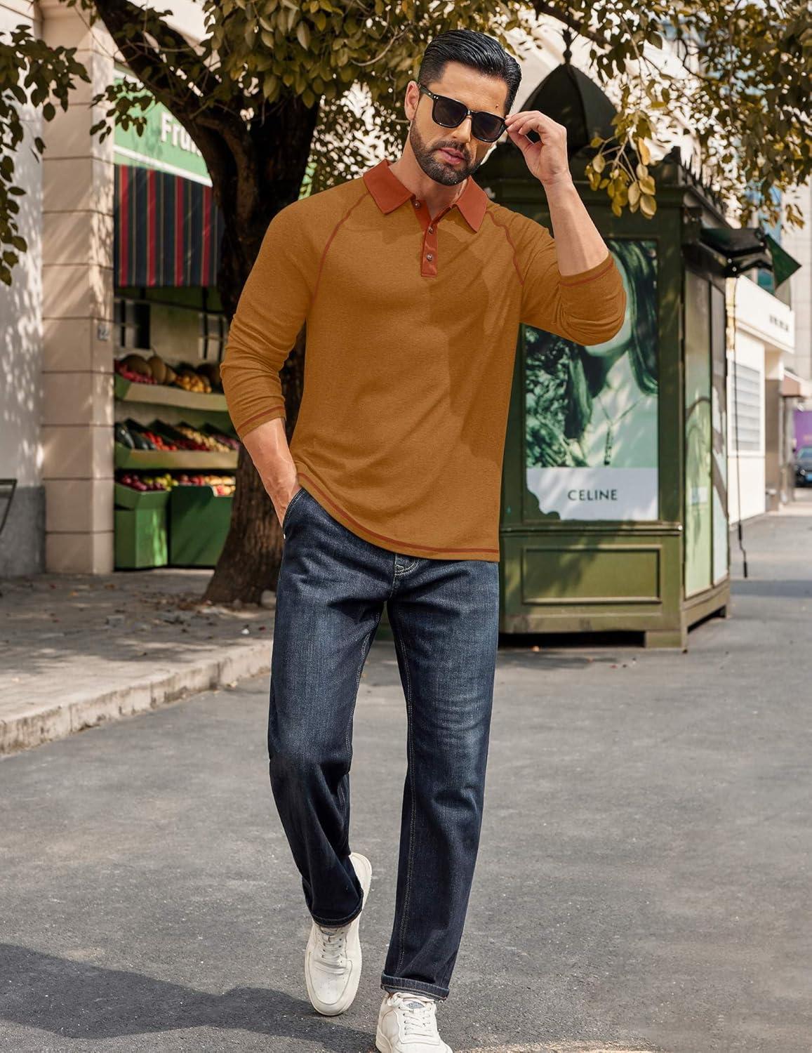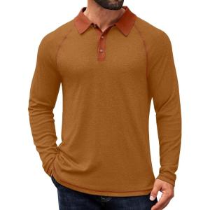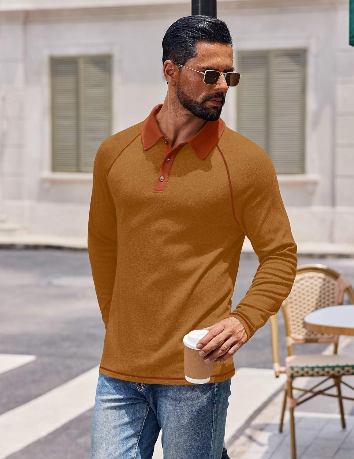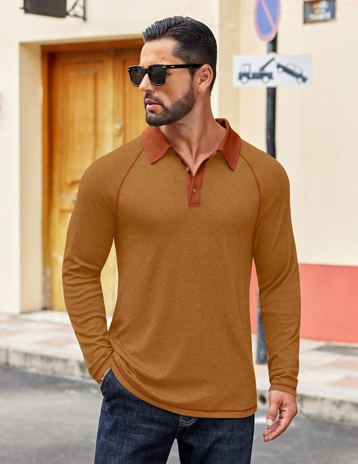 COOFANDY Mens Long Sleeve Polo Shirts Casual Button Collared Shirts Raglan Golf T Shirt(Brown)